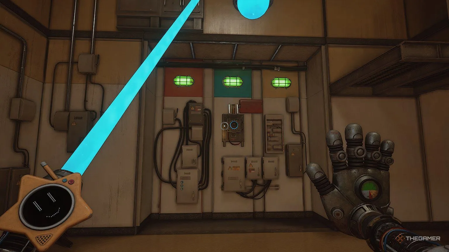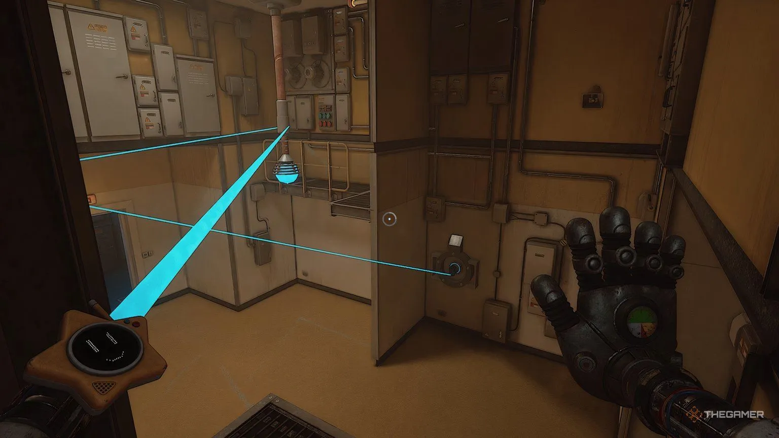 В комнате за синей дверью откройте все жёлтые панели на стене, чтобы обнаружить три точки, требующие питания, и один источник энергии для вашей Проводящей руки. Приложите руку к источнику энергии, а затем к одной из других панелей, чтобы запитать её.