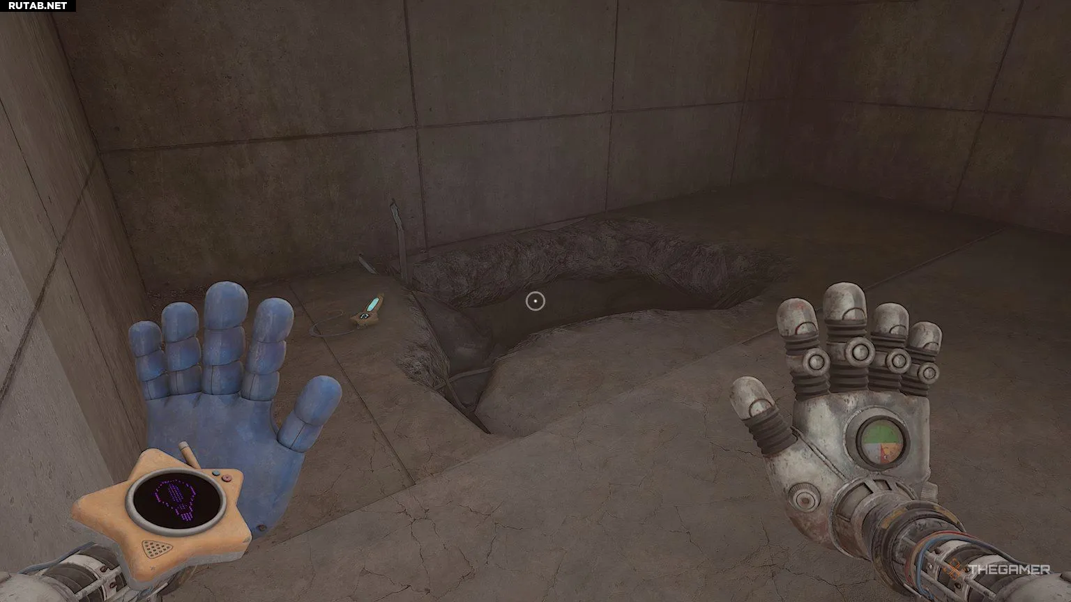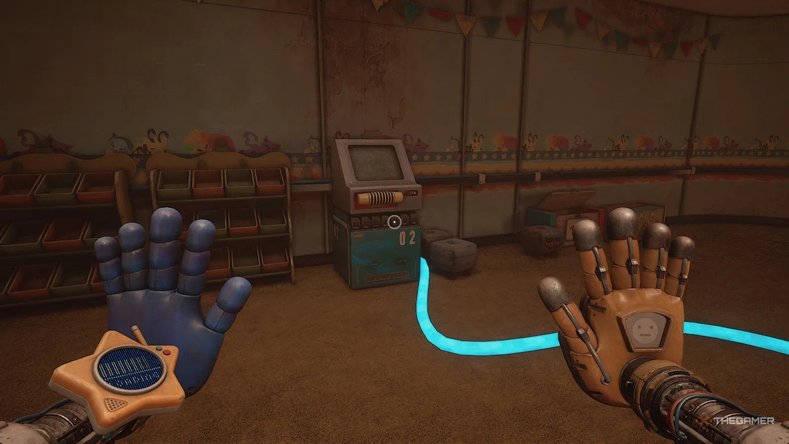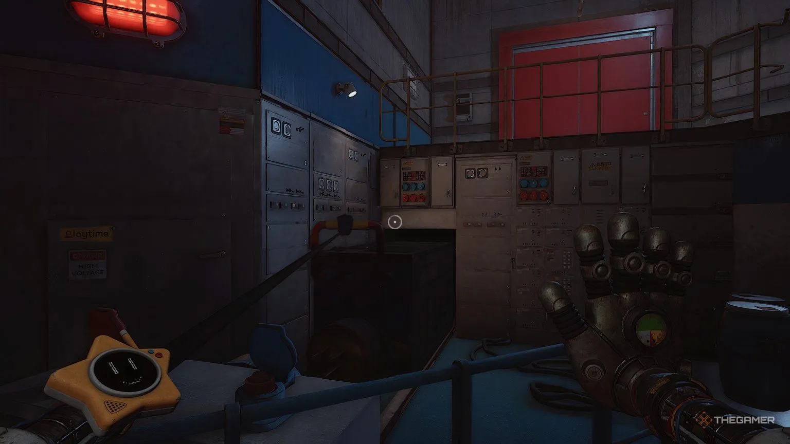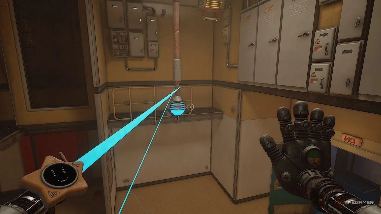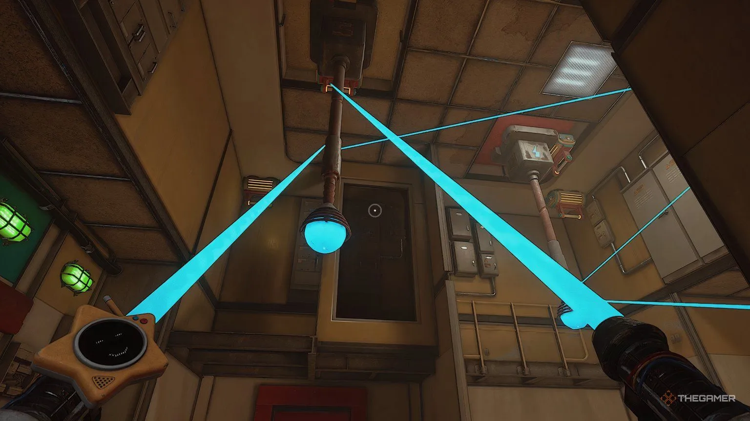 Когда обе батареи будут на месте, используйте синюю руку на рукоятке между двумя разъёмами для батарей. Ваша синяя рука должна начать светиться голубой энергией. Теперь ваша цель — зарядить вторую рукоятку в комнате, чтобы при ударе по ней другой рукой произошла перегрузка.