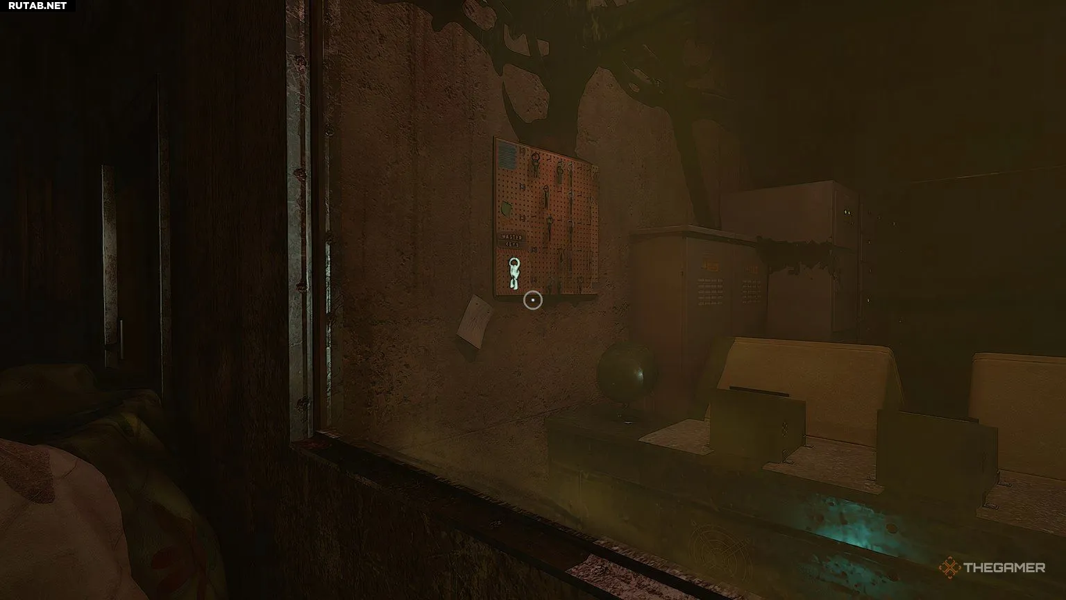 Отсюда просто пригнитесь и пробирайтесь по коридору, пока не дойдёте до единственной двери, которая откроется. Она приведёт вас в комнату с небольшим офисом, где находится ключ. Подберите ключ, чтобы выполнить текущую задачу. Ключи, которые вы находите, — это главные ключи, открывающие ранее недоступные двери.