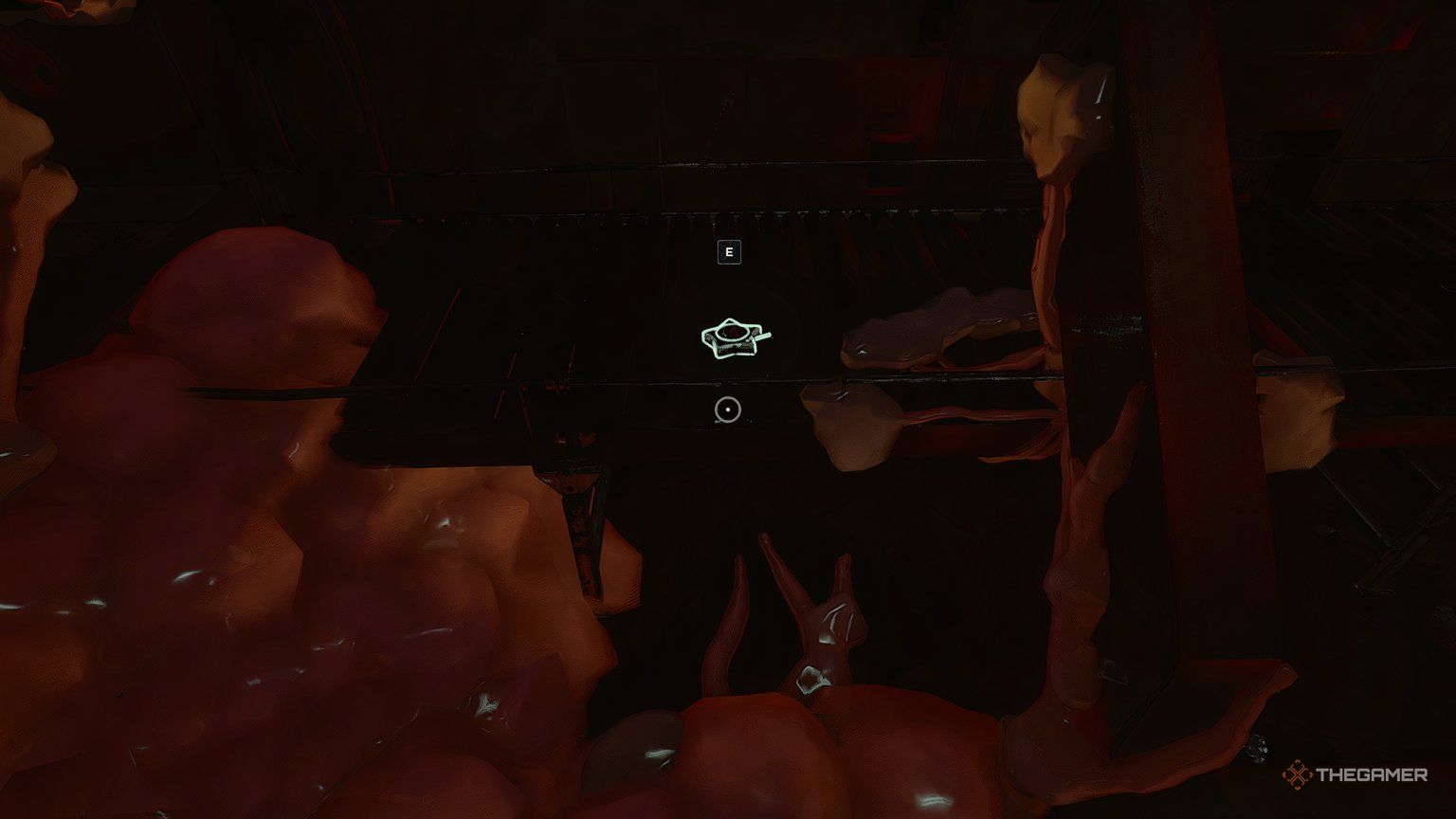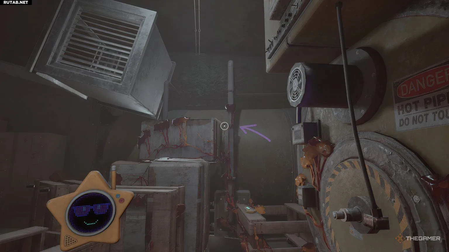 Вы можете взорвать нарост, а затем использовать Давящую руку, чтобы отодвинуть ящик, преграждающий путь, но пока не идите туда. Вернитесь по ступенькам назад, и в одной из растительных зон вы увидите вентиляционную решётку, которую можно сломать. Чтобы добраться до неё, используйте разбитое стекло сбоку. Сломав решётку, пролезьте внутрь, чтобы попасть в скрытую комнату.