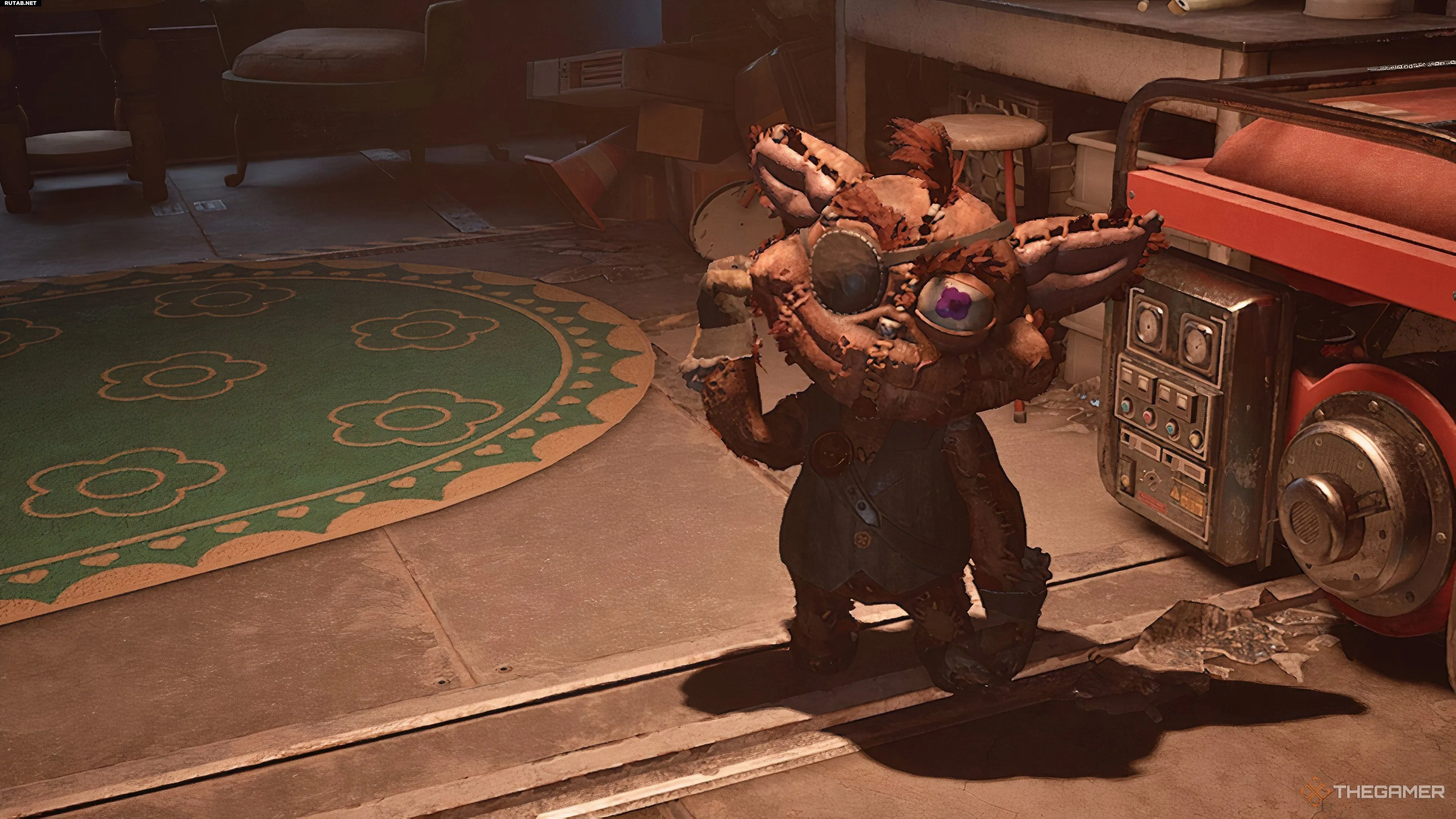 Когда вы доберётесь до проёма с трубами, светящаяся стрелка укажет вам налево, вверх по коробкам и в вентиляцию, но прежде чем сделать это, сверните направо. Вы обойдёте небольшую зону, где на тележке, преграждающей путь, будет сидеть плюшевый Аутимал «Губер ГАЦ». Собрав его, вернитесь обратно и пройдите через вентиляцию.