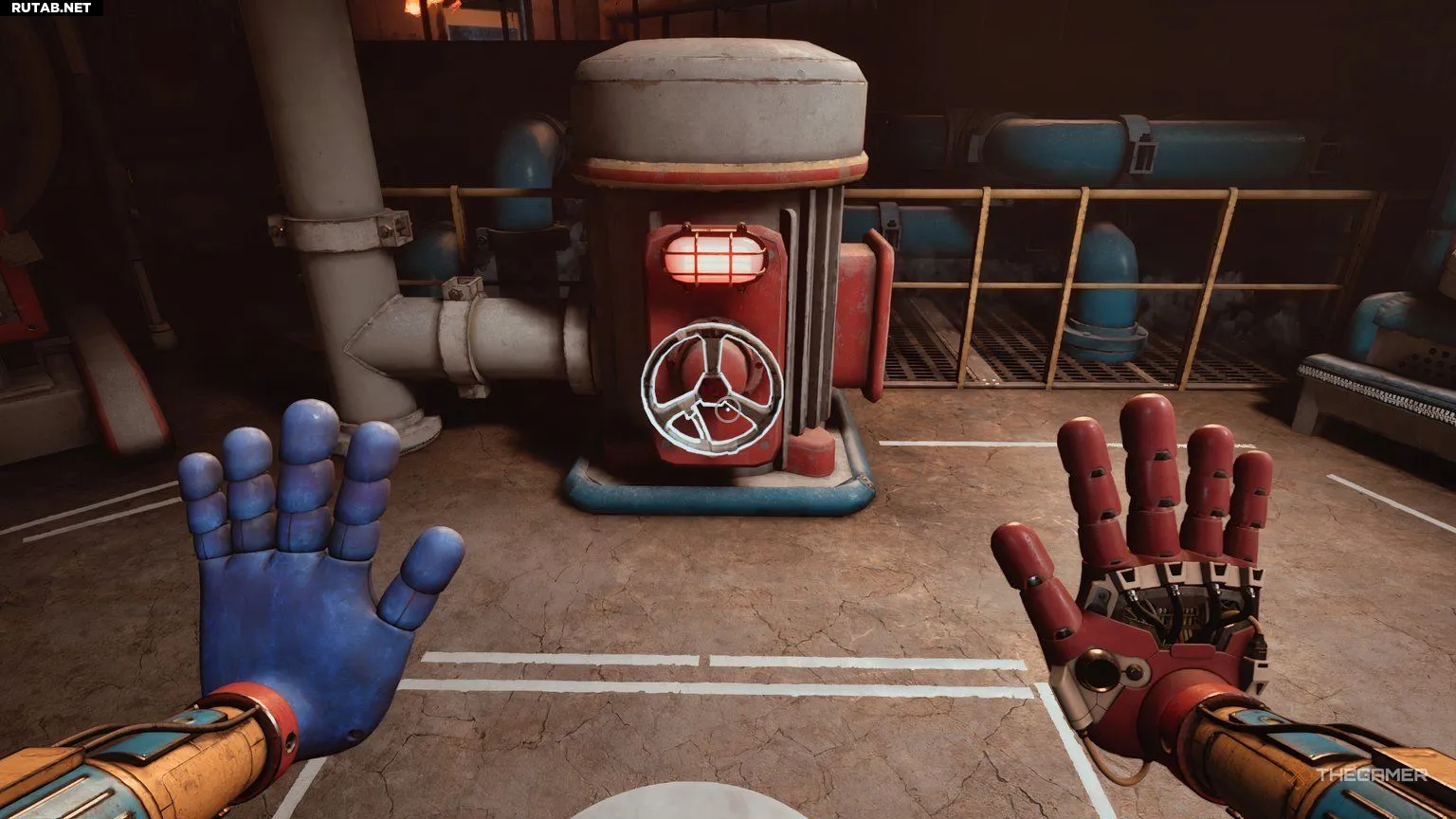 Затем возьмите одну из коробок в комнате синей и красной рукой и поставьте её под механизм, рядом с поддонами. Когда всё будет готово, подтянитесь за рукоятку над коробкой, а затем спрыгните на неё. Оттуда вы сможете запрыгнуть на поддоны и перебраться на другую сторону.