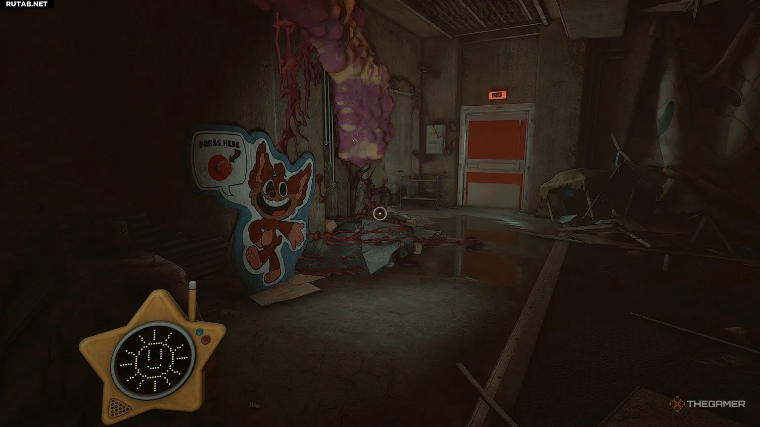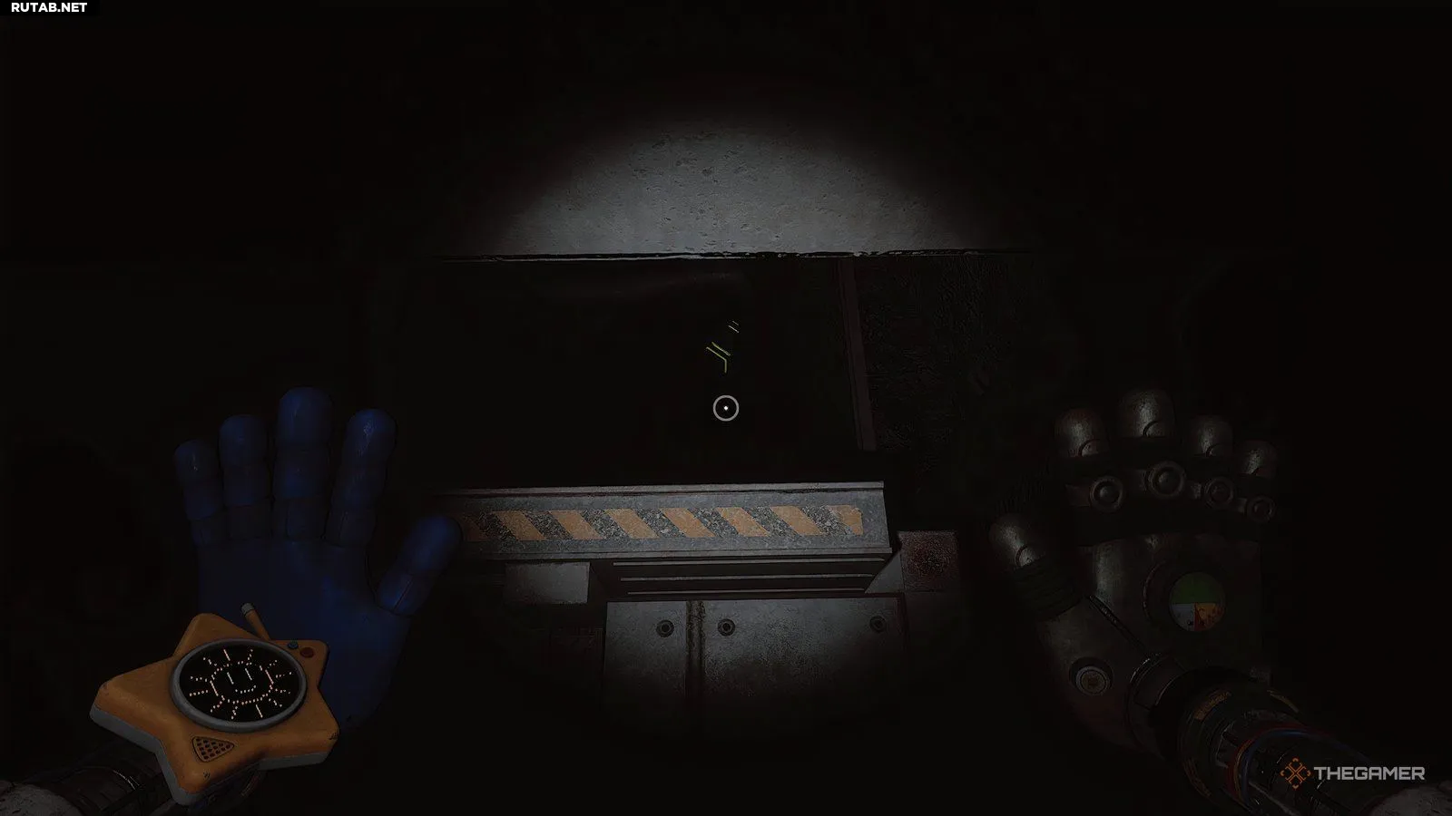 Первая комната будет подсвечена красным светом, но пройдите в заднюю комнату к дальней правой стене. Посветите на стену ультрафиолетовой лампой, и вы увидите светящийся крестик над местом, которое слишком узкое, чтобы пролезть. Чтобы это исправить, используйте руки, чтобы отодвинуть одну из тележек, преграждающих путь, и вы сможете протиснуться и забрать трофей Гиблета.