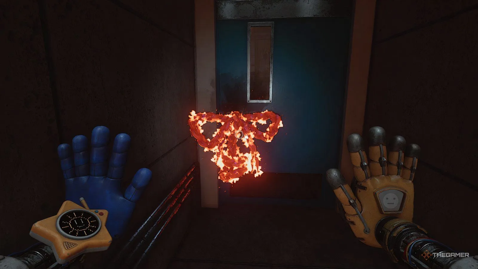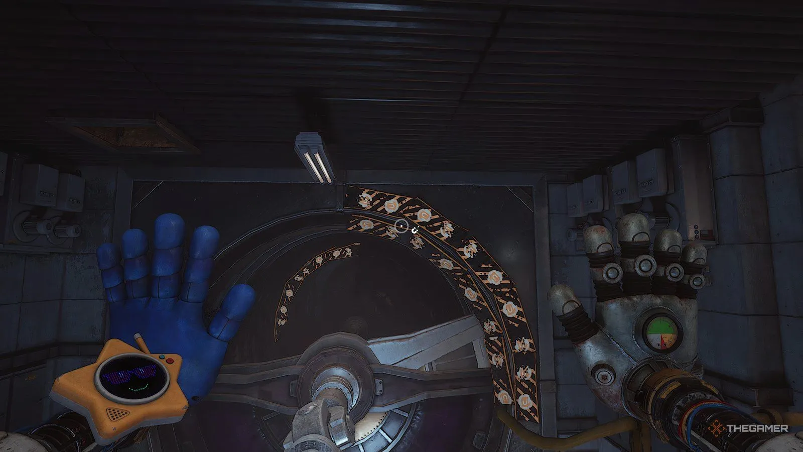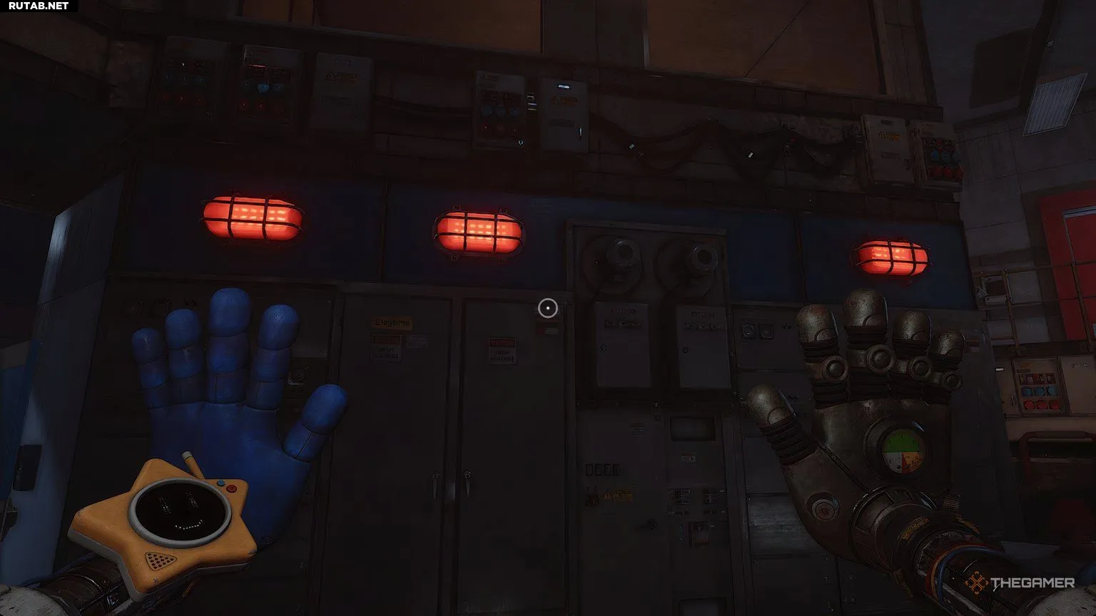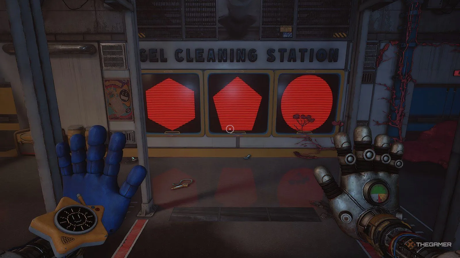 Если вы всё сделали правильно, вы окажетесь на полу, а ваша синяя рука будет обвивать все три шеста. Если все индикаторы на стене горят, ударьте правой рукой по рукоятке на этой стене с индикаторами. Это откроет дверь справа, где вы найдёте плюшевого Аутимала Биндл Бугги.