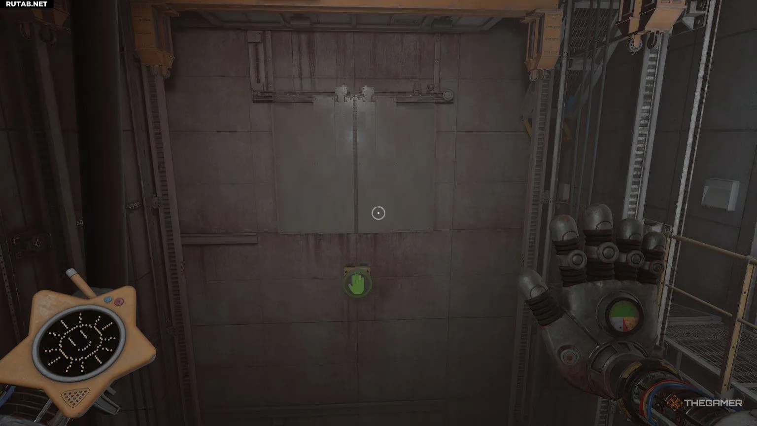 В комнате, где вы проснётесь, слева будут два лифта, а справа — резервуары. Пройдите через открытую дверь и спрыгните на крышу лифта, который находится прямо слева от вас. Стоя на лифте, вы сможете заглянуть через щели в его потолке и увидеть батарею, лежащую на полу.