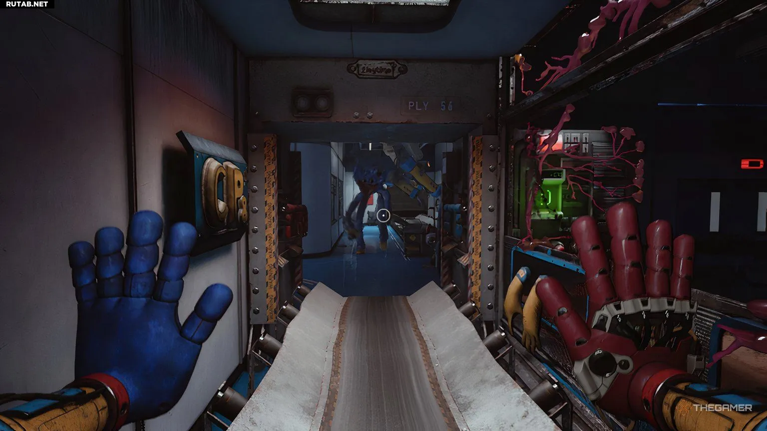 Вы доберётесь до конвейерной ленты со сканером для красной руки и пройдёте его так же, как и раньше. Вам нужно будет выполнить два последовательных сканирования, и к этому моменту вы, вероятно, увидите Хагги Вагги впереди, пробирающегося к вам. Поторопитесь, пройдите через оба шлюза и сверните налево, подальше от Хагги Вагги.