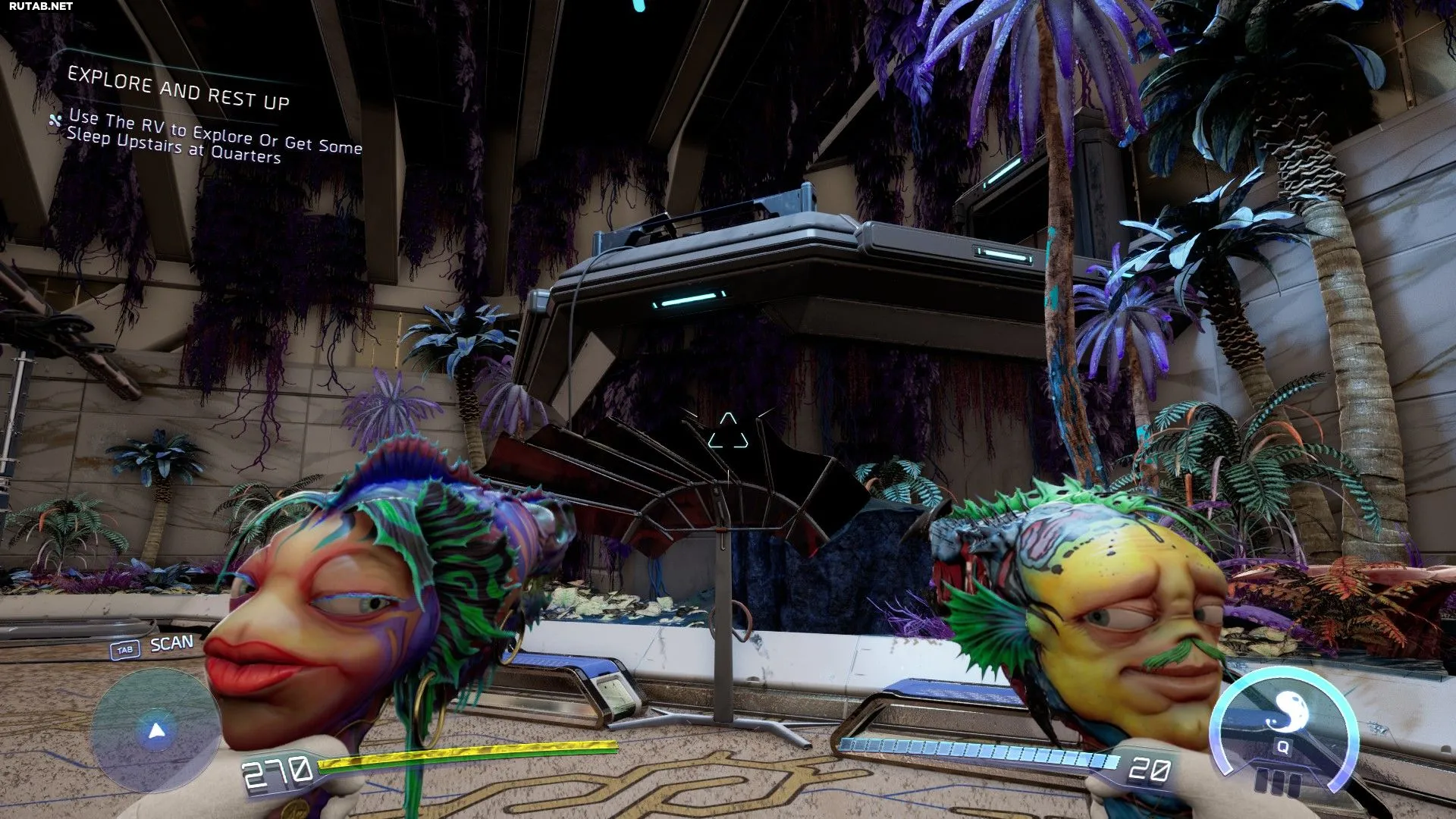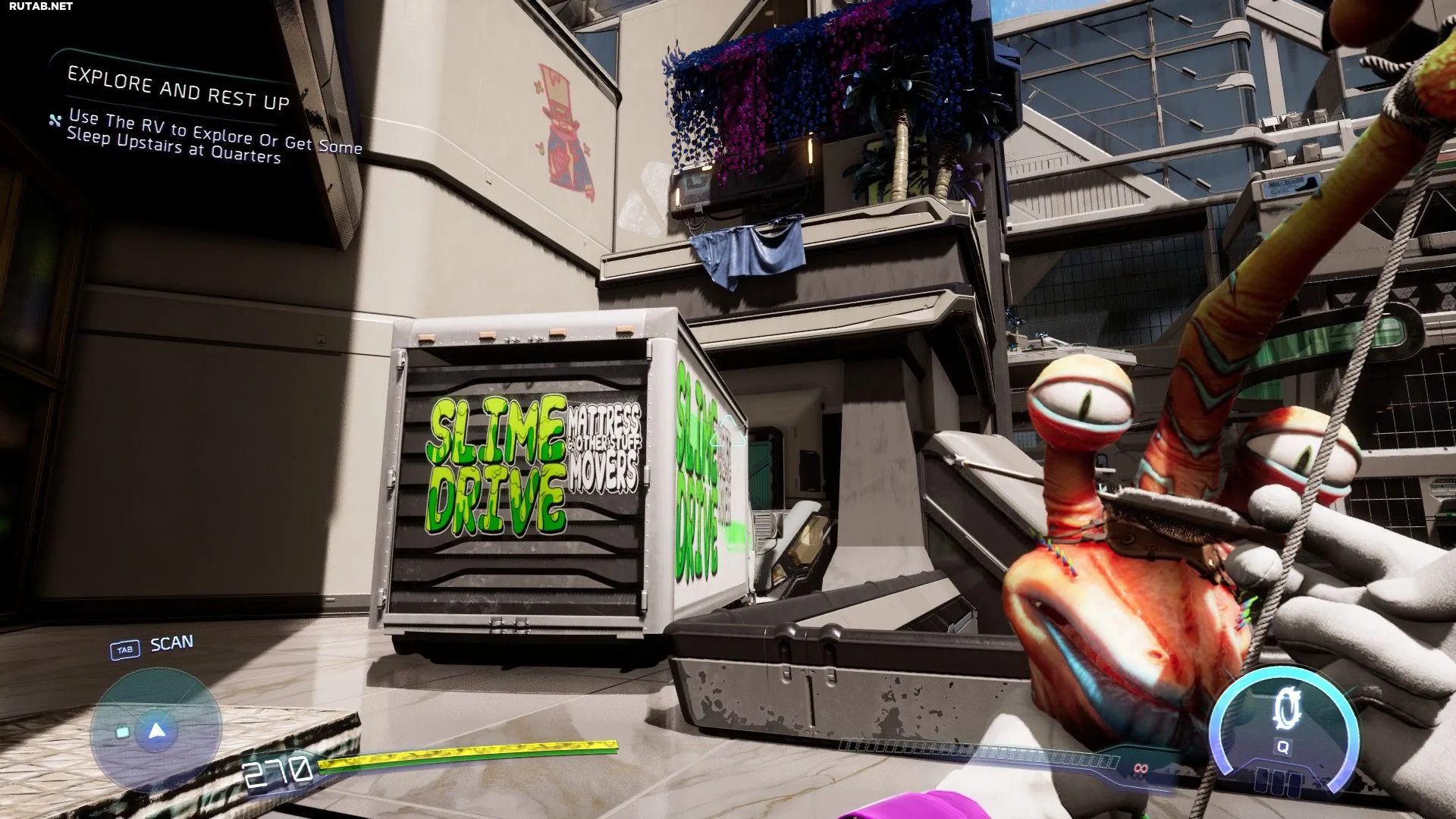 Это задание начинается с поездки в Даунтаун, в район Серкит Аркадия, и следования за сканером информации к жилому комплексу. После того как вас остановит охранник, выйдите из здания и поверните налево, пока не увидите грузовик с надписью «Slime Drive Mattress & Other Stuff Movers» на борту. Используйте трюковой выстрел Трэвиса, чтобы поднять грузовик, затем запрыгните на матрас на земле, с него — на грузовик, а оттуда — на выступ выше. Далее следуйте по маршруту, который проложит ваш сканер информации: используйте скейтборд на рампе и рейлах для грйнда, чтобы подняться к садам на крыше. В первом саду запрыгните на полупрозрачную красную платформу между двумя скамейками в центре, чтобы подняться на выступ. Затем нажмите красную кнопку на панели, чтобы поднять разбрызгиватели. На них можно сделать грйнд, чтобы перебраться через стену прямо перед вами и попасть в следующую зону.Если вы продолжите путь в следующей зоне, вы увидите пульсирующую синюю луковицу растения, в которую нужно выстрелить, чтобы открыть платформу, выпускаемую вентиляторными растениями, с которыми она связана. Запрыгните на вентилятор и используйте его, чтобы перепрыгнуть через выступ и попасть в следующую область.