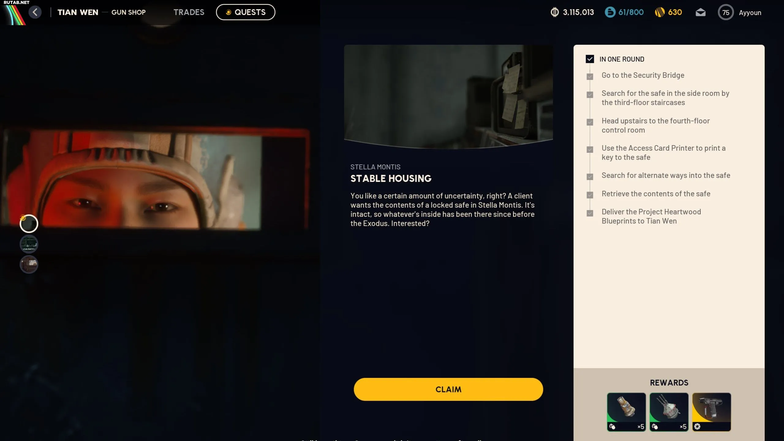 Вернувшись в Сперанцу, отдайте Чертёж проекта «Хартвуд» Тянь Вэнь. В награду за выполнение квеста «Стабильное жильё» вы получите 5 искательных гранат, 5 гранат-приманок и крюк-захват.