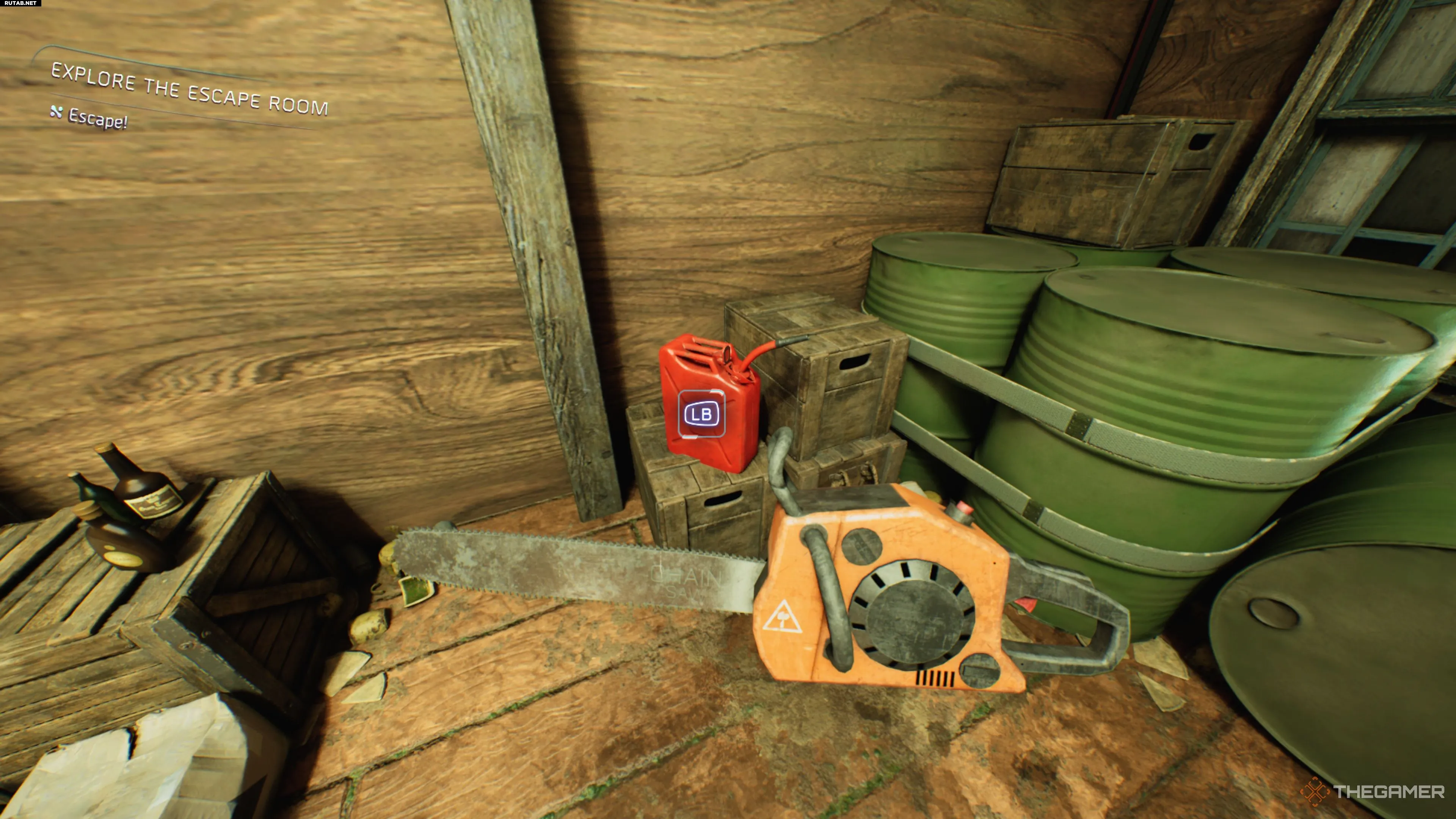 - Заправьте её из красной канистры рядом с зелёными бочками у двери.