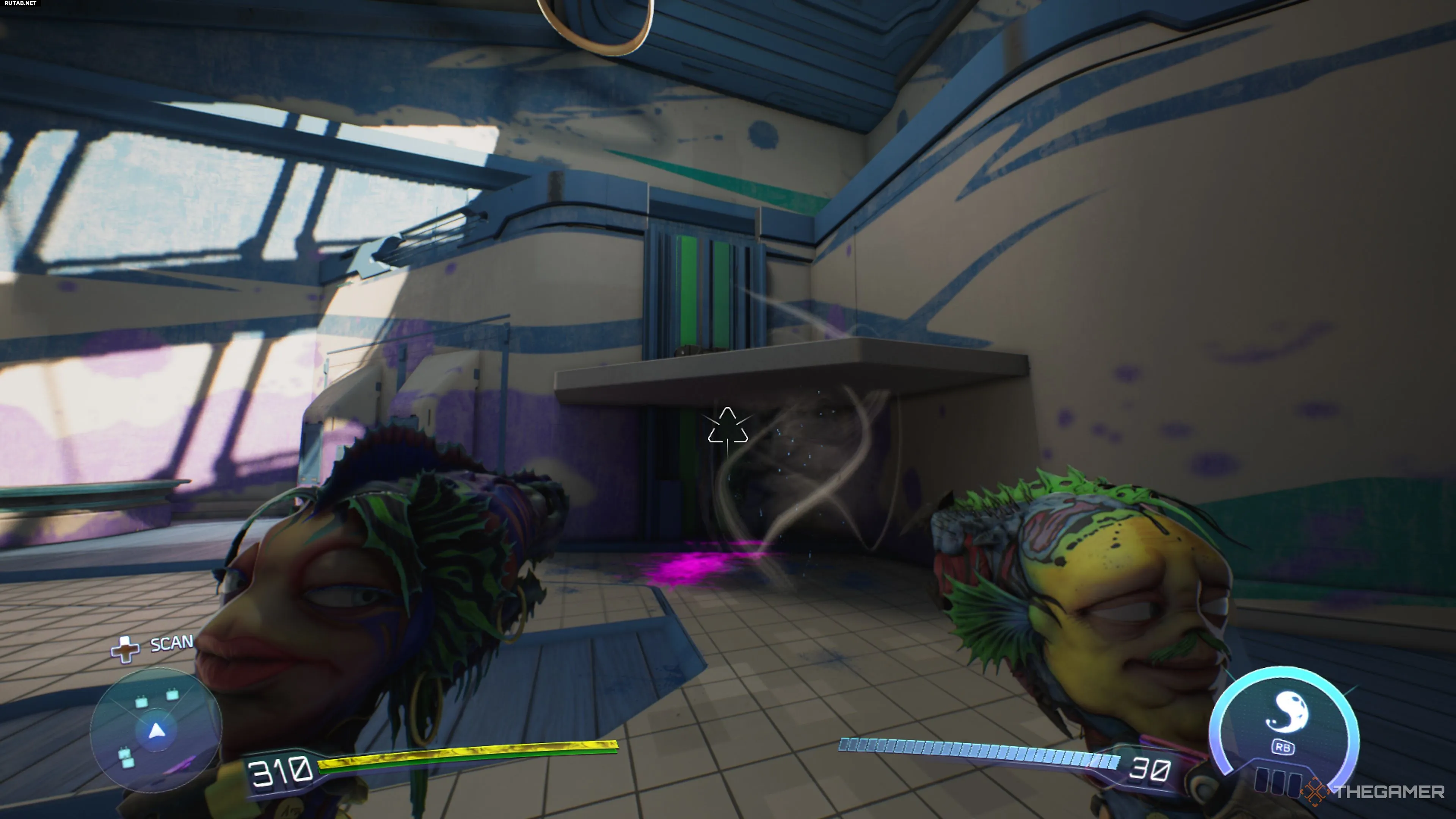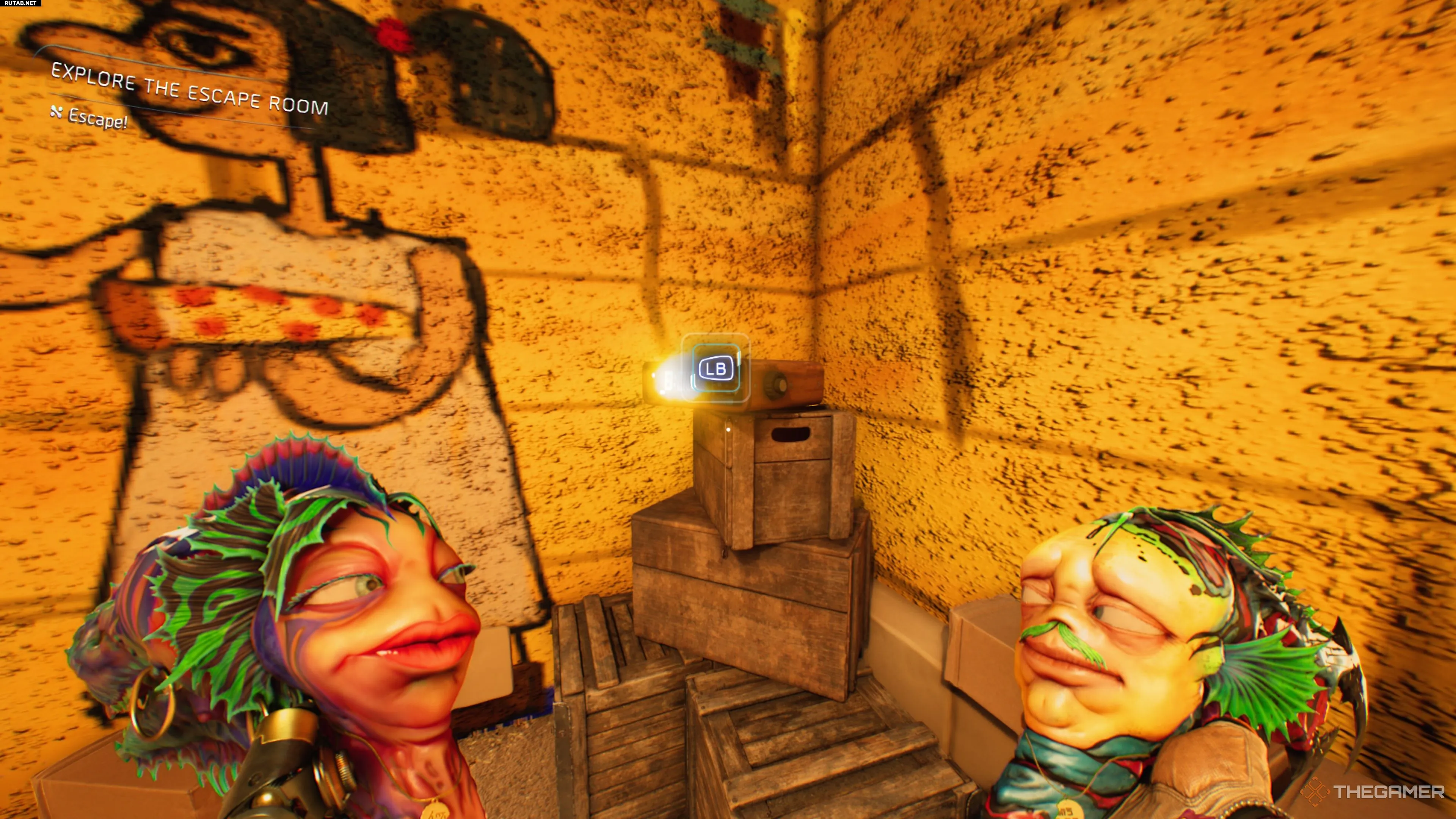 Используйте ловкий бросок Трэвиса и Джана, чтобы поднять платформу, запрыгните на неё и доберитесь до входа в «Безысходные комнаты Твилли».