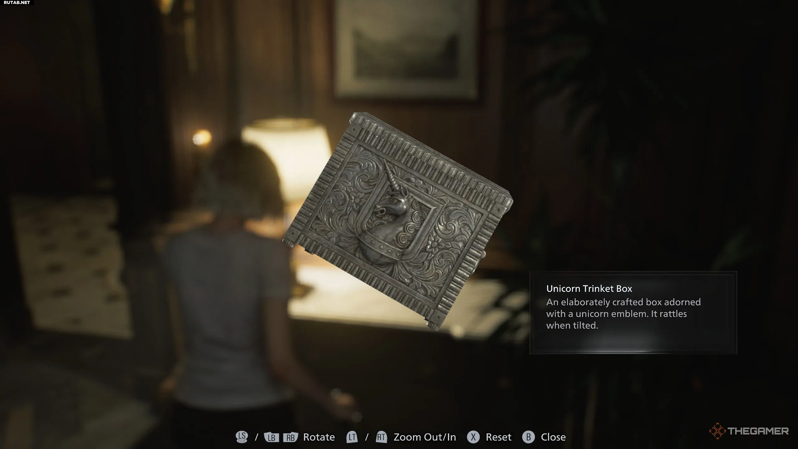 Разобравшись с зомби, идите по коридору к кабинету председателя. В задней комнате офиса будет ещё один зомби. Устранив его, вернитесь к двери, через которую вошли. На столе рядом с дверью вы найдёте серебряную шкатулку с изображением единорога. Осмотрите её и поверните, чтобы открыть потайное отделение.