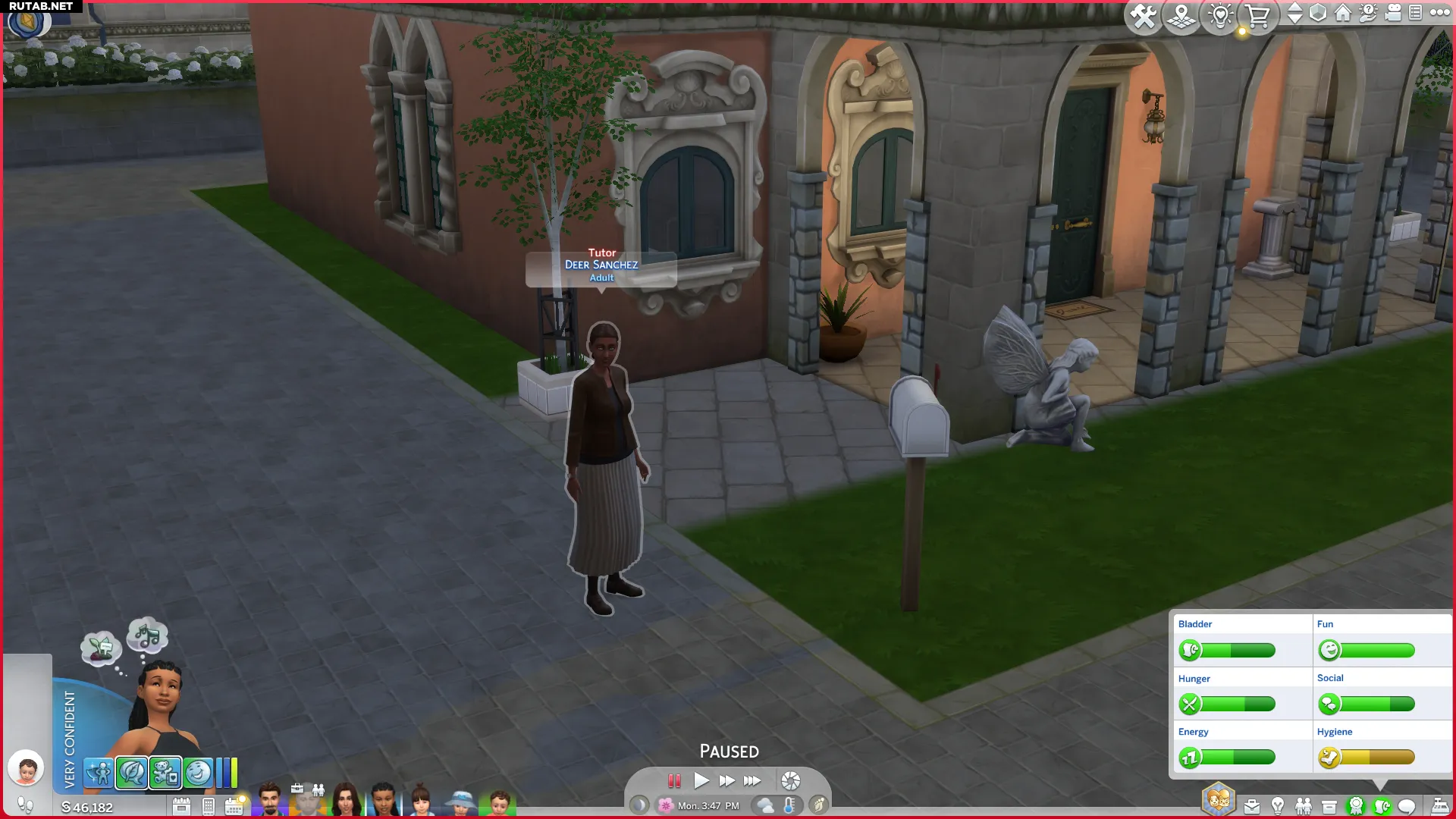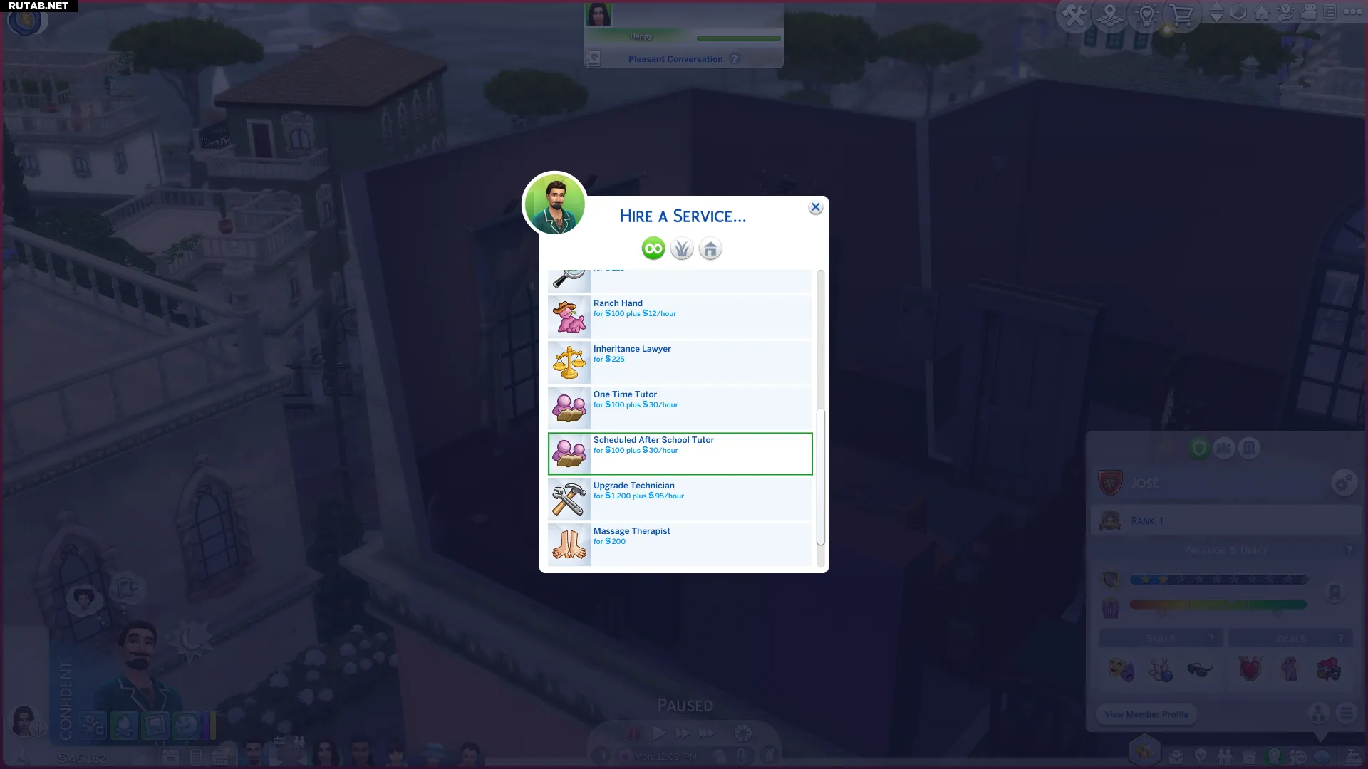 Репетитор приходит в дом около 15:35 и уходит примерно в 21:45, если его не отпустить раньше. Услуга стоит 100 симолеонов, плюс 30 симолеонов за каждый час пребывания на участке.