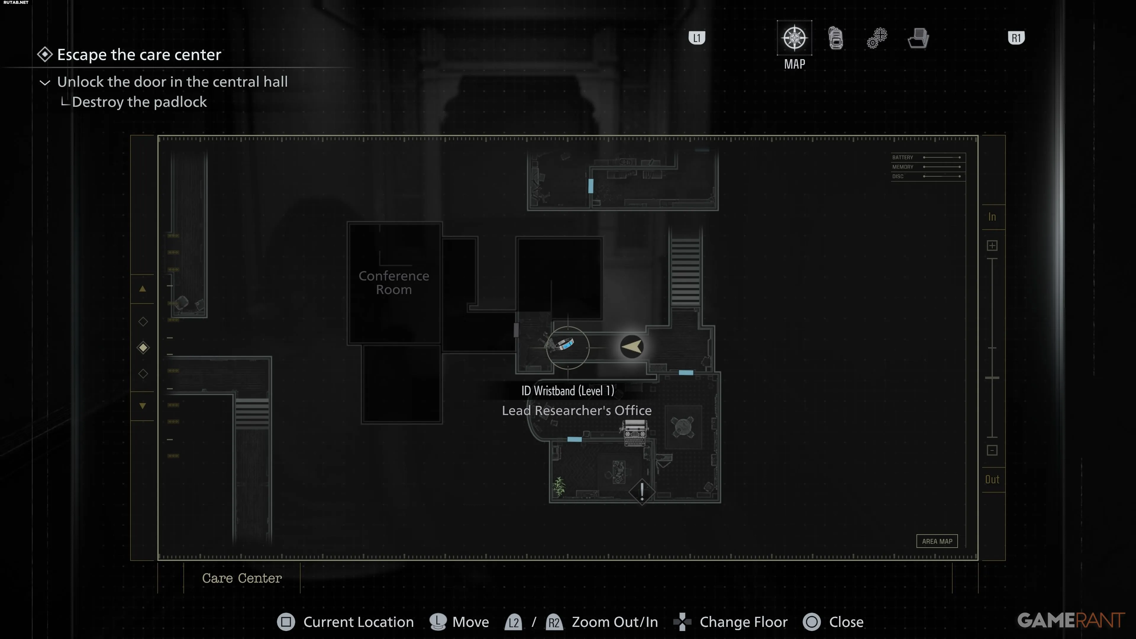 Когда будете готовы, пройдите по западному коридору на верхнем этаже Восточного крыла. Там в коридоре вы обнаружите труп. Немедленно взаимодействуйте с ним, чтобы забрать браслет идентификации уровня 1. Этот предмет позволит вам открывать заблокированные двери, требующие доступа уровня 1. В тот момент, когда вы поднимете браслет, за вами начнет гнаться гигантское чудовище, так что будьте готовы бежать!