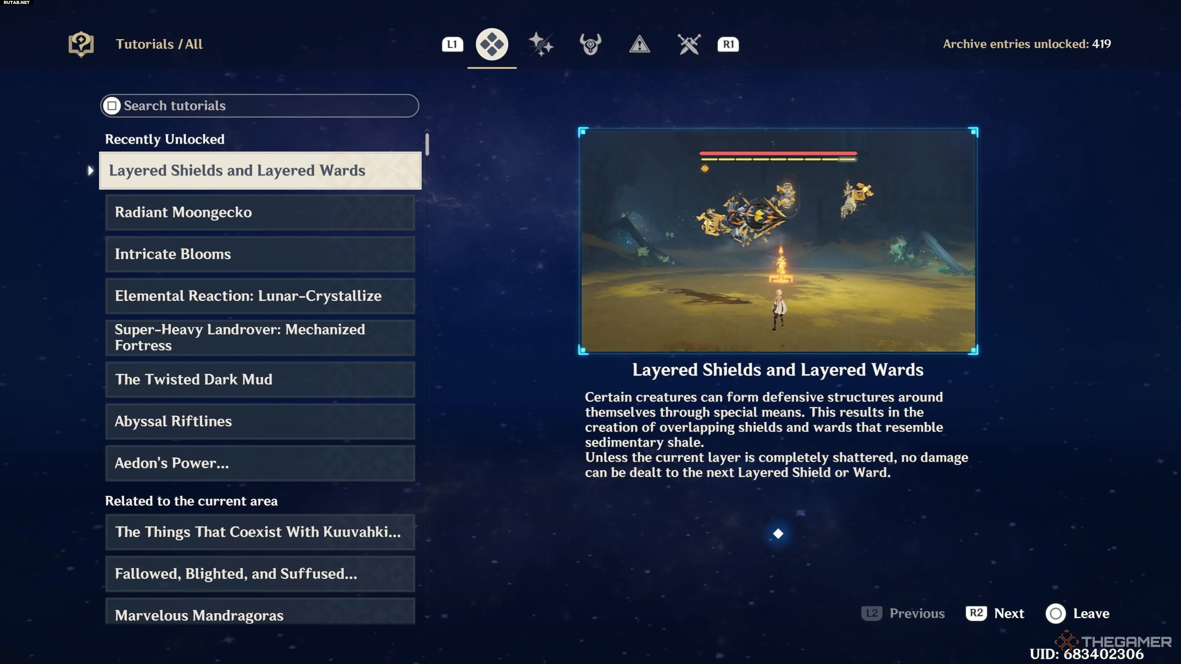 В бою с Сияющим лунным гекконом вы увидите, что он хорошо защищён несколькими полосками щита в верхней части экрана. Обычная жёлтая полоса щита разделена на восемь сегментов, с которыми придётся разобраться, чтобы добраться до его здоровья. Этот щит появляется во время определённой анимации, когда босс поднимает и зажигает свой хвост силой Гео, а вокруг вас из земли вырастают каменные столбы.