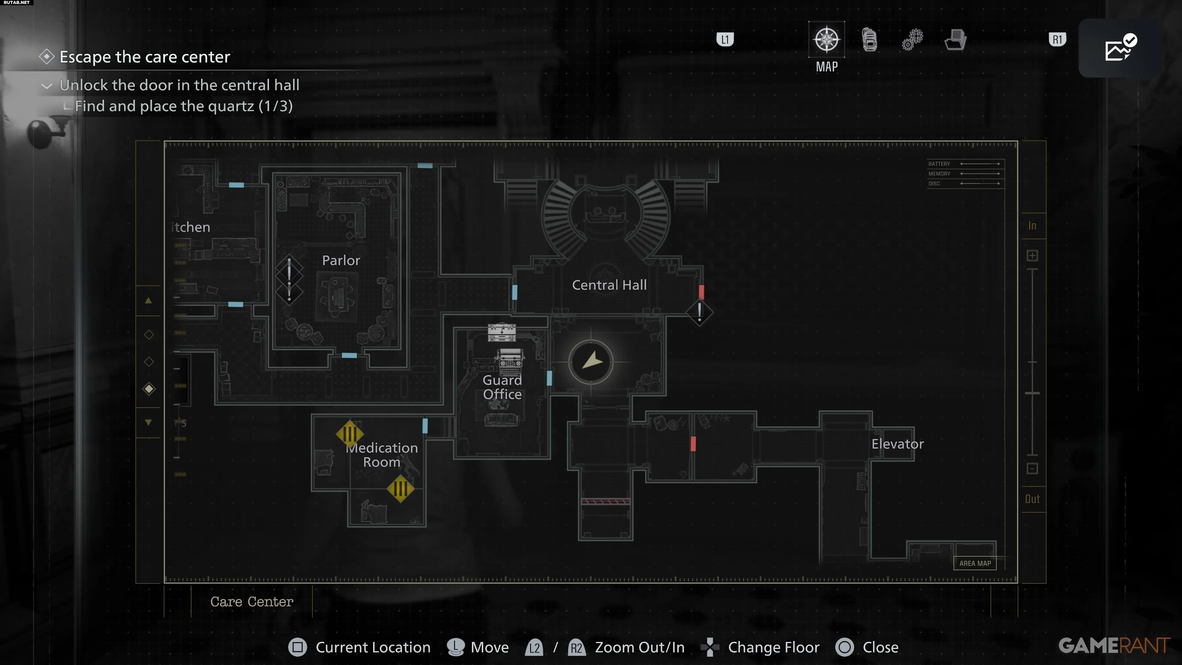 Чтобы попасть в Западное крыло Медицинского центра, сначала необходимо попасть в Охранную комнату. Она находится в юго-западной части Центрального зала. Не волнуйтесь, это безопасная комната, поэтому можете спокойно сохраниться на пишущей машинке, не опасаясь нападения зомби или других монстров.
