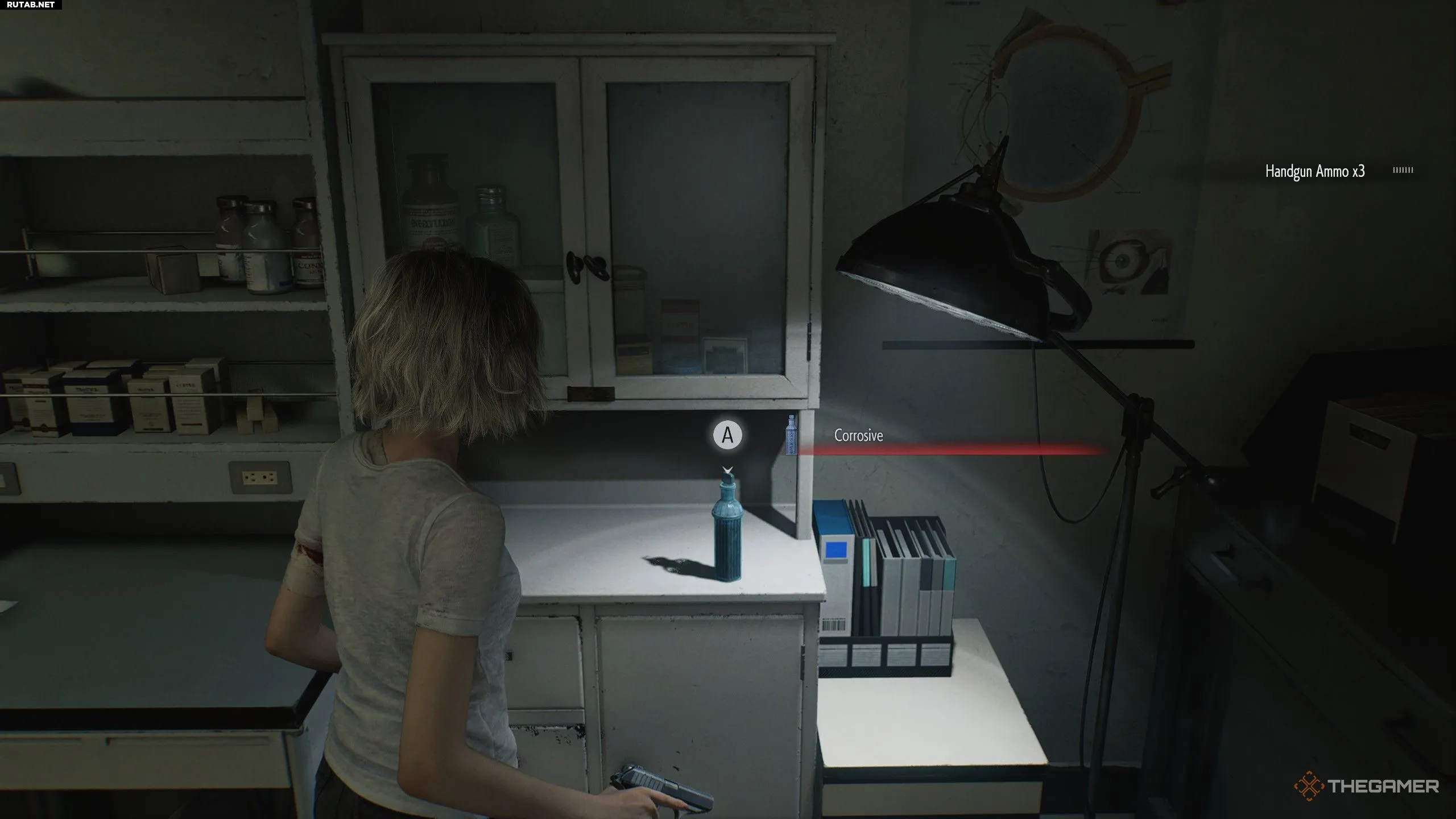 Чтобы начать разгадывать головоломку, сначала нужно сжечь замок на ящике с помощью бутылки кислоты. Эта бутылка находится в Конференц-зале, который расположен в том же коридоре, что и кабинет исследователя. Однако путь преградит огромный раздутый зомби, которого невозможно убить на данном этапе.