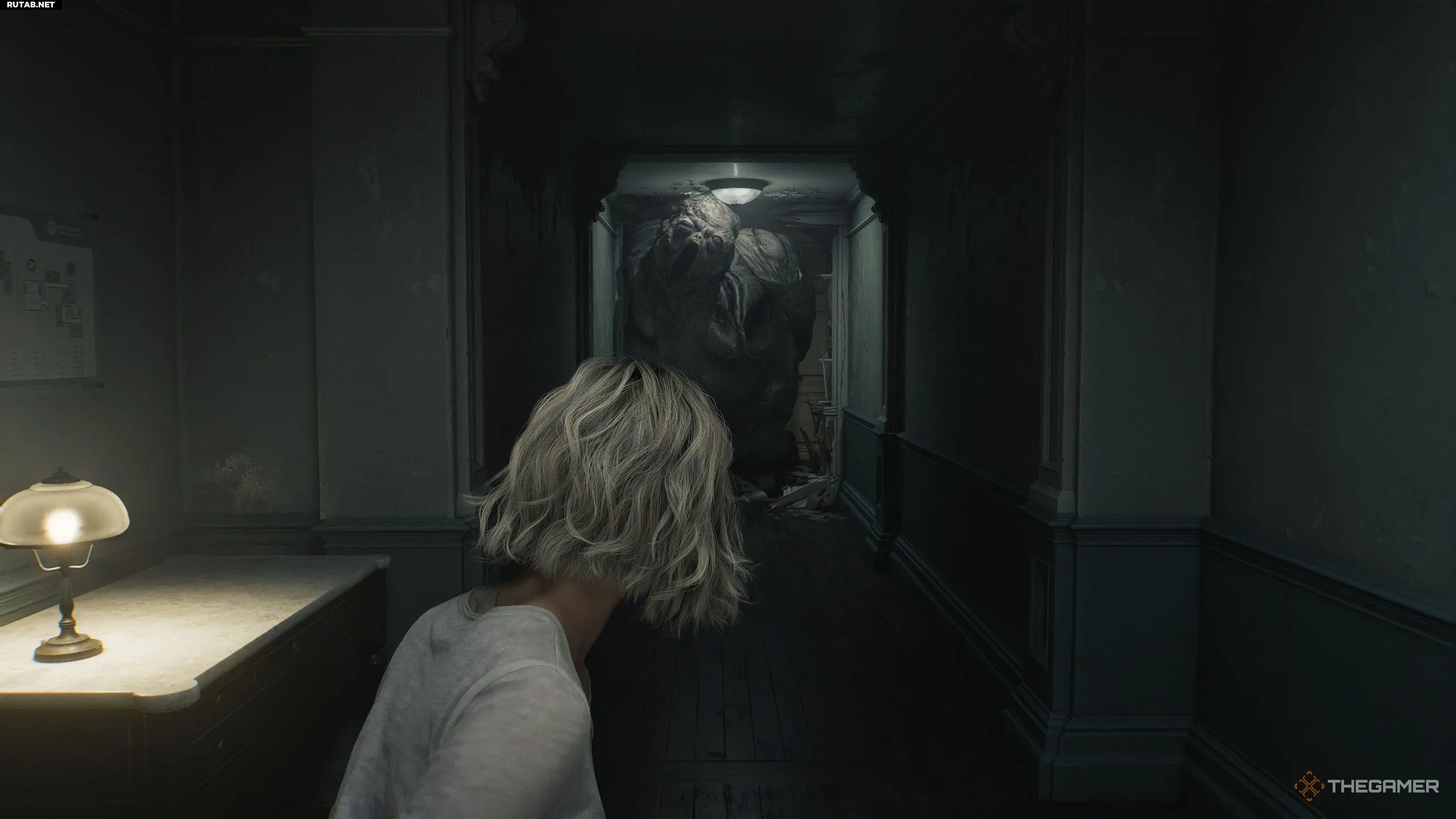 Единственный вариант — бежать. Чудовище не может пройти в двери медцентра, поэтому добегите до комнаты сохранения справа и переждите. Когда монстр отступит, спуститесь по лестнице и зайдите в Приемную. Зомби не сможет войти внутрь, но останется патрулировать коридоры первого этажа.