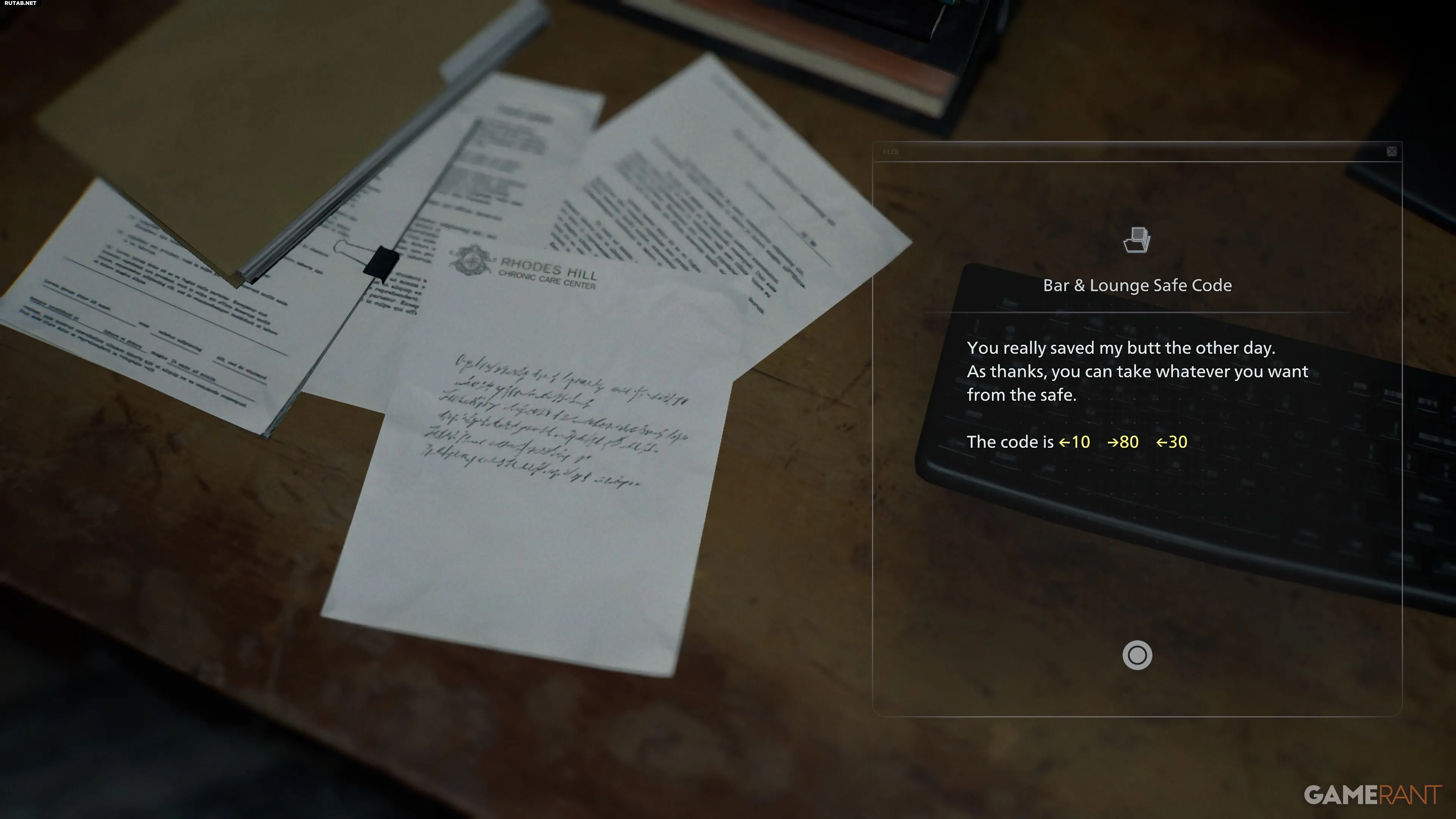 Код от сейфа в баре: 10 (влево), 80 (вправо), 30 (влево). Чтобы его открыть, выполните следующие действия: