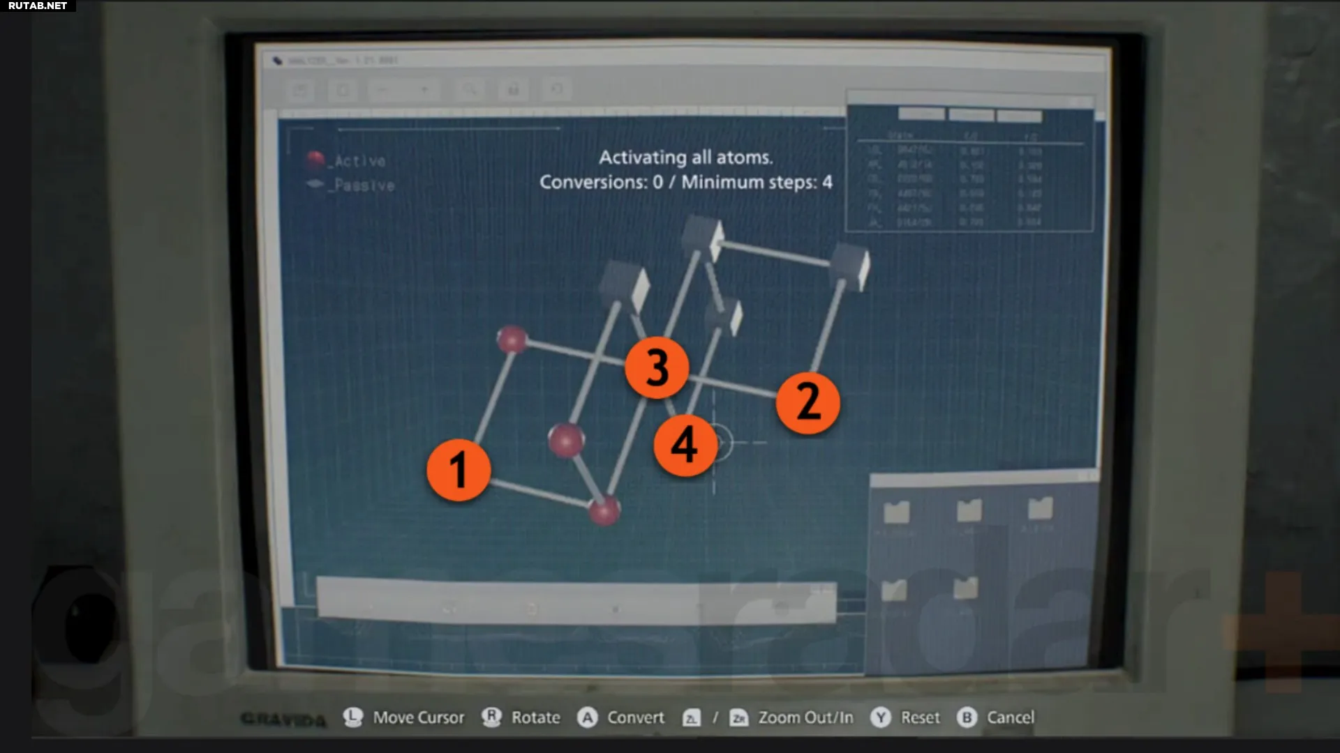 Исходная позиция: нажмите на самый левый атом, затем на правый нижний атом, потом на центральный атом и, наконец, на нижний средний атом. Если вы допустили ошибку, используйте кнопку сброса, чтобы начать заново.