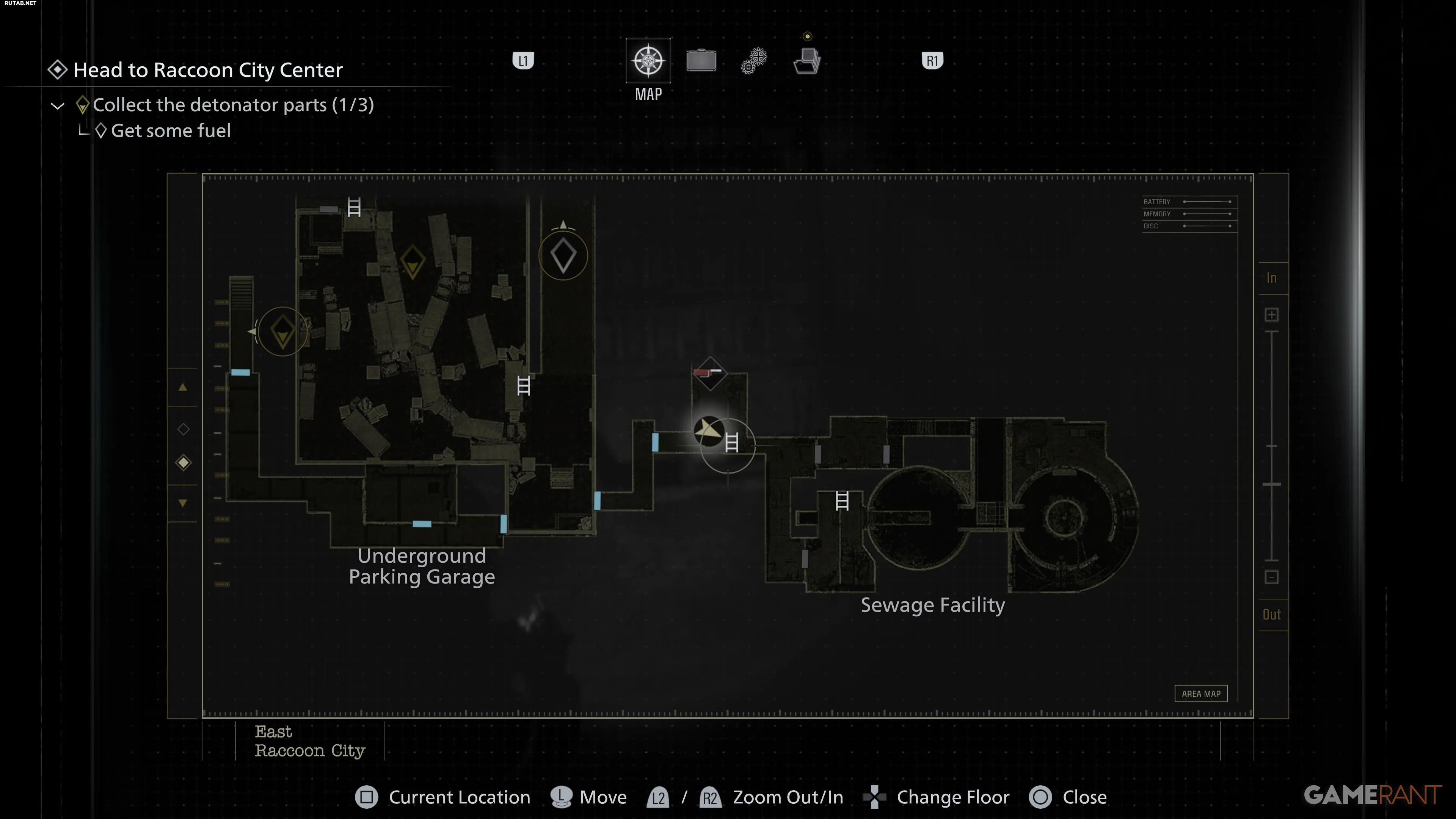 Для начала поднимитесь по лестнице слева от ворот и спрыгните в затопленный подземный паркинг. Здесь полно зомби, но вам нужно пробраться через опасную зону в северо-западную комнату, где лежит первая батарея. Взяв её, поднимитесь по лестнице в этой же комнате и пройдите по потолочным конструкциям, чтобы безопасно вернуться обратно.