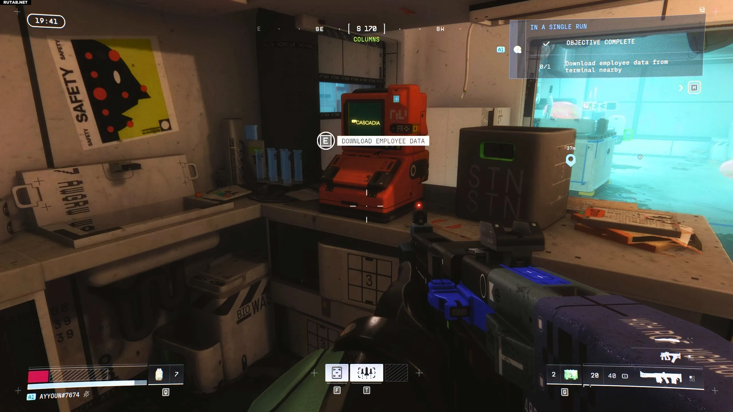 Повернувшись назад, вы увидите красный терминал. Взаимодействуйте с ним, чтобы загрузить данные сотрудников. Это завершит контракт «Знакомство с NuCaloric». В награду вы получите: 2 имплантата «Защитник V1», 6 зарядов щита, 3 нестабильных биомассы, 6 ремкомплектов и 1000 кредитов, а также опыт, повышающий репутацию вашего Бегуна у фракции «Киберакме».