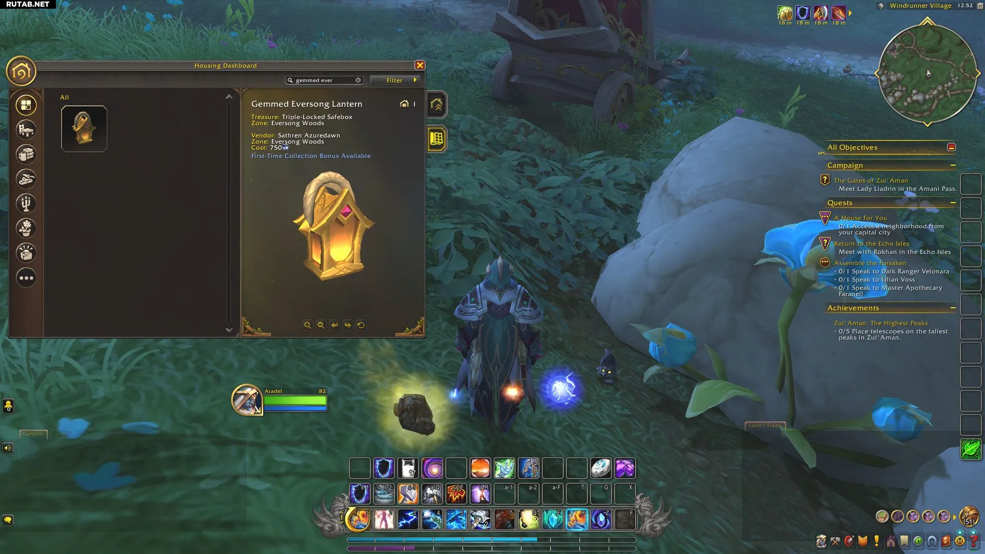 Внутри сундука в Лесах Вечной Песни вас ждёт Украшенный самоцветами фонарь Лесов Вечной Песни — предмет декора для личного жилья, а также 50 ед. репутации с Двором Луносвета. Кроме того, открытие этого сундука приблизит вас к получению достижения «Сокровища Лесов Вечной Песни». За него начисляется 5 очков достижений, а также в журнал питомцев автоматически добавляется котоподобный спутник Пепельная Лапка.