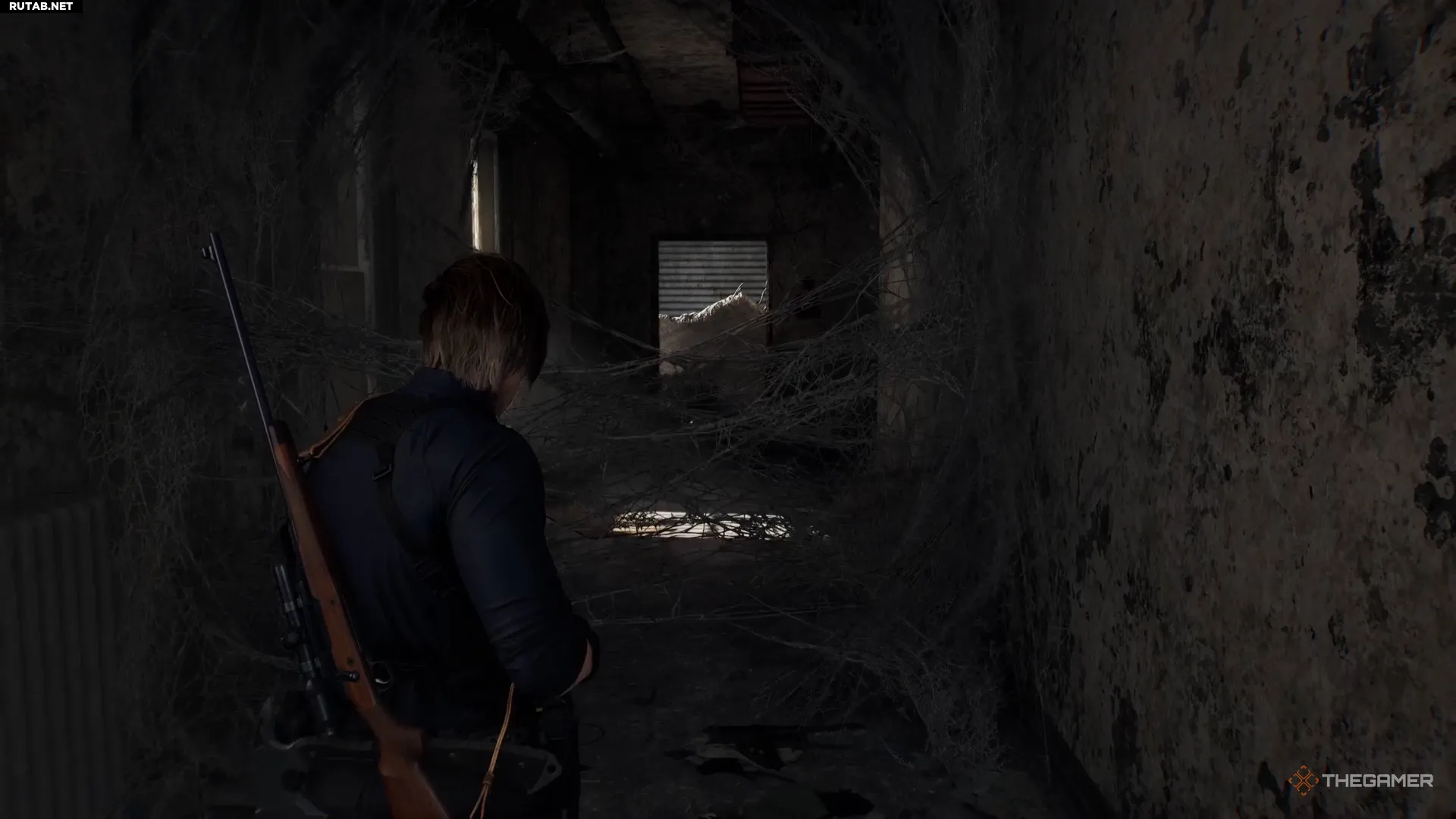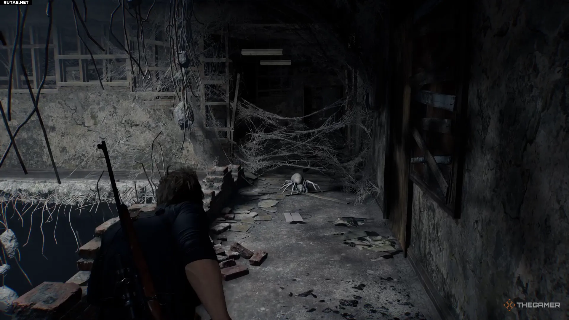 После кат-сцены вы окажетесь в коридоре, заблокированном завалом. Идите вперёд и рубите паутину, преграждающую путь. Паук вскоре ворвётся через стену и бросится в атаку. Достаньте дробовик (или любое оружие с запасом патронов) и стреляйте, пока существо не отпрянет от боли. Это ваш шанс развернуться и бежать по коридору.