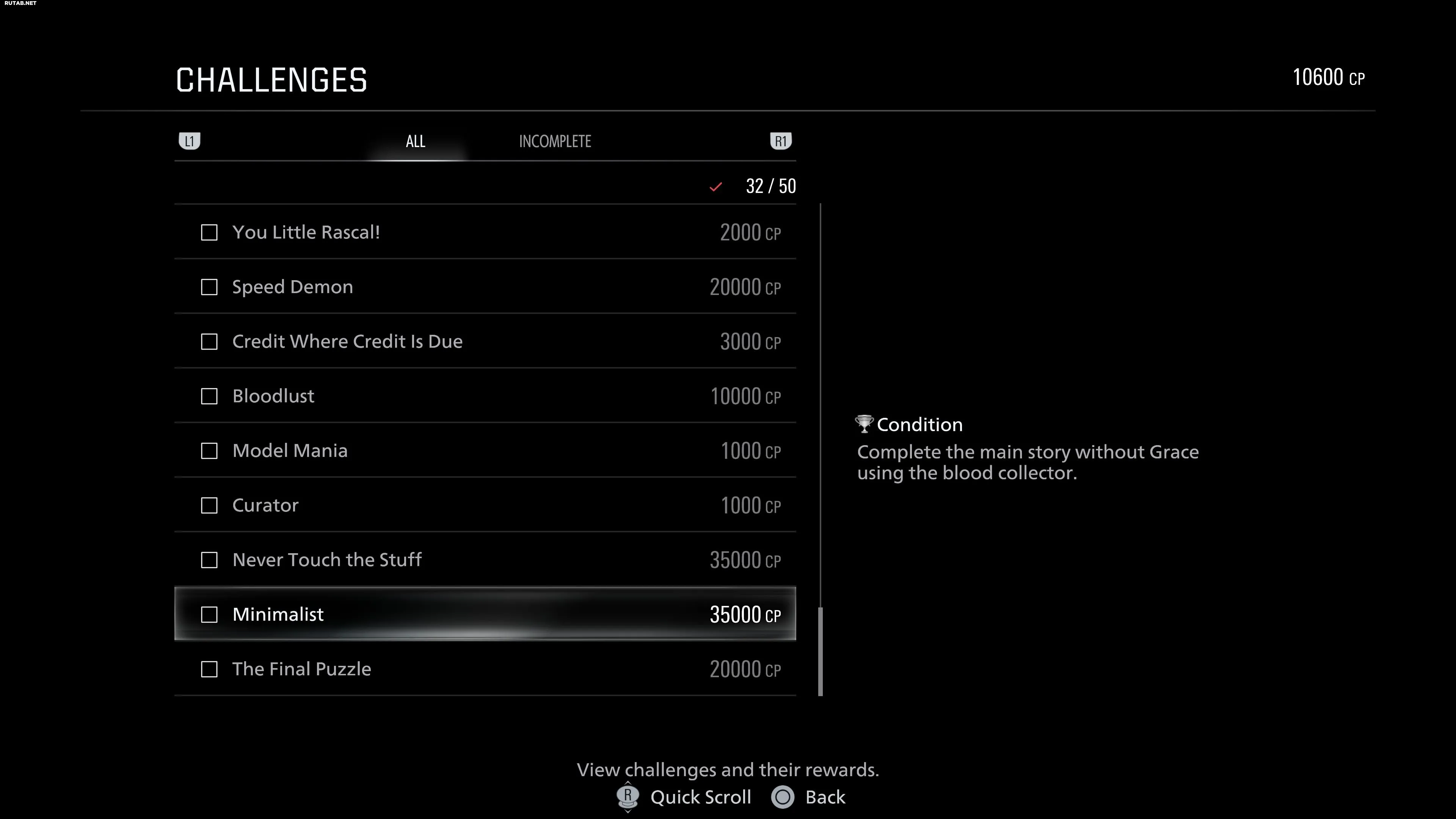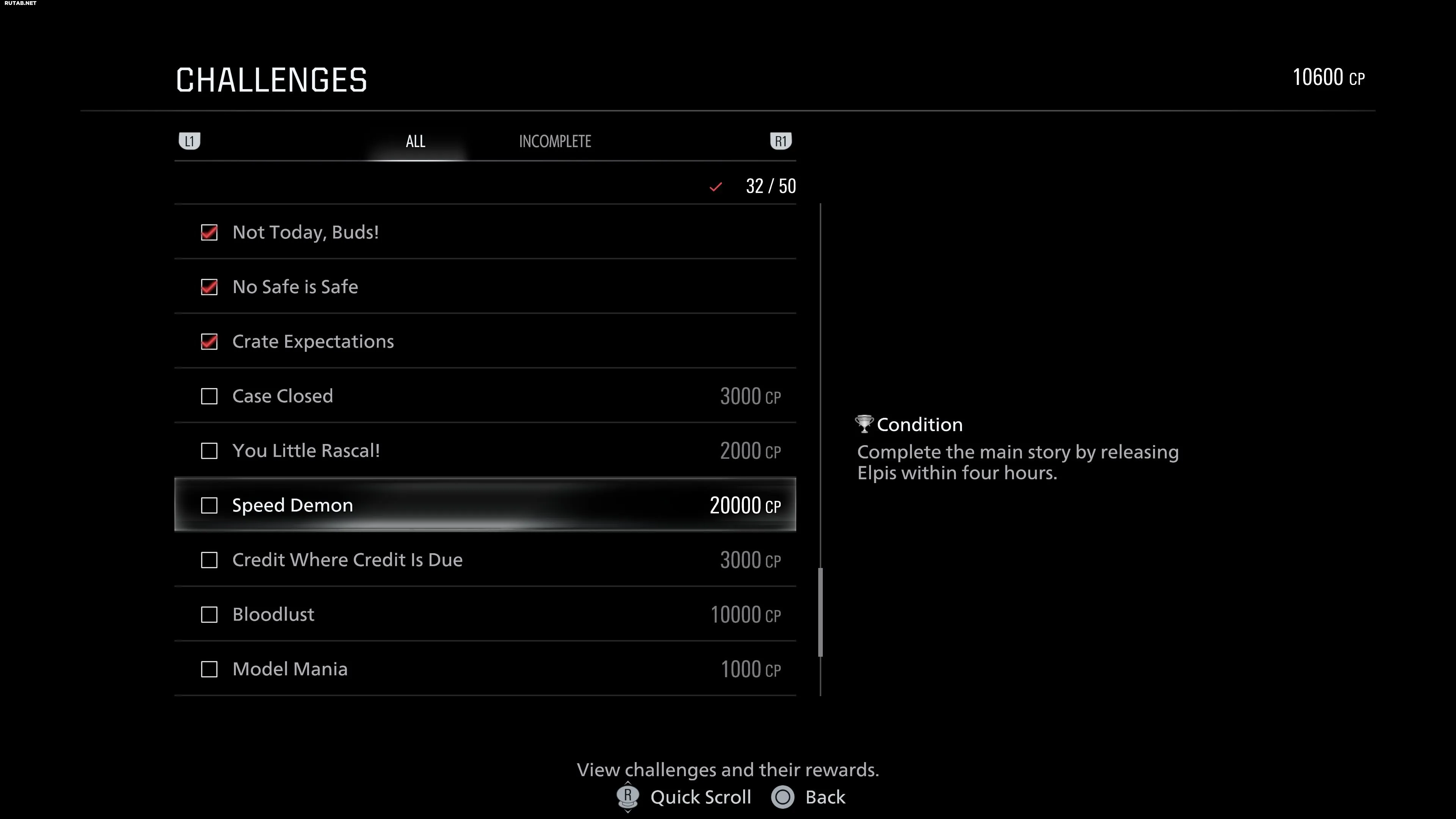 Для «Демона скорости» нужно пройти игру менее чем за 4 часа. Это хорошо сочетается с испытанием «Кровожадность», где вы не используете аппарат для забора крови за Грейс. Поскольку вы будете быстро пробегать через Медицинский центр, избегая лишних столкновений ради экономии времени, это отличная комбинация для набора очков испытаний.