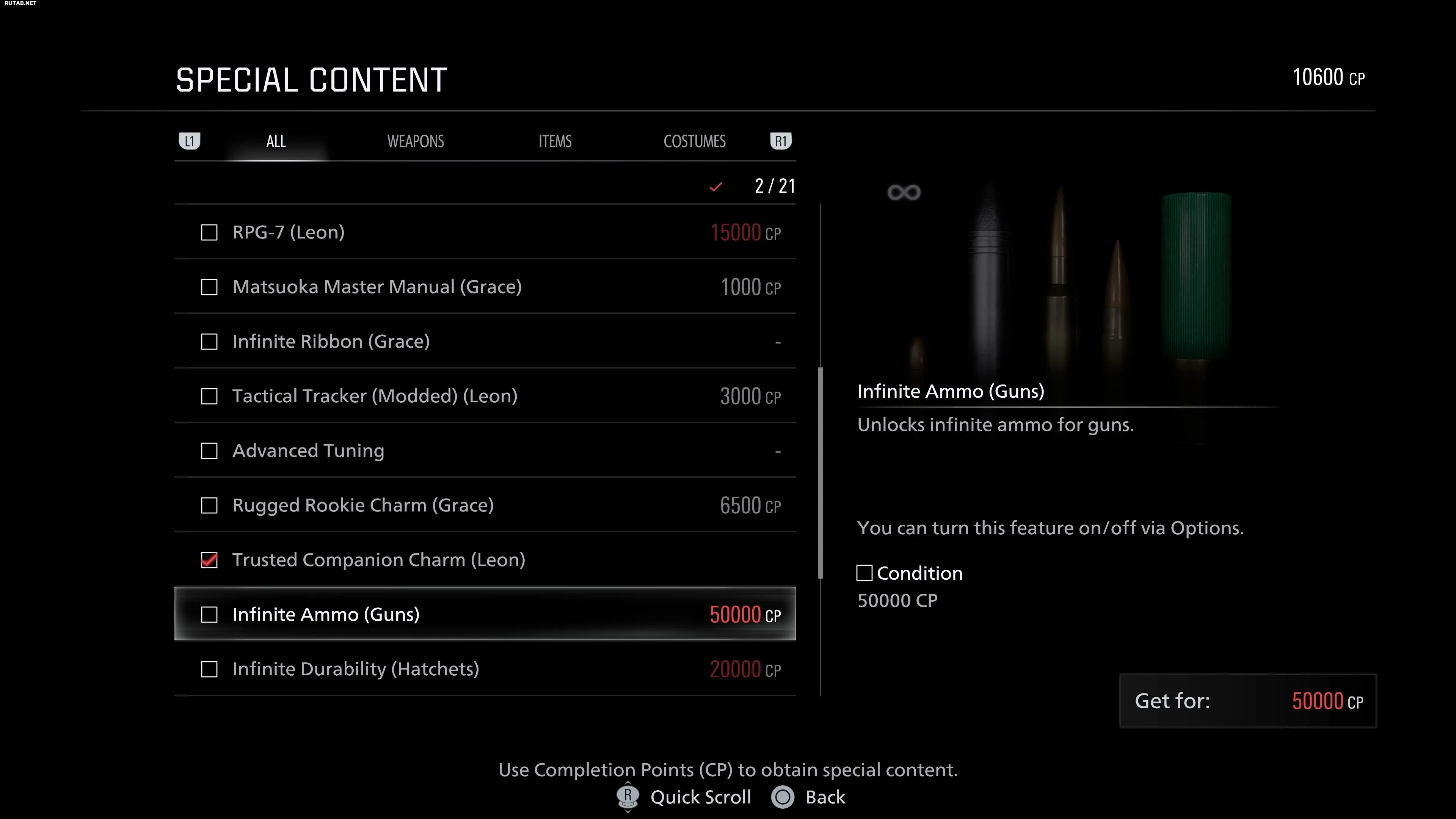 Также можно купить «Бесконечные патроны (РПГ-7)» за 35 000 CP, но для этого сначала нужно разблокировать саму РПГ-7 за 15 000 CP, и это оружие доступно только для Леона.