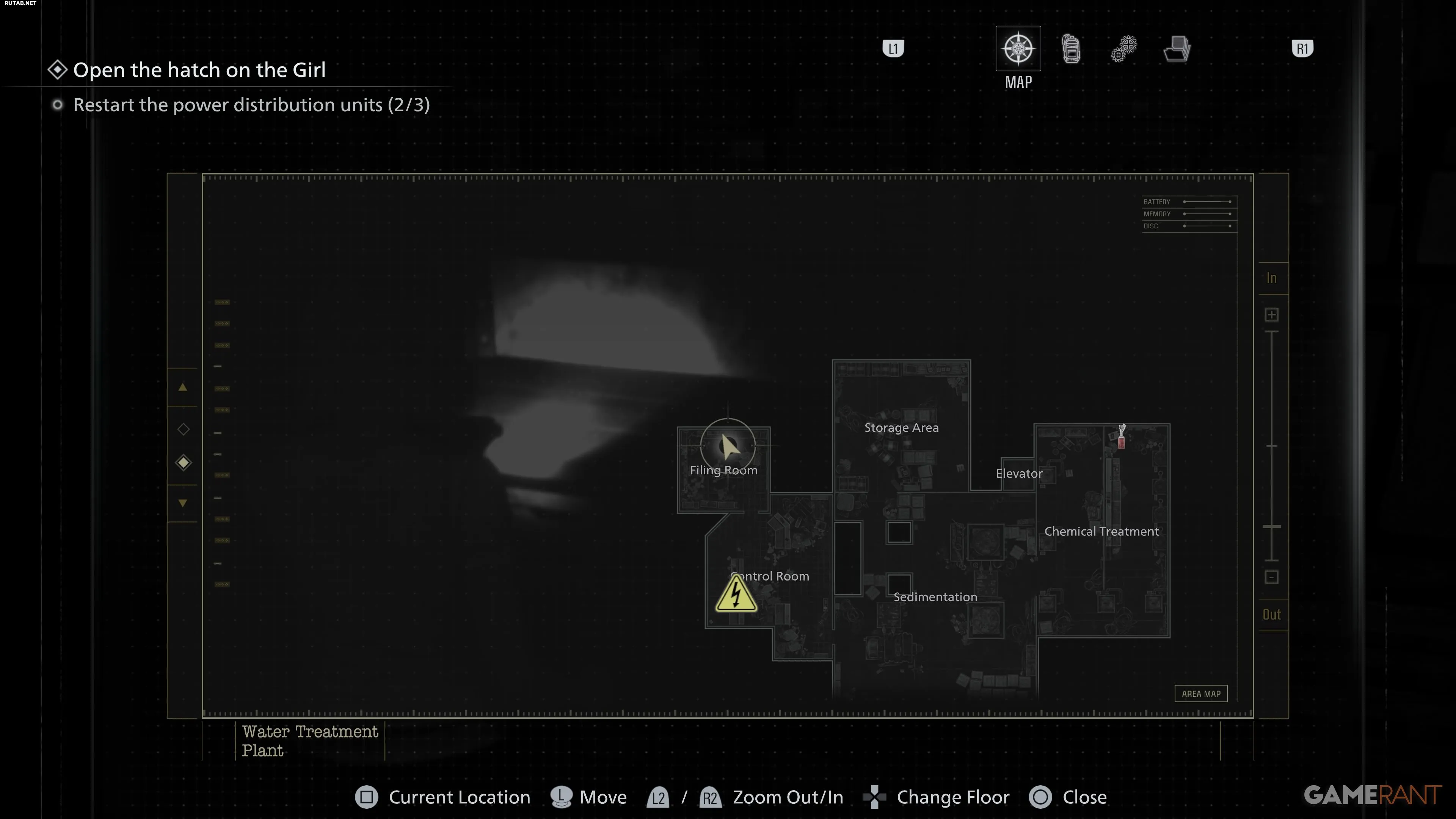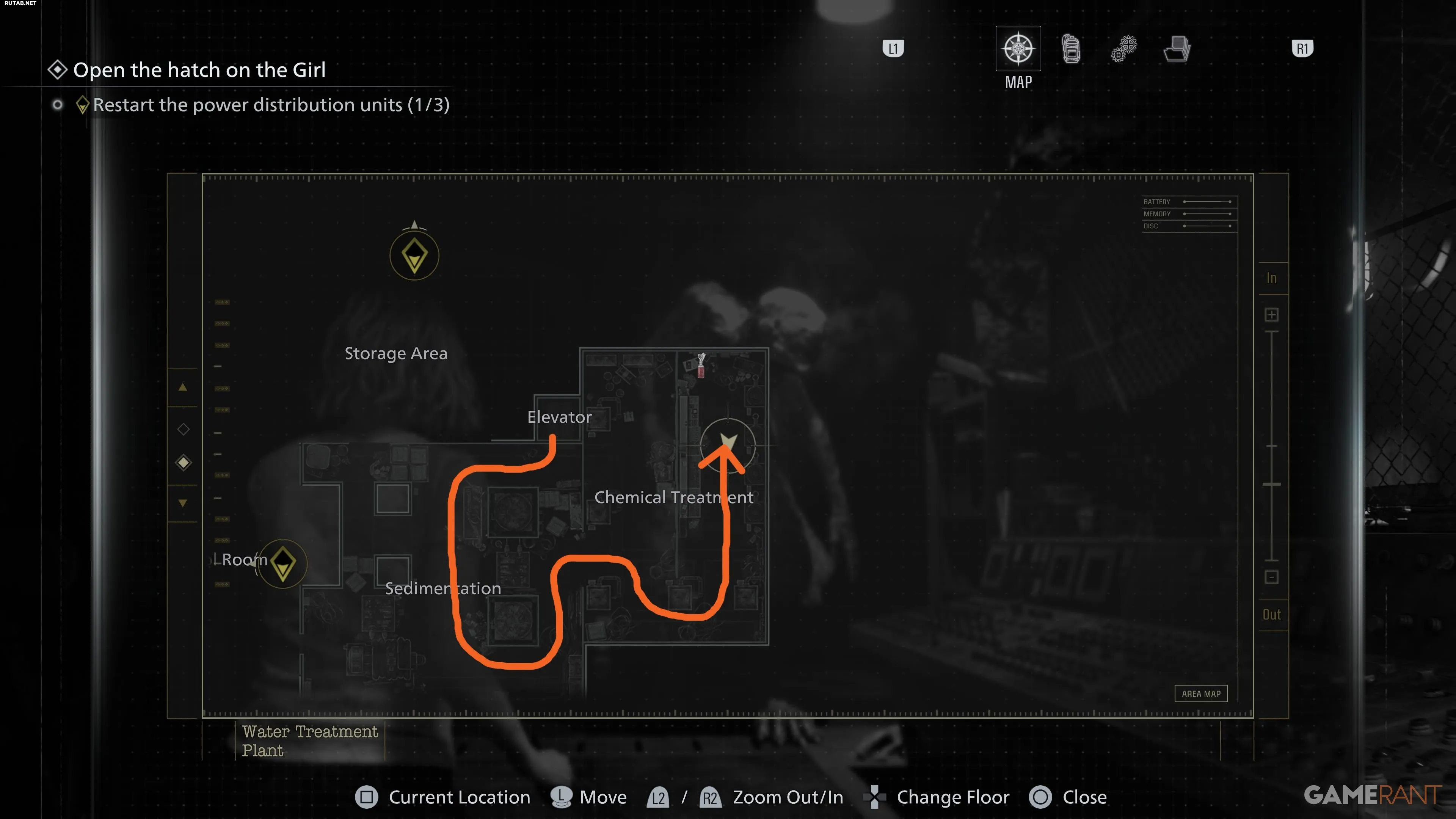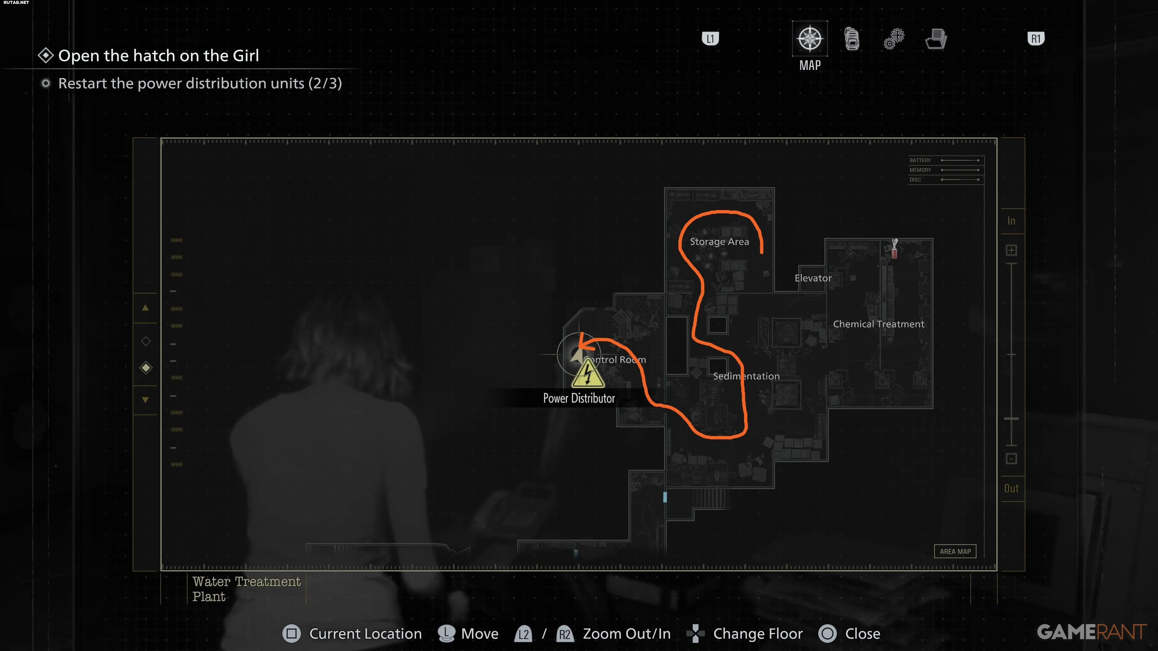 После неудачной попытки открыть люк спуститесь по уступу за панелью управления в нижний уровень. Оттуда двигайтесь на юг от зоны «Отстойник», затем на восток через проходы к щиту в зоне «Химическая очистка». Чтобы запустить его, нужно держать кнопку X, вращая рукоять. Девушка может помешать — оглушите ее выстрелом или «коктейлем», чтобы безопасно выполнить действие. После активации света она отступит.