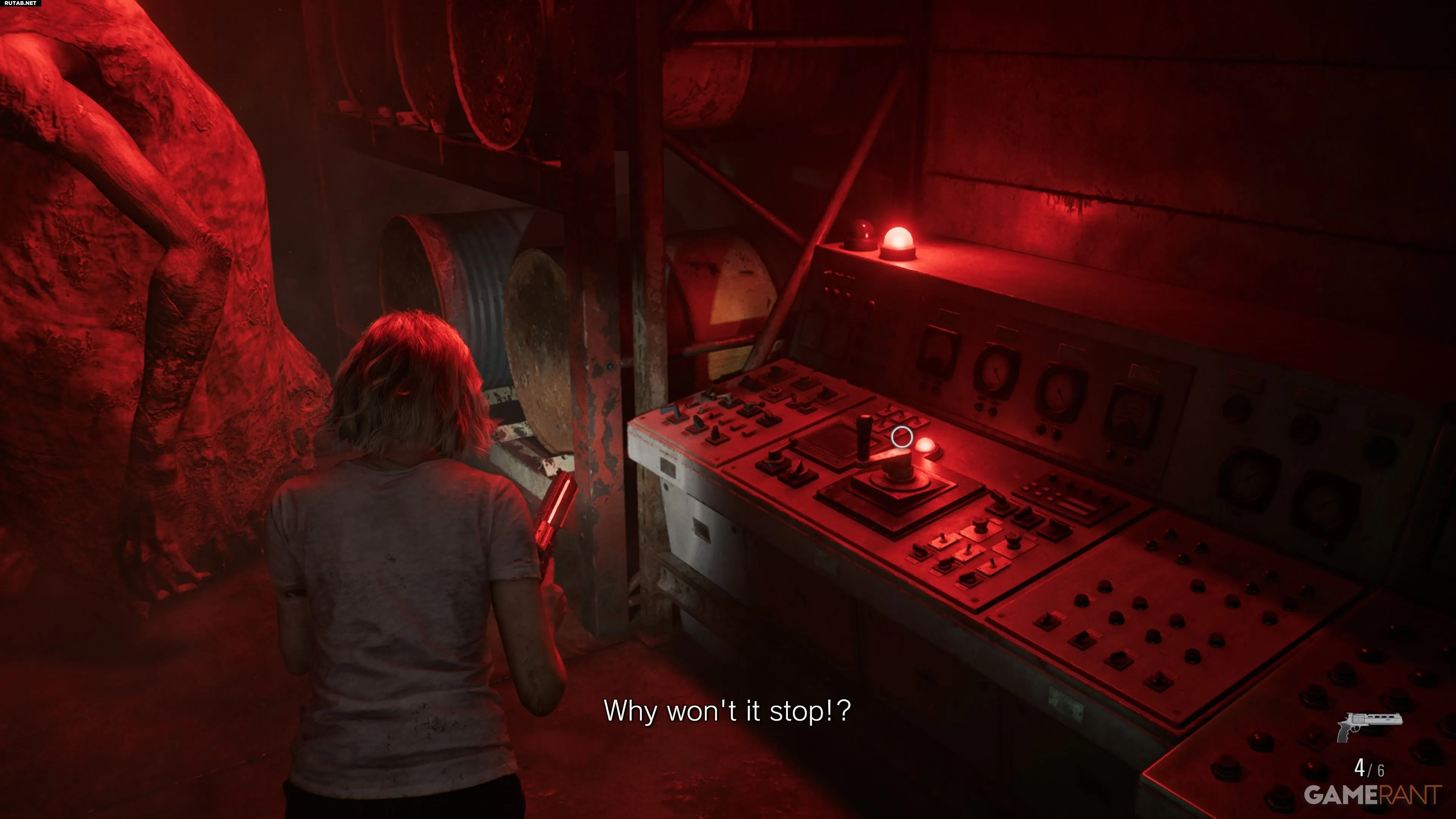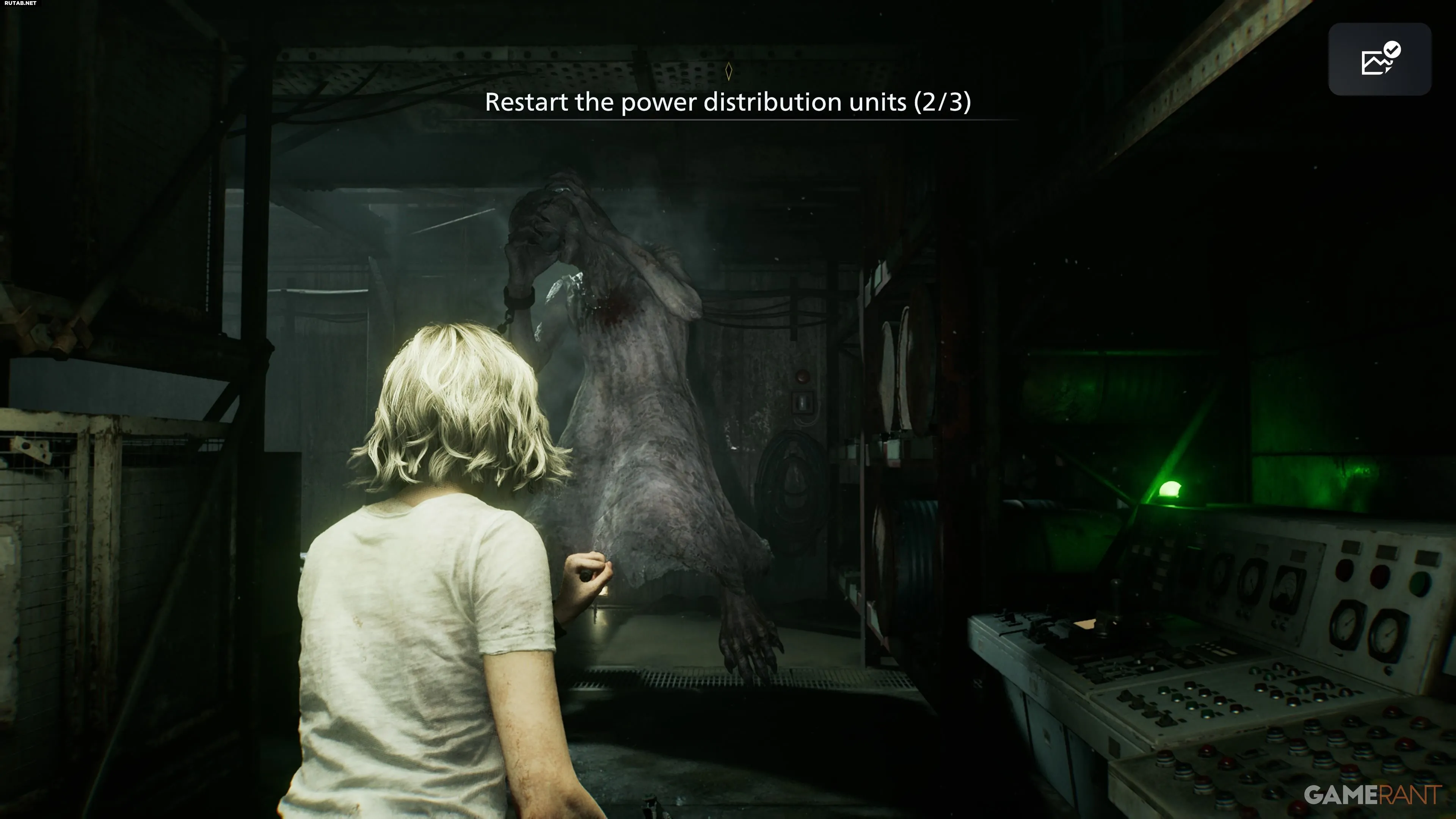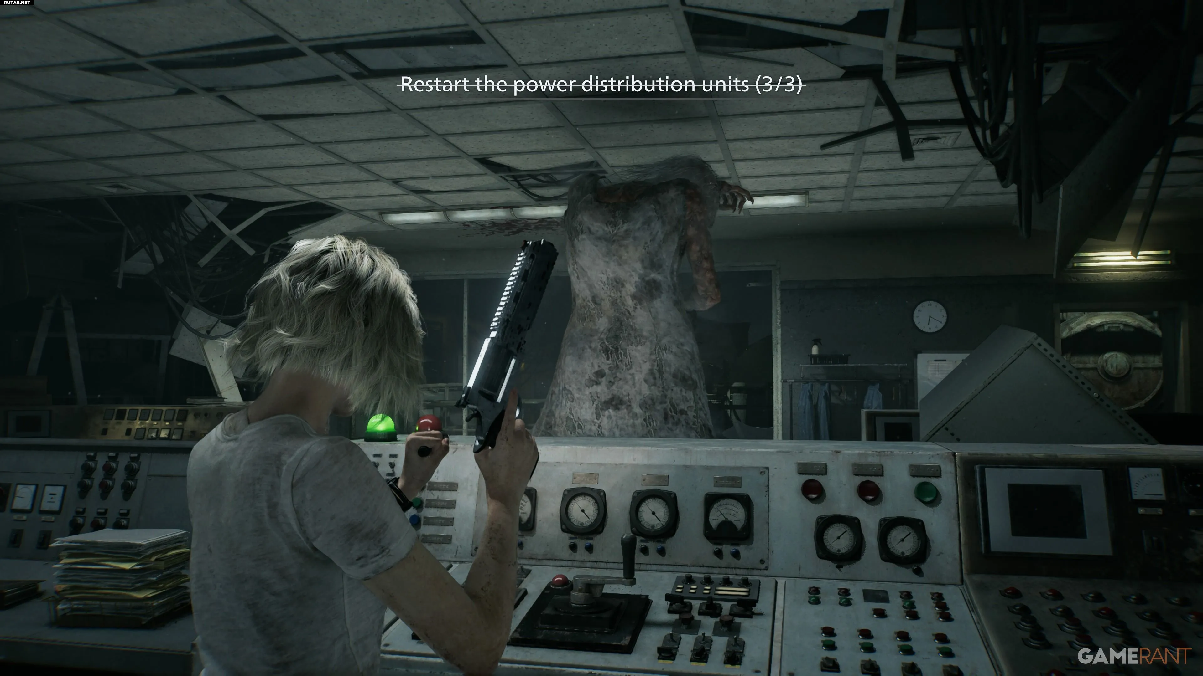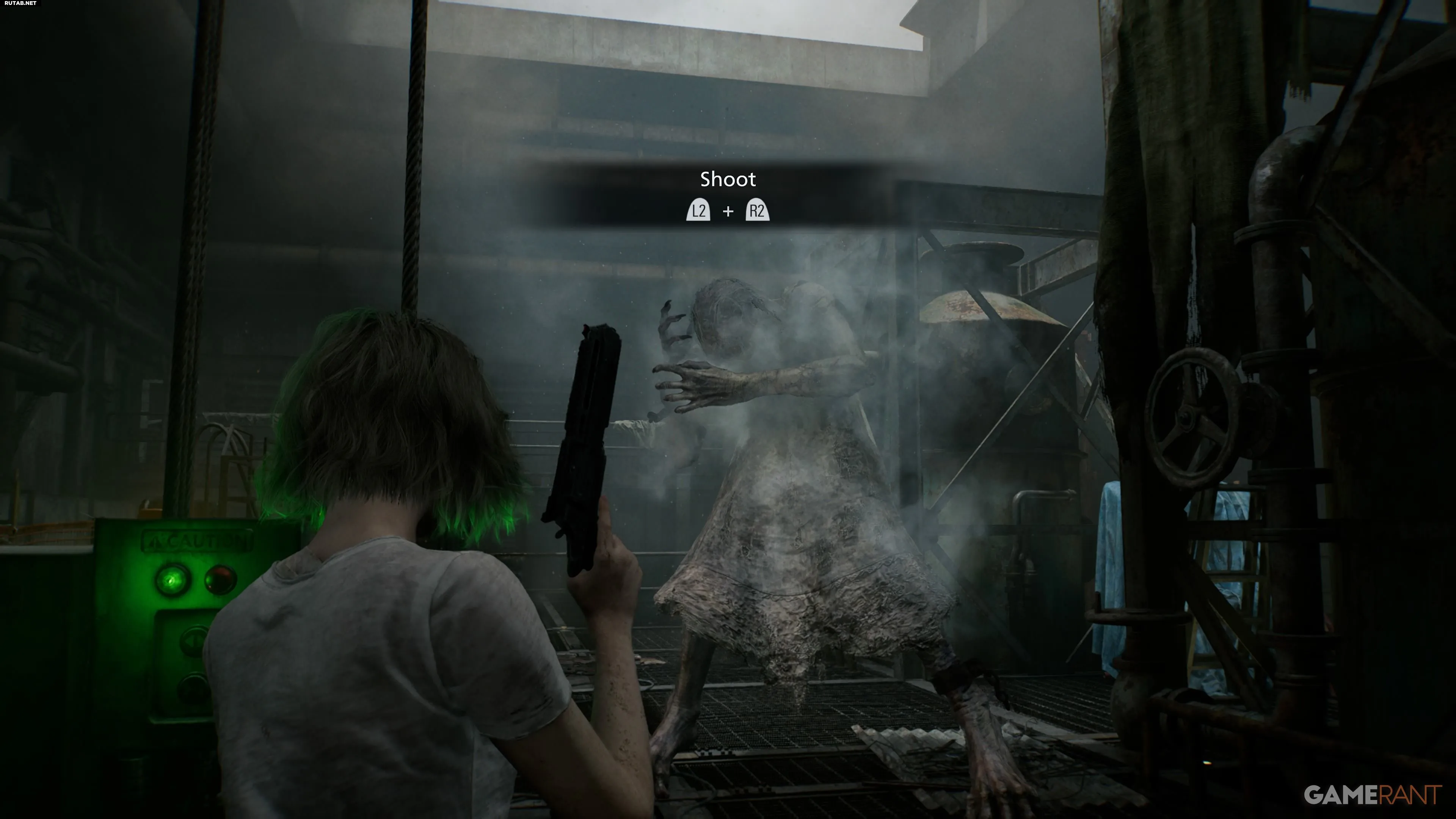 После неудачной попытки открыть люк спуститесь по уступу за панелью управления в нижний уровень. Оттуда двигайтесь на юг от зоны «Отстойник», затем на восток через проходы к щиту в зоне «Химическая очистка». Чтобы запустить его, нужно держать кнопку X, вращая рукоять. Девушка может помешать — оглушите ее выстрелом или «коктейлем», чтобы безопасно выполнить действие. После активации света она отступит.
