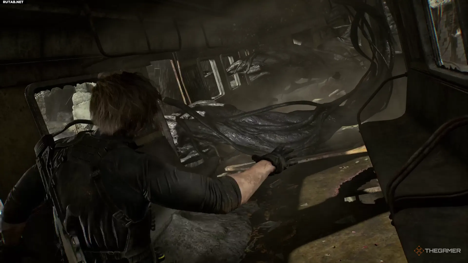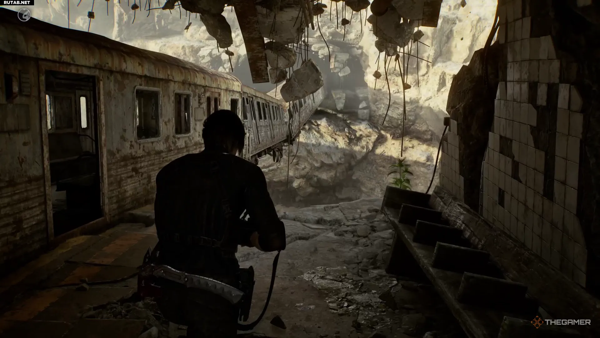 Битва с Растением 42 начинается, когда вы входите в заброшенный приют Раккун-Сити и спускаетесь в разрушенные тоннели метро ниже. Продолжайте следовать по основному пути, и вскоре Леону придётся пробираться через разрушенный вагон поезда, свисающий с обрыва.