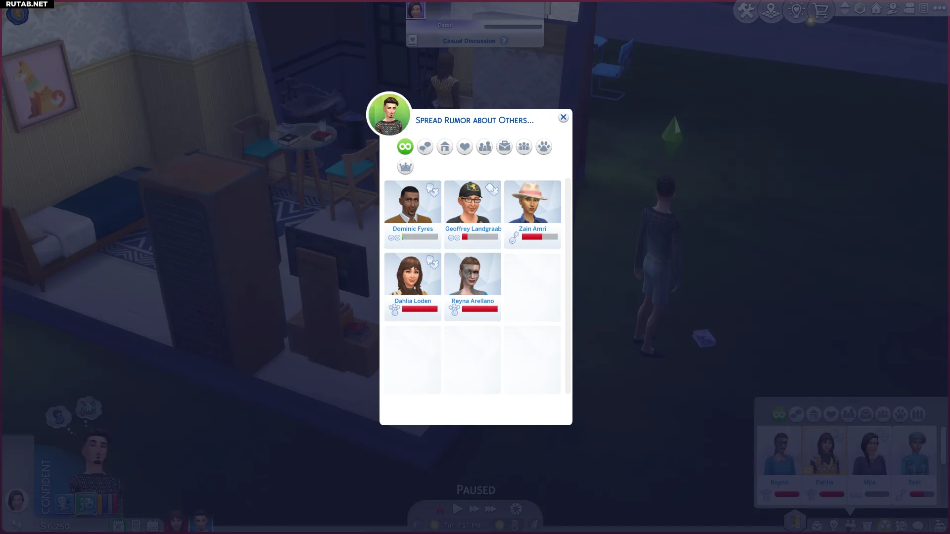 Чтобы распустить слух о враге, персонаж должен поговорить с тем, с кем у него хорошие отношения, и выбрать действие «Распускать слухи о других» в меню «Пакости → Обман».