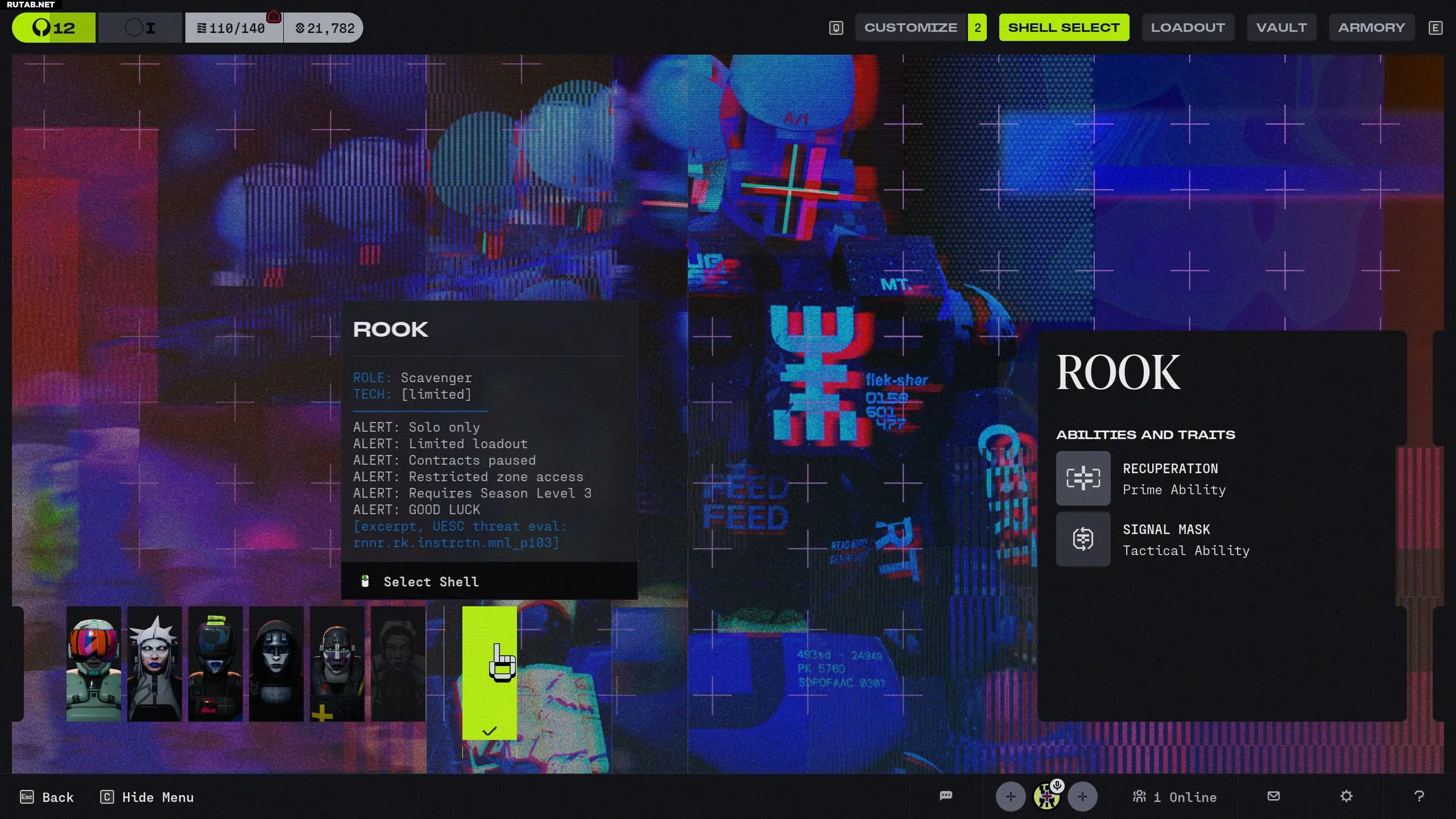 В отличие от обычных оболочек Бегуна, возможности Rook ограничены в плане того, что он может взять с собой и как входит в вылазку.
