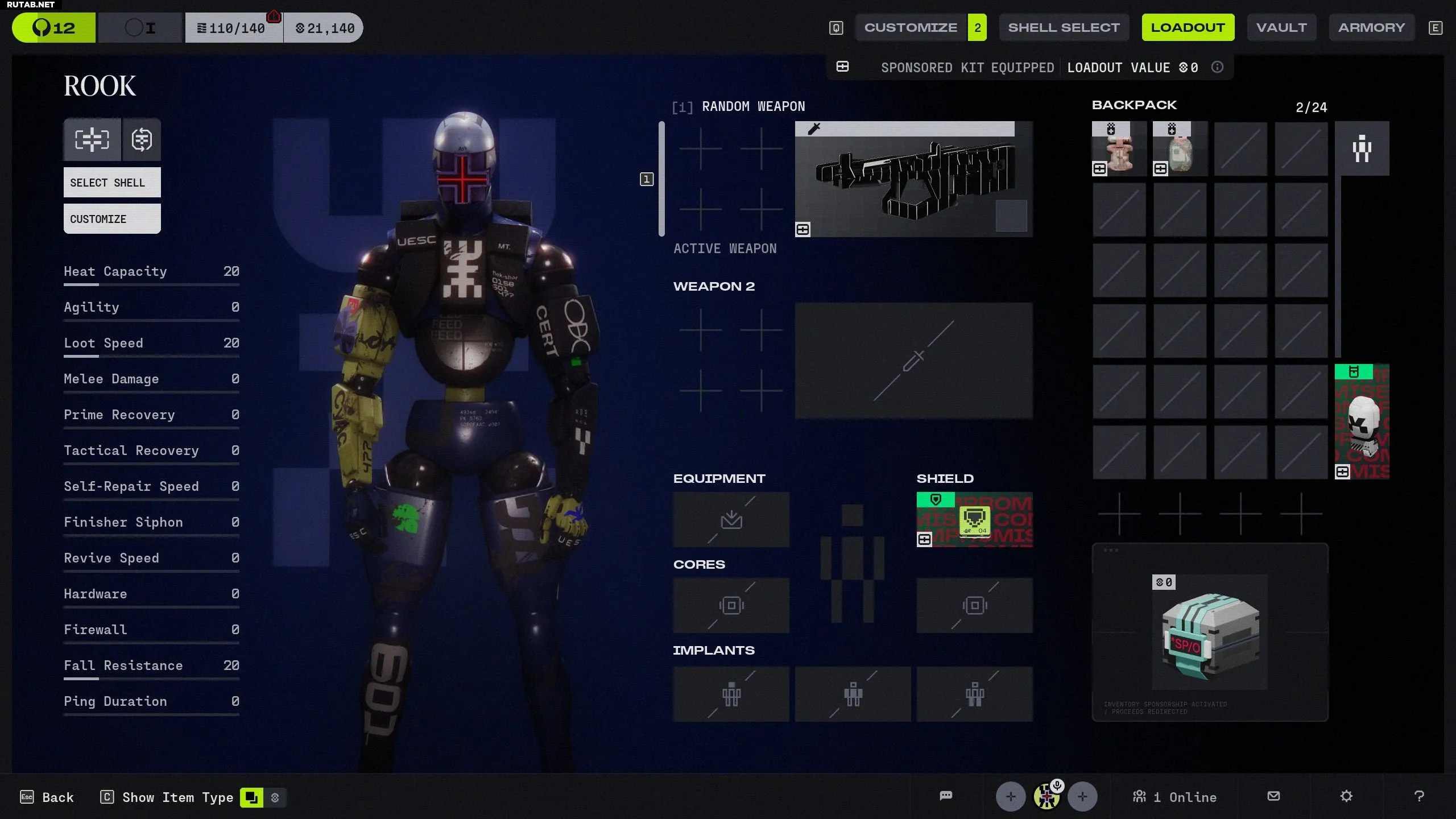 Хотя Rook не может взять с собой ничего (кроме предустановленного снаряжения), все добытые предметы вернутся с ним после успешного выхода. У него также есть те же слоты для аугментаций, что и у обычных оболочек, а это значит, что любые найденные импланты или ядра можно сразу же экипировать во время вылазки. Кроме того, Rook начинает с рюкзаком, что увеличивает его грузоподъёмность во время рейда.