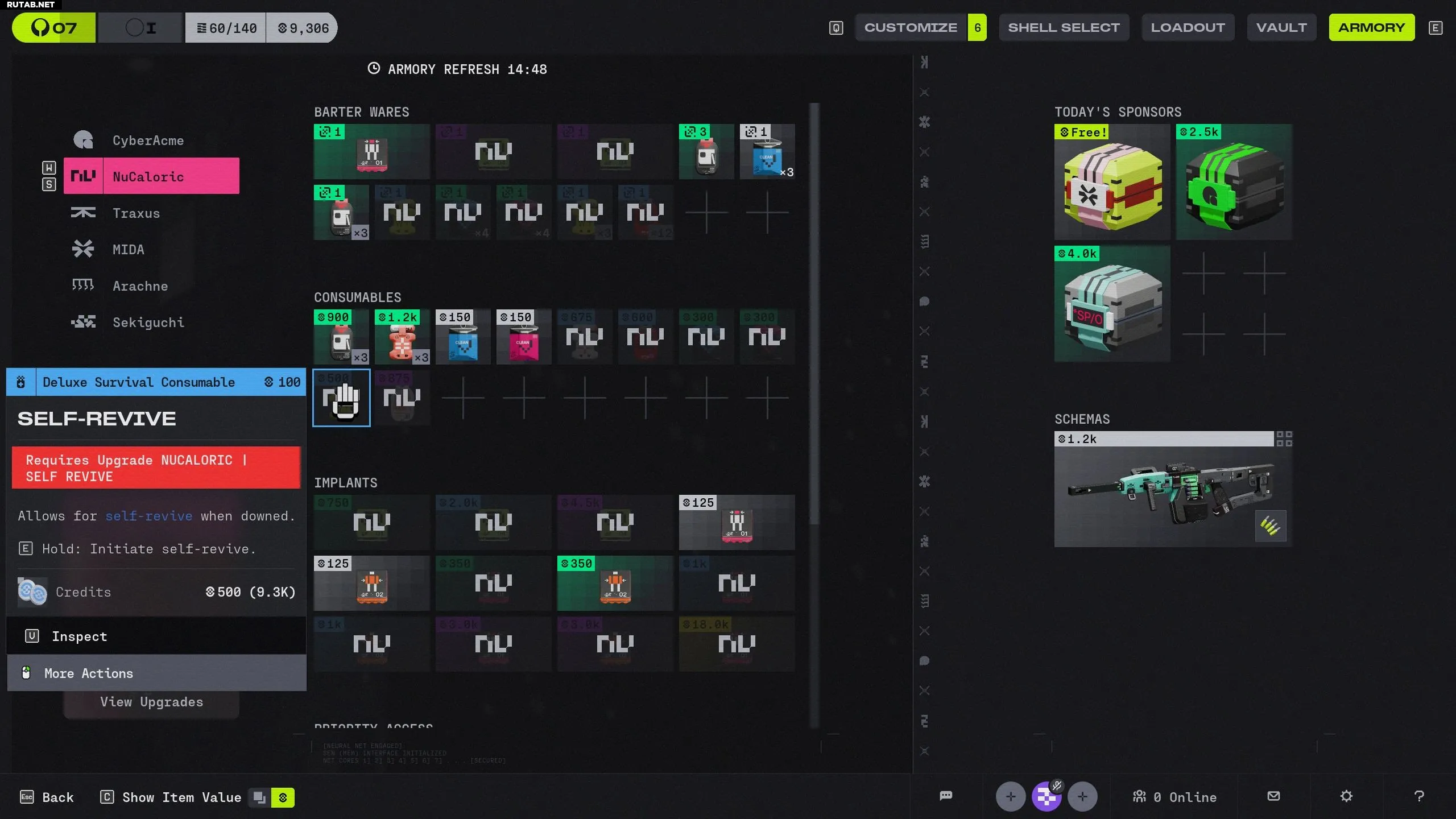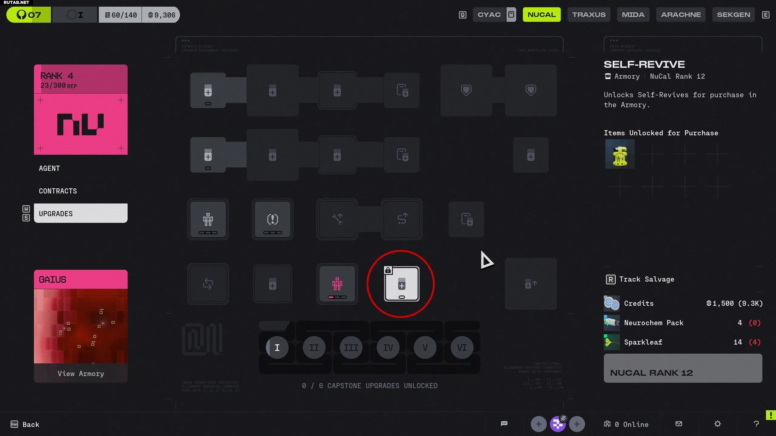 Второй способ — просто купить наборы в Оружейной. Для этого сначала нужно выполнить приоритетный контракт «Знакомство с NuCaloric» и открыть фракцию NuCal. Выполните несколько миссий с ними, чтобы повысить уровень фракции, пока не разблокируете предмет «Само-воскрешение» в их древе навыков.