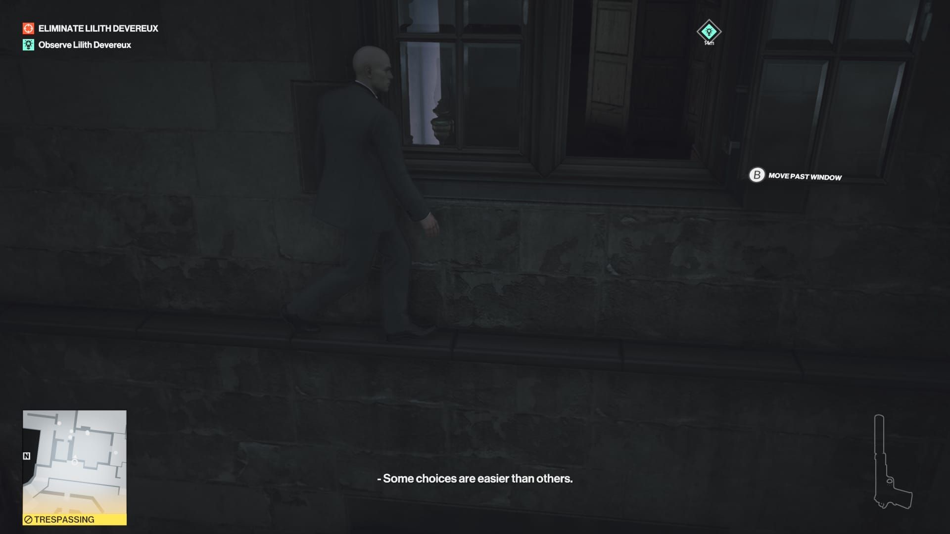 Бесшумно убить Лилит можно, спрятавшись на балконе комнаты Эммы и Грегори или в коридоре, ведущем к балкону с видом на зал с мероприятием. В комнате нужно сначала оглушить охранника на балконе и спрятать его тело в сундук. В коридоре — устранить патрулирующего охранника и спрятать тело в шкаф.
