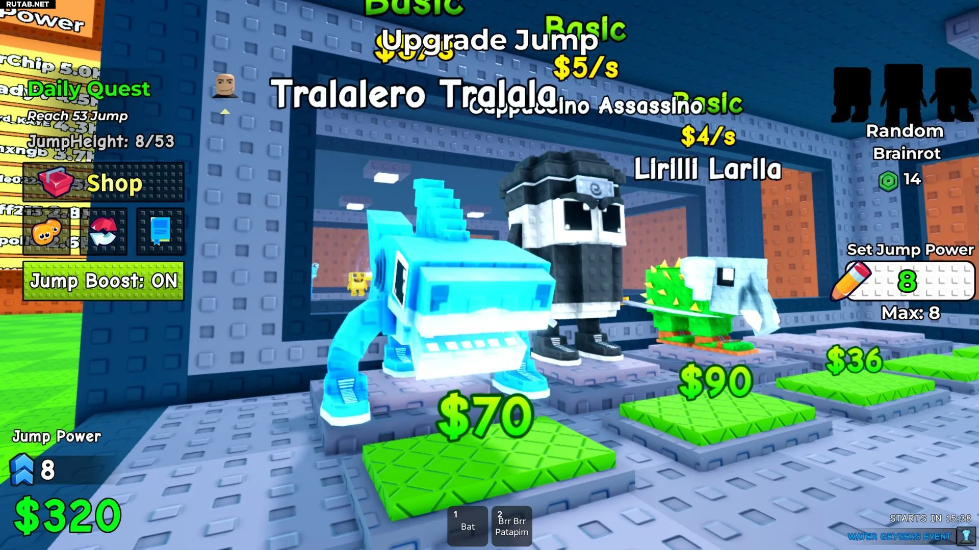 Jump for Brainrots — это увлекательная игра в жанре тайкун в Roblox, где ваша цель — прыгать по разноцветным платформам, чтобы захватывать персонажей Brainrot на всё более высоких этажах. Эти существа, такие как Tralalerotricia или редкие секретные виды, отправляются на вашу базу и приносят деньги каждую секунду. Полученную валюту можно тратить в магазине Одина на улучшение силы прыжка, чтобы избегать катящихся валунов и колючих брёвен и взбираться на эпические высоты за самыми ценными трофеями.