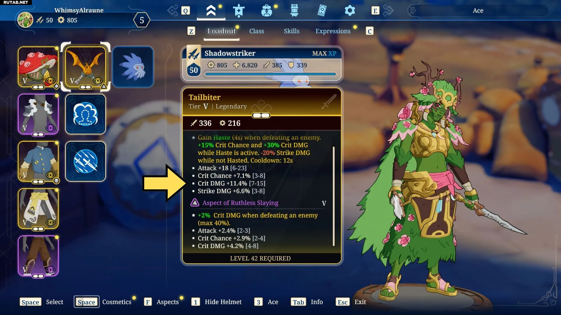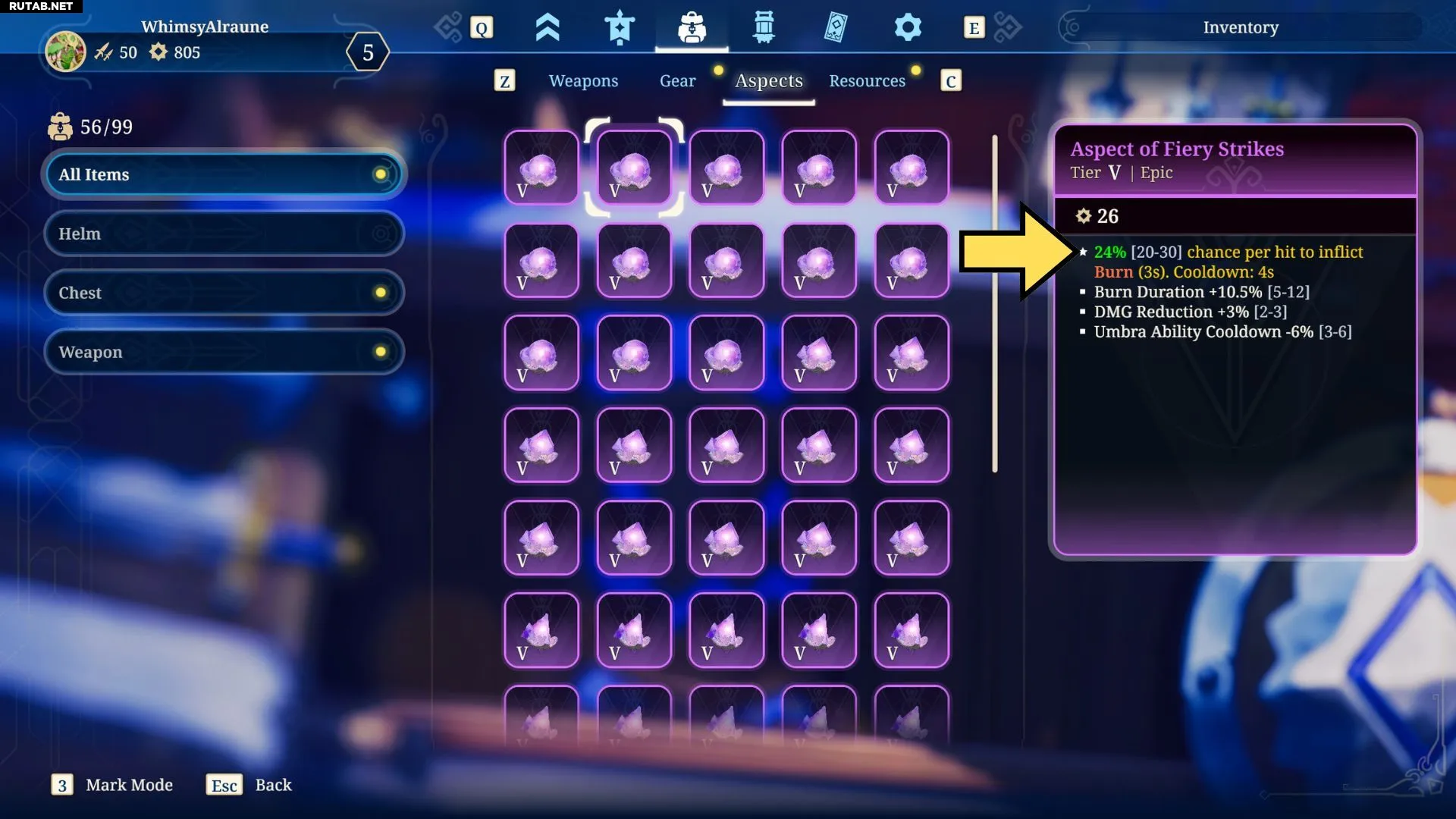 При выборе аспекта внимательно изучите время действия и проценты, указанные в его уникальном умении. Некоторые аспекты показывают количество секунд или процент эффективности, за которыми следуют две цифры в скобках, отображающие весь возможный диапазон значений. Выбирая между дубликатами одного аспекта, отдавайте предпочтение тому, который действует дольше или имеет максимально возможный процент.