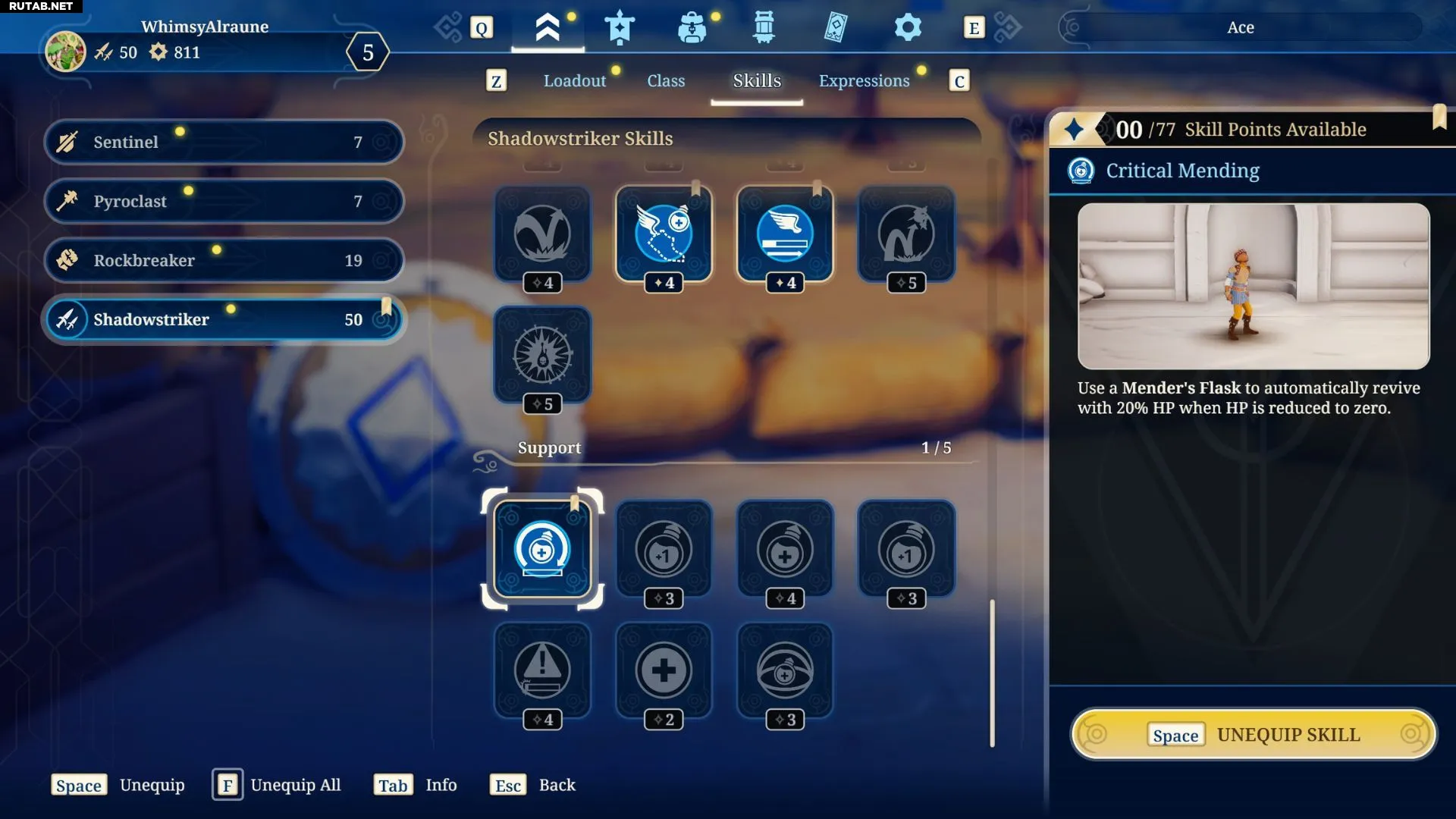 Фокус этой сборки на Скрытности значительно упрощает игрокам уклонение от вражеских атак. Поэтому единственным вспомогательным навыком, который использует сборка, является бесплатный навык Критическое исцеление. Если персонаж погибает, но у него остались заряды целительных фляг, этот навык воскресит его с 20% от максимального запаса здоровья.