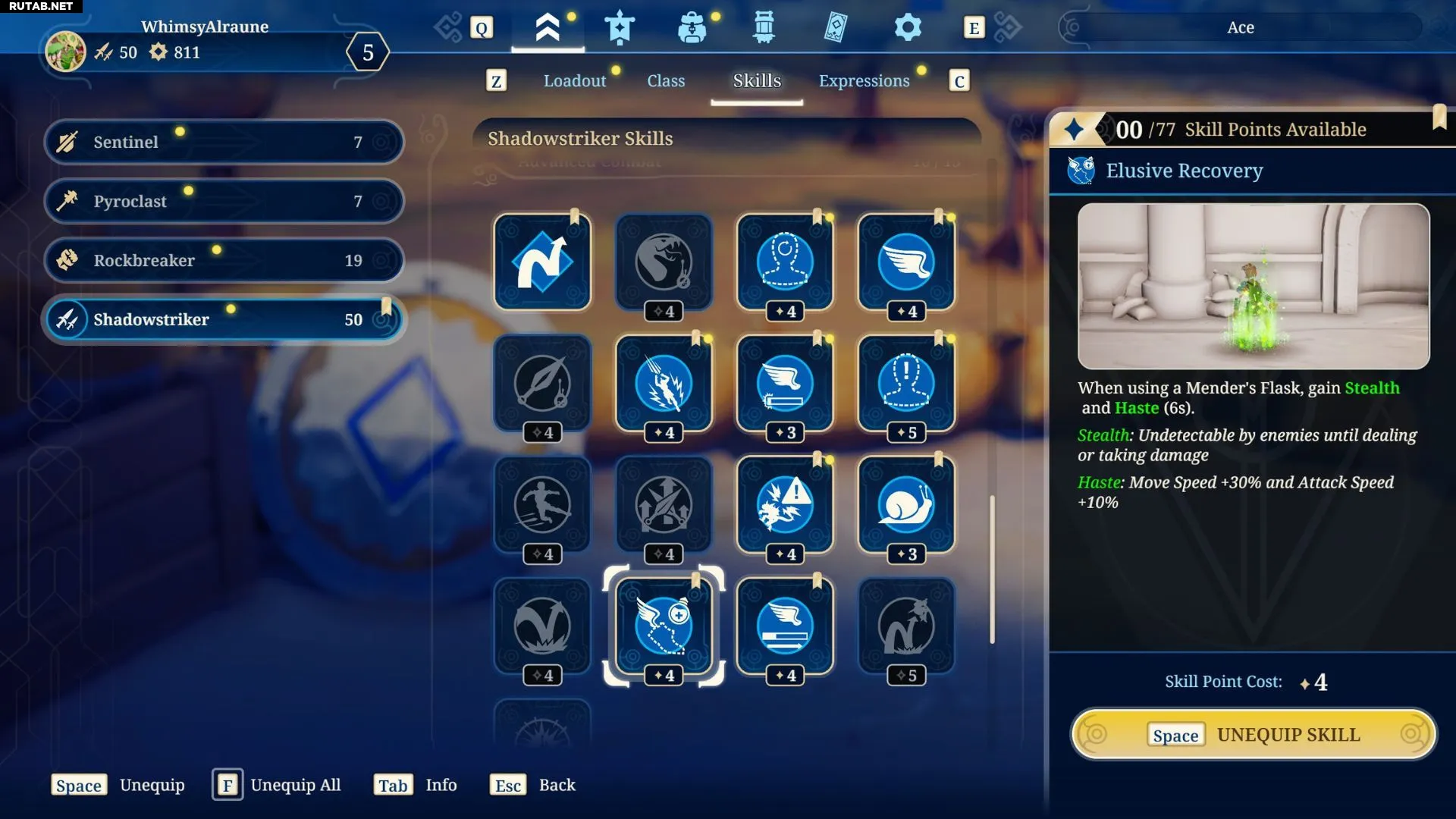 Наиболее рекомендуемые навыки — Покров Смерти и Ускользающее восстановление, которые дадут игрокам больше возможностей войти в режим Скрытности. Поскольку Ускользающее восстановление также даёт бафф Ускорение, навык Быстрая концентрация позволит вам чаще накапливать заряд навыков фокуса, а Прорыв темпа дополнительно усилит ваши комбо-атаки. Добавление в набор Быстрых шагов и Последнего рывка позволит вам получить ещё больше пользы от двух предыдущих навыков.