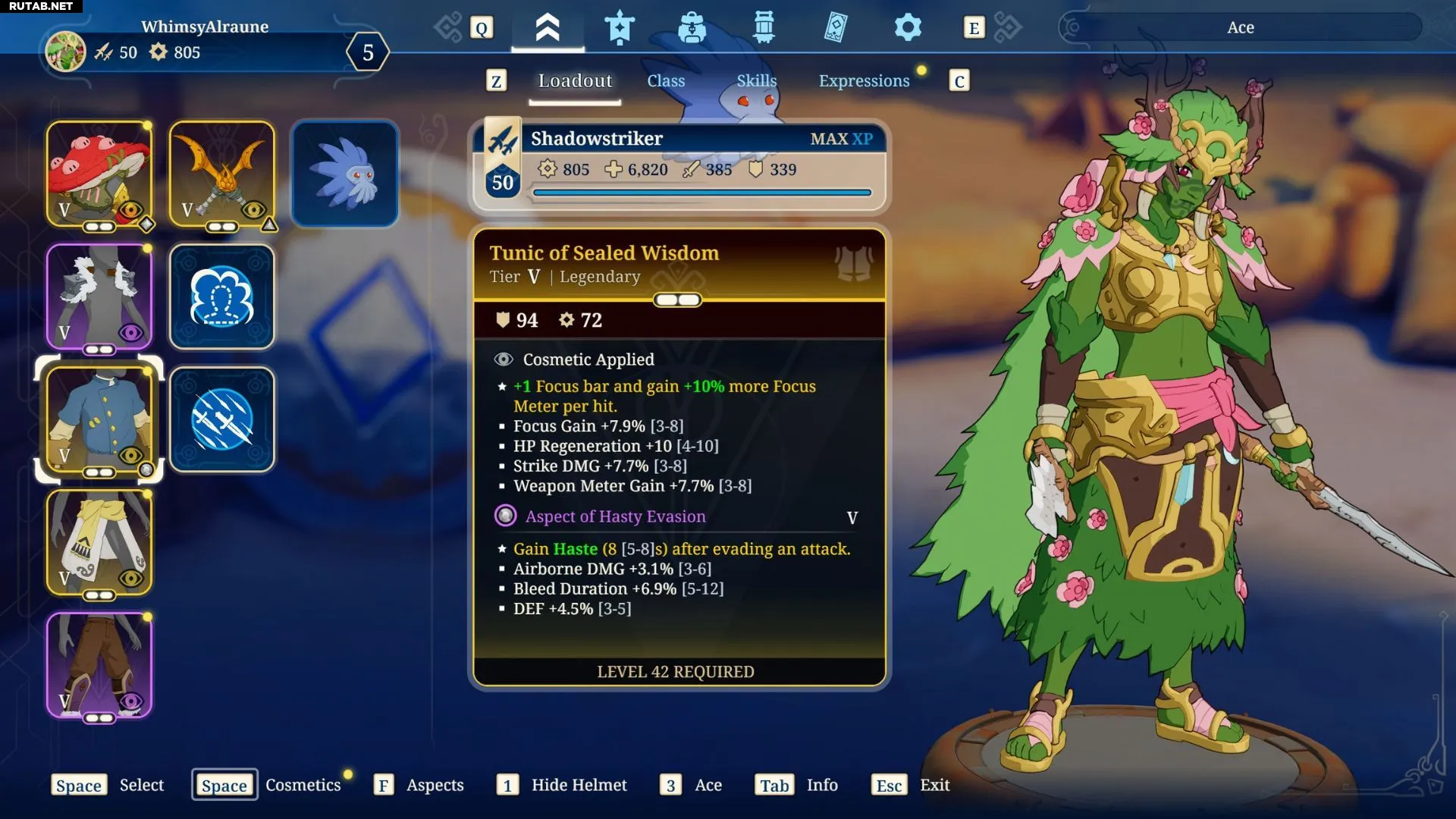 - Аспект Поспешного Уклонения (Нагрудник): Дарует эффект Ускорения на (5-8) секунд после уклонения от атаки.
