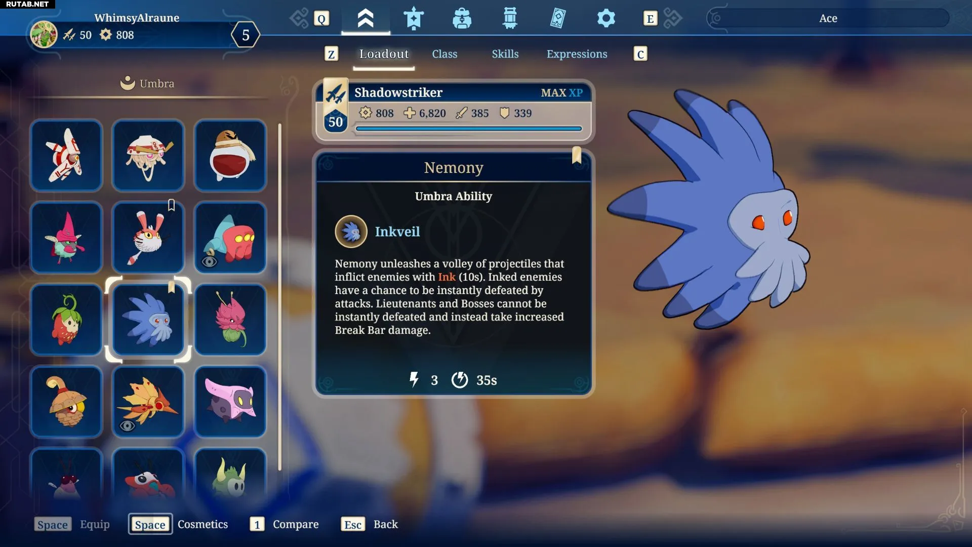 Первая Умбра, которая особенно хорошо сочетается с классом Теневого клинка — это Немони. Она выпускает снаряды, которые накладывают на врагов эффект Чернил. Обычные враги с этим эффектом имеют шанс быть мгновенно побеждёнными при атаке, в то время как лейтенанты и боссы получают дополнительный урон по шкале блока. Эта способность полезна как для борьбы с толпой врагов, так и для быстрого оглушения боссов.