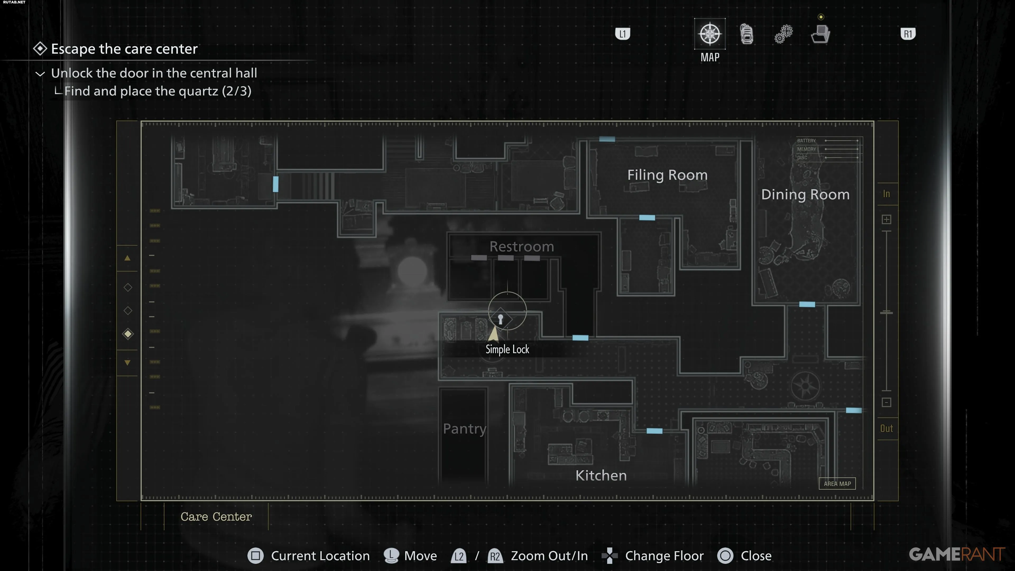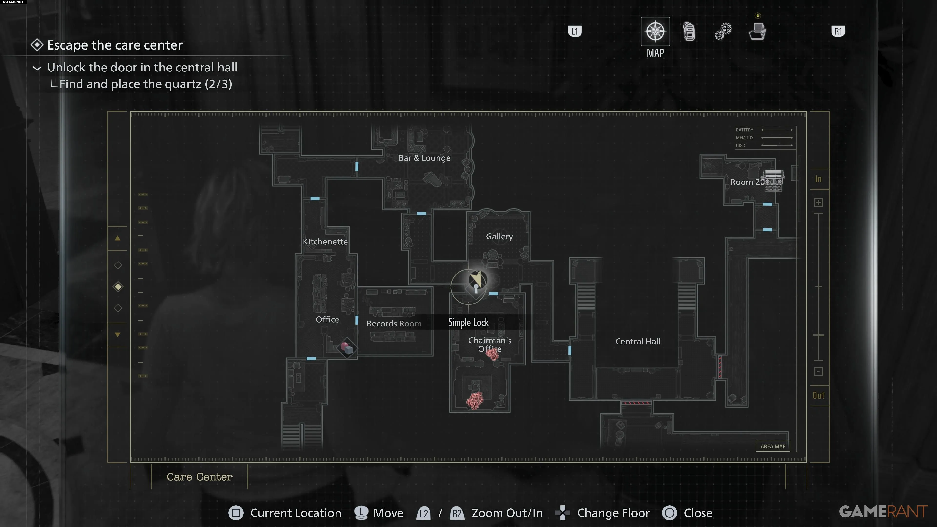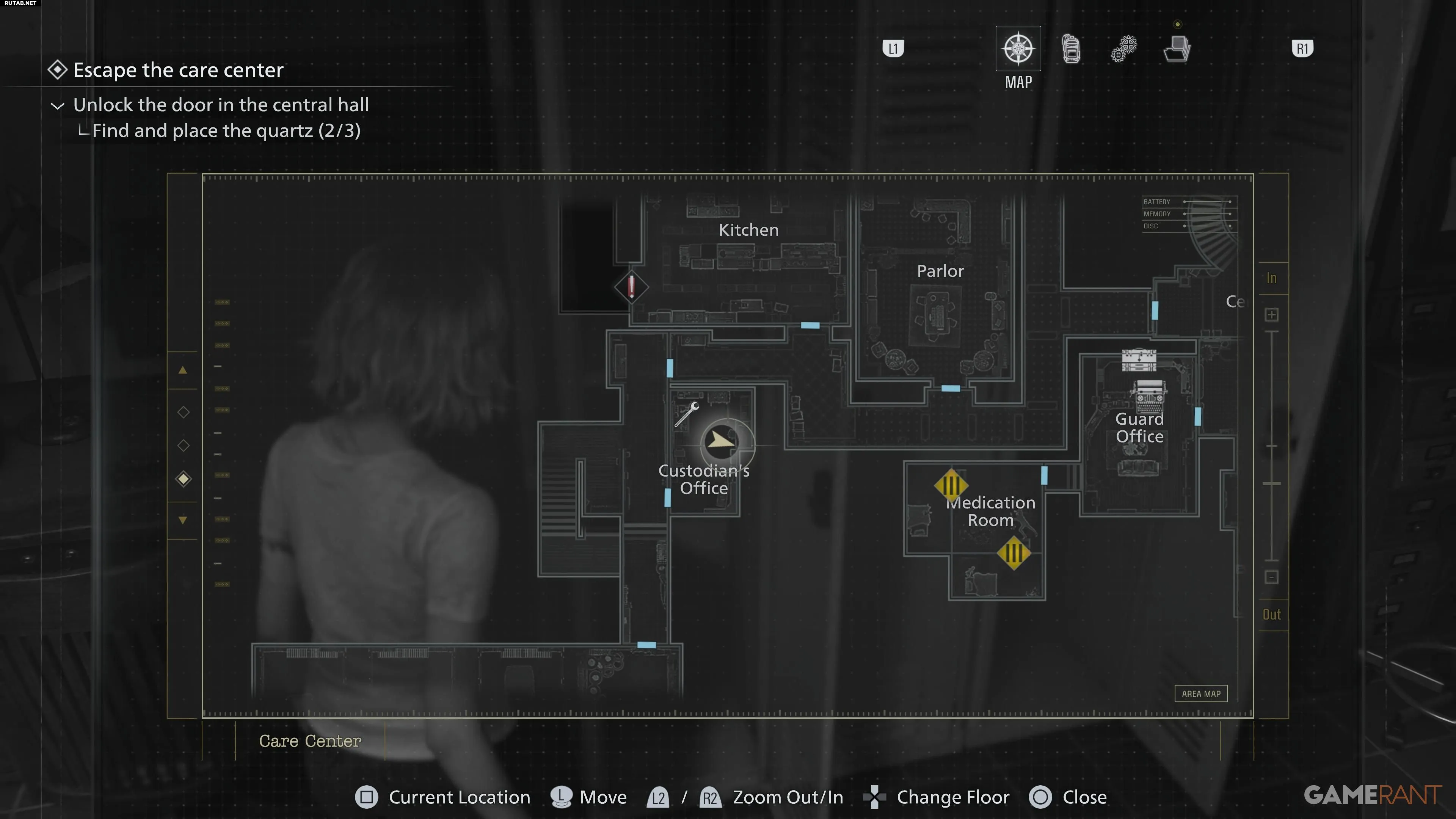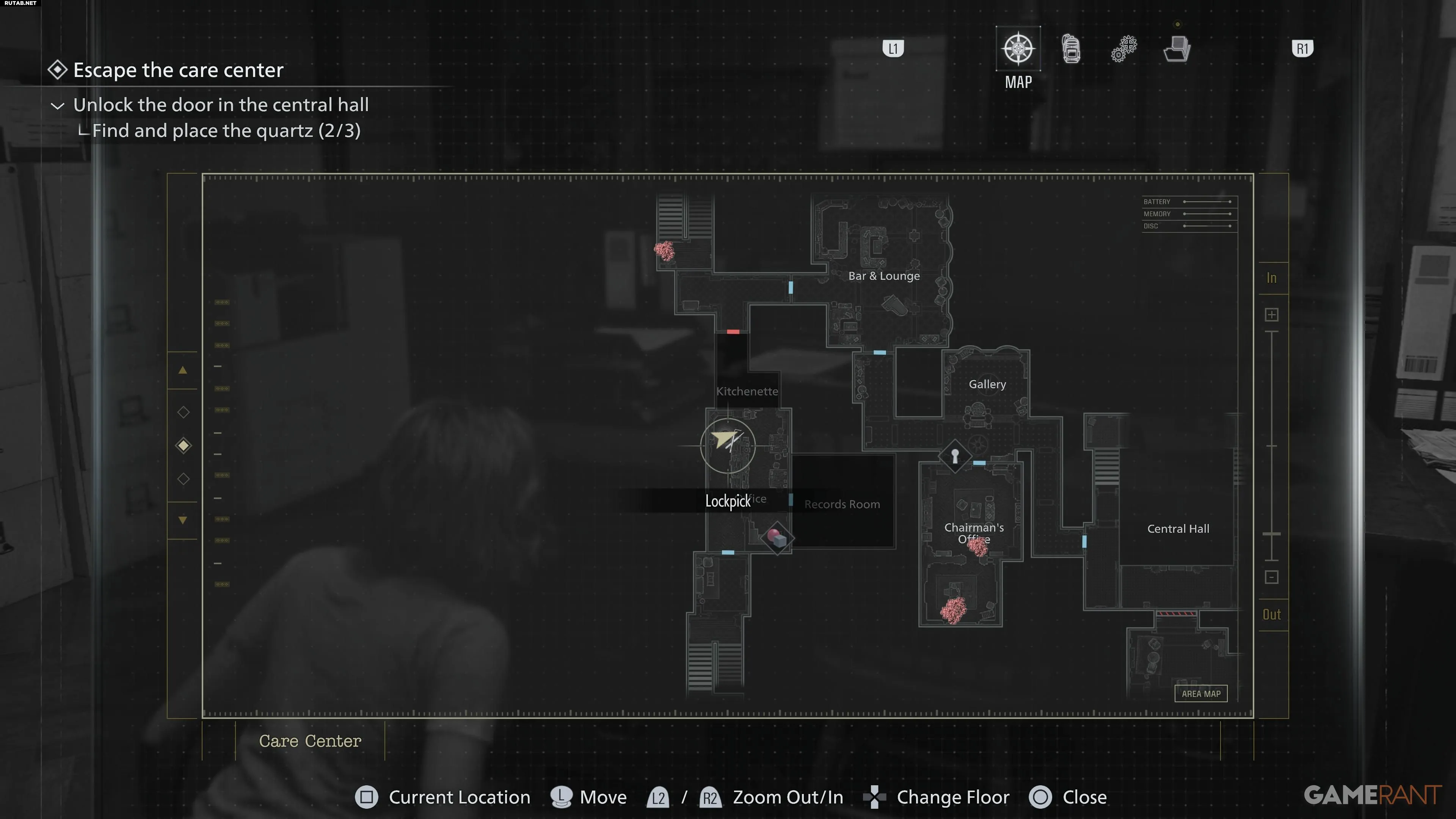 После получения браслета с пропуском 1-го уровня отправляйтесь к западу от Парадной. Там вы найдете запертую дверь, которую теперь можно открыть с помощью браслета. Пройдите по коридору за ней. Слева вы увидите Custodian's Office. В этой комнате находятся печатная машинка для сохранения и ящик хранения. Внутри, в одном из шкафчиков, лежит вторая отмычка.Отмычка №3 — Офис