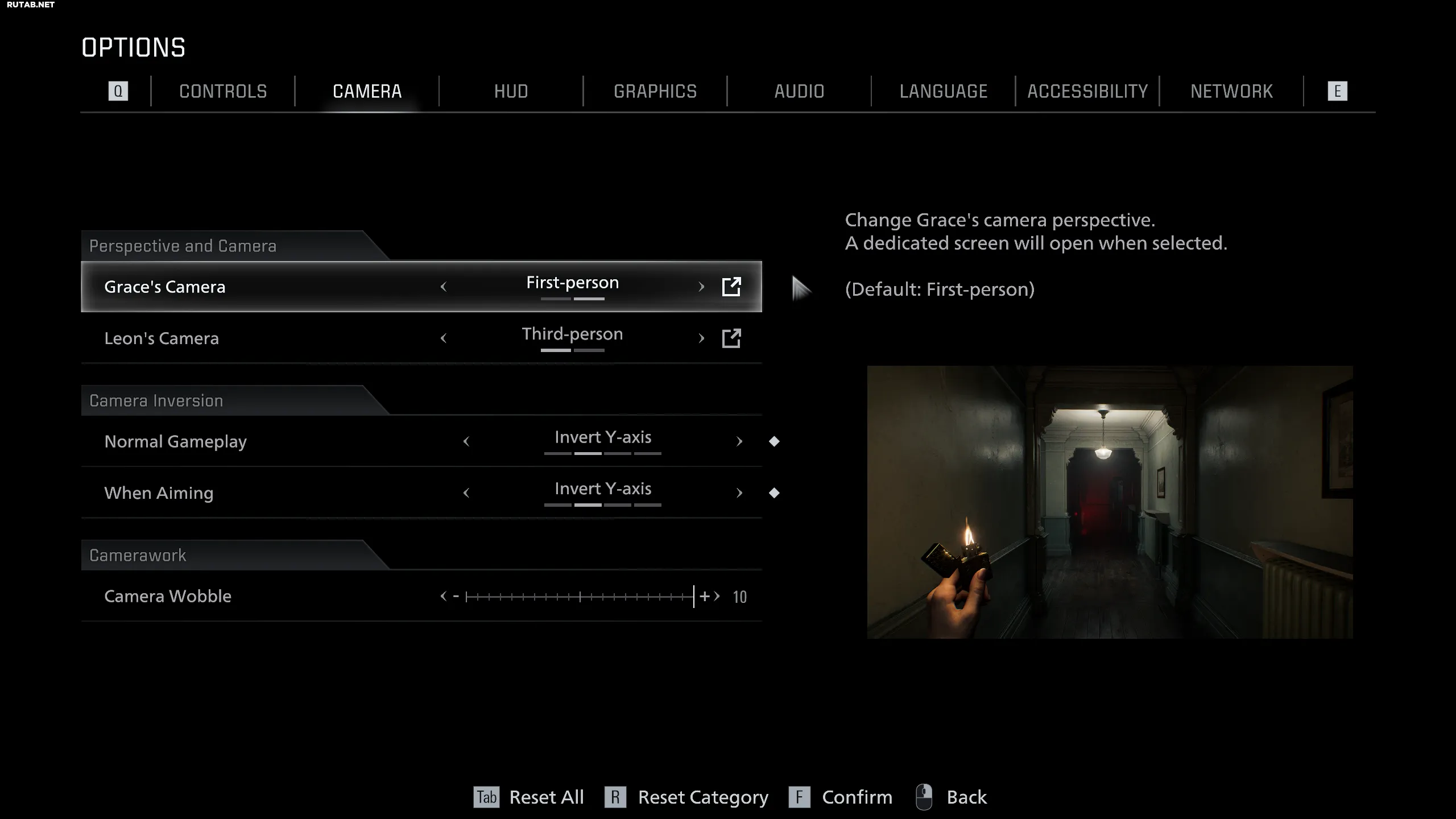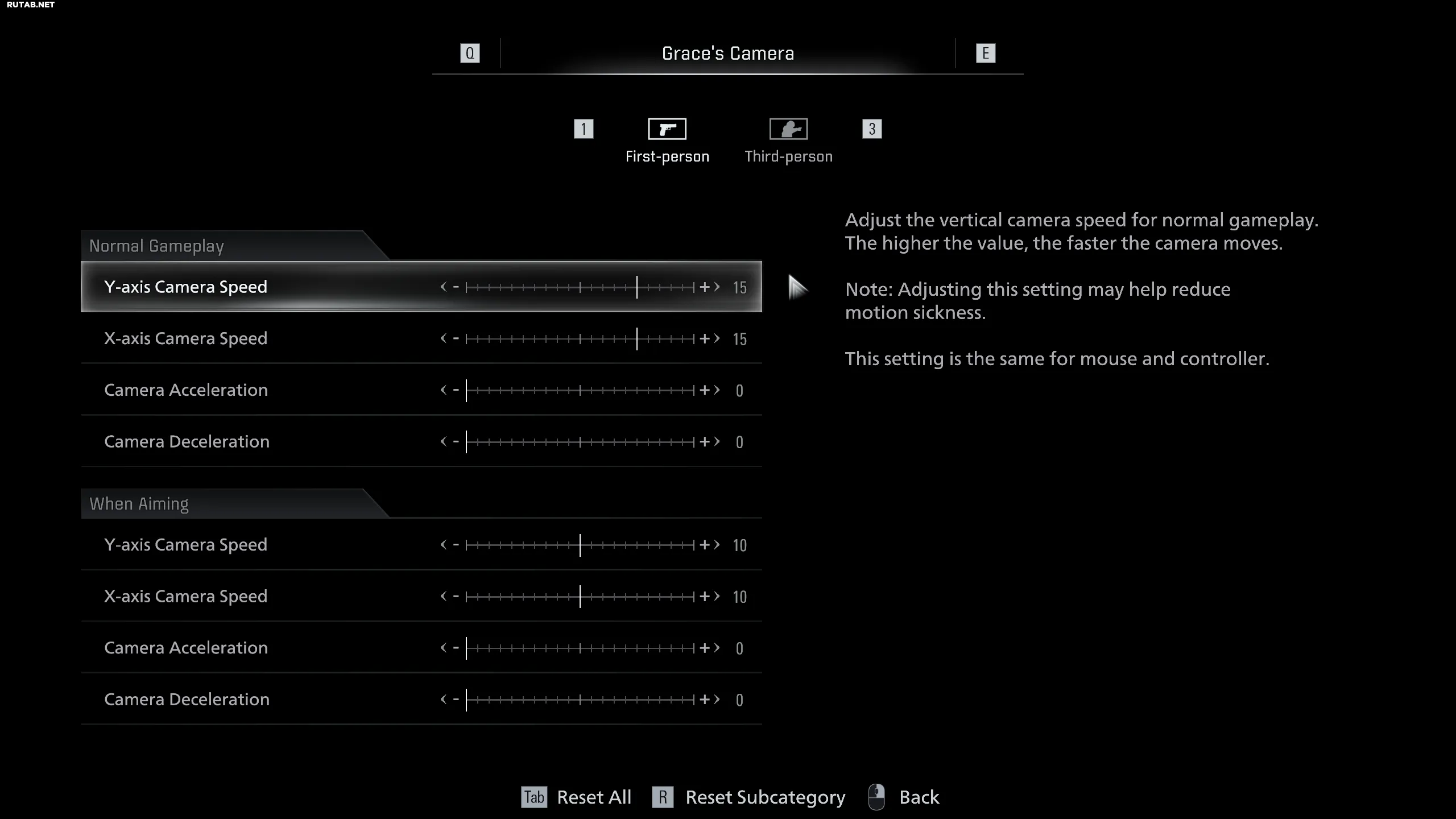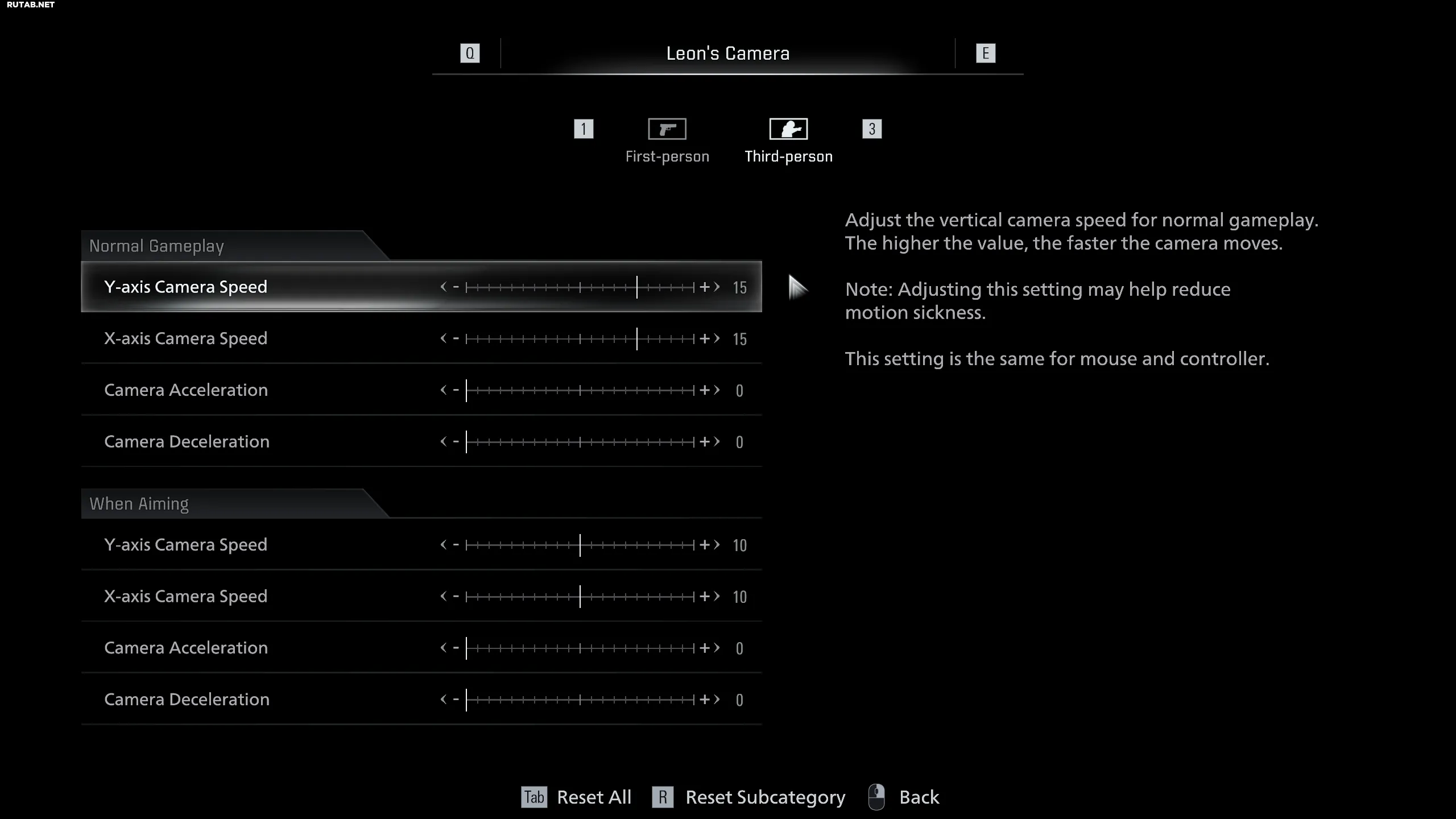 Настройки скорости и ускорения камеры доступны отдельно для камер Грейс и Леона, причём как от первого, так и от третьего лица. Всего получается четыре независимых комбинации, которые нужно настраивать индивидуально.