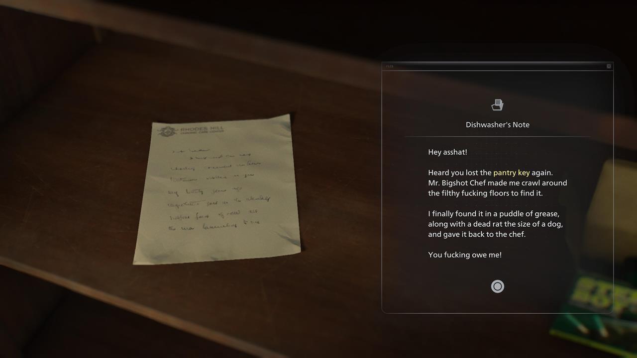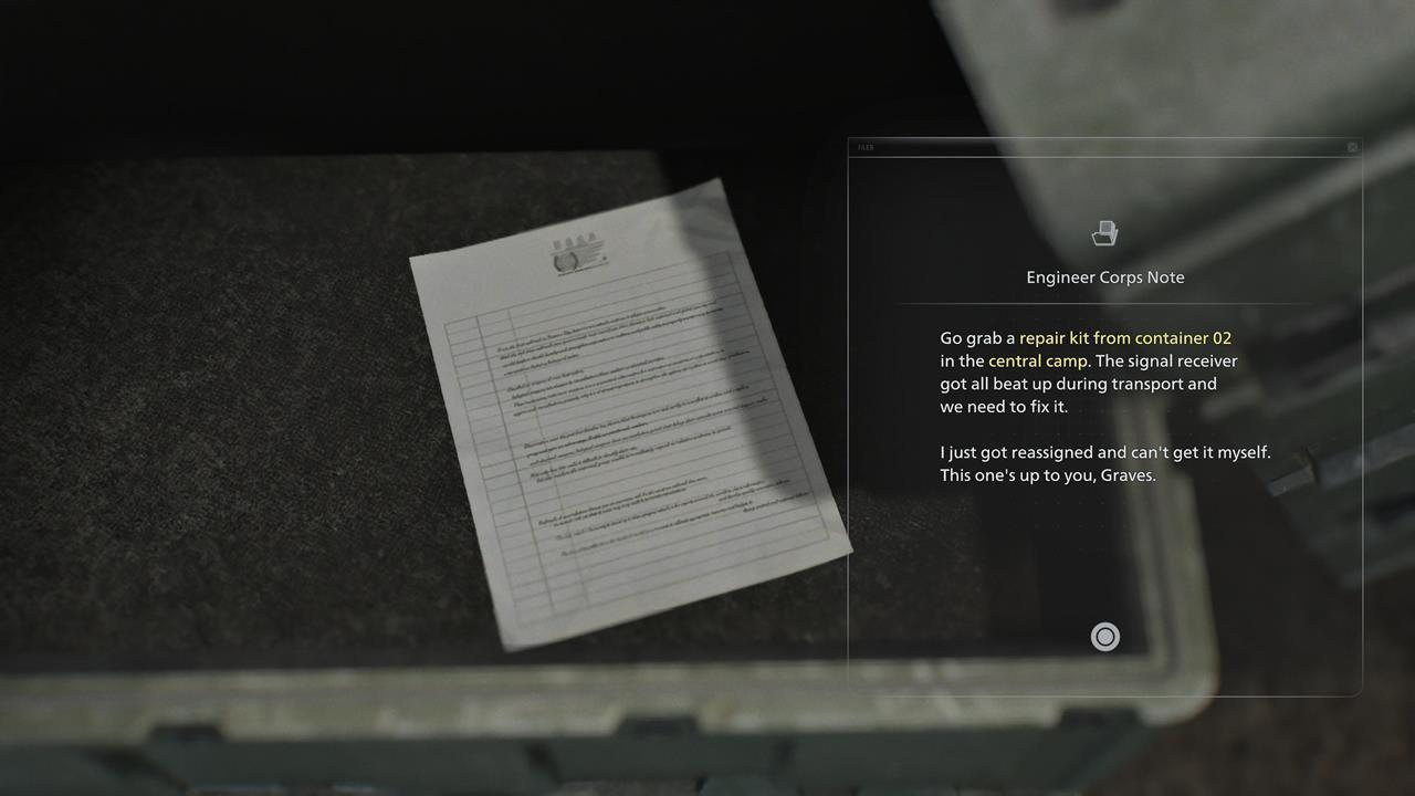 В водоочистной станции находится один файл, который трудно пропустить. Он лежит в том же помещении, где Грейс оставляет Эмили, чтобы разобраться с врагом. Документ находится на столе между пишущей машинкой (точкой сохранения) и ящиком для предметов.