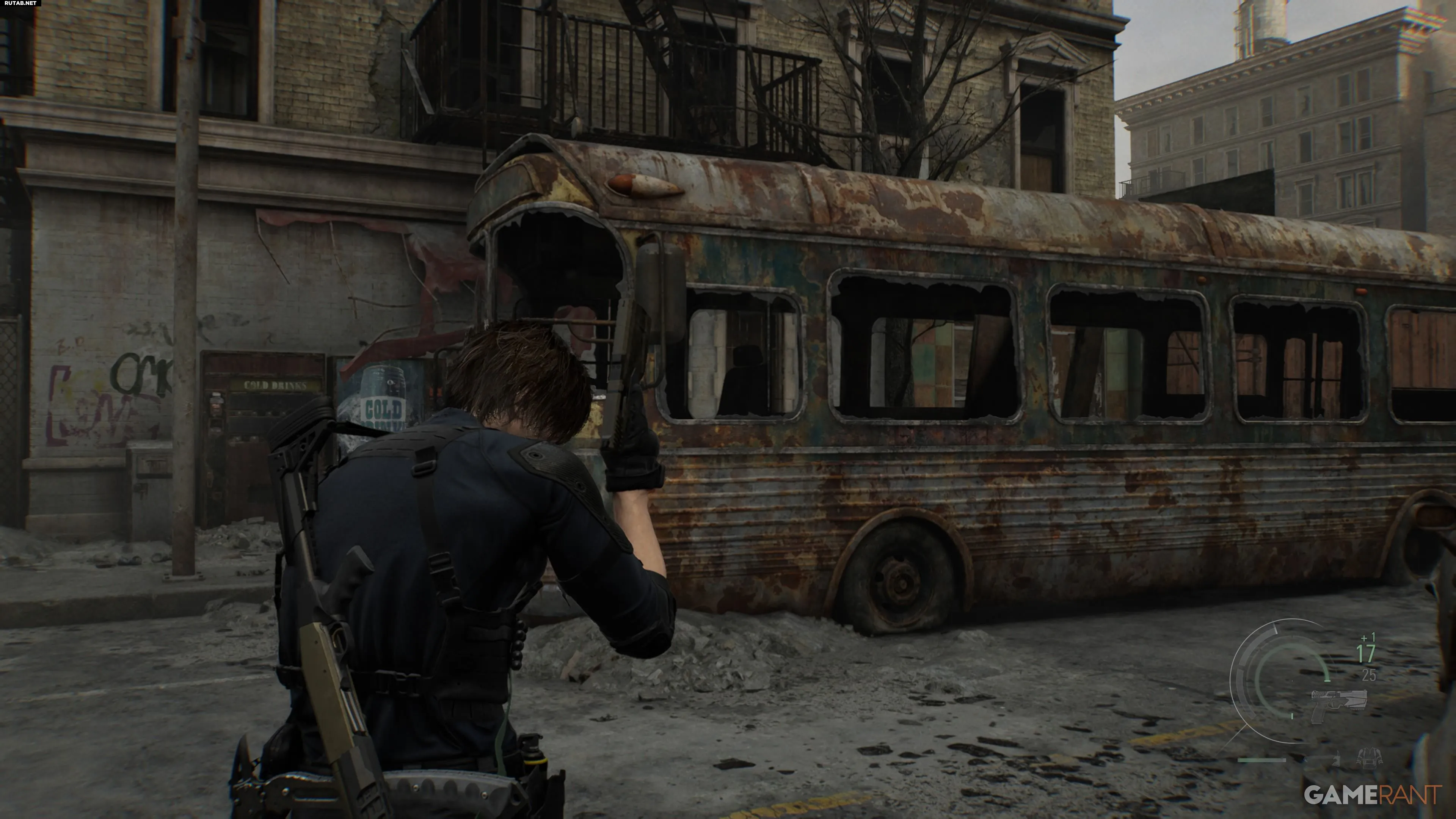 Выйдя из подземного паркинга, идите на север, где увидите заброшенный и проржавевший автобус.