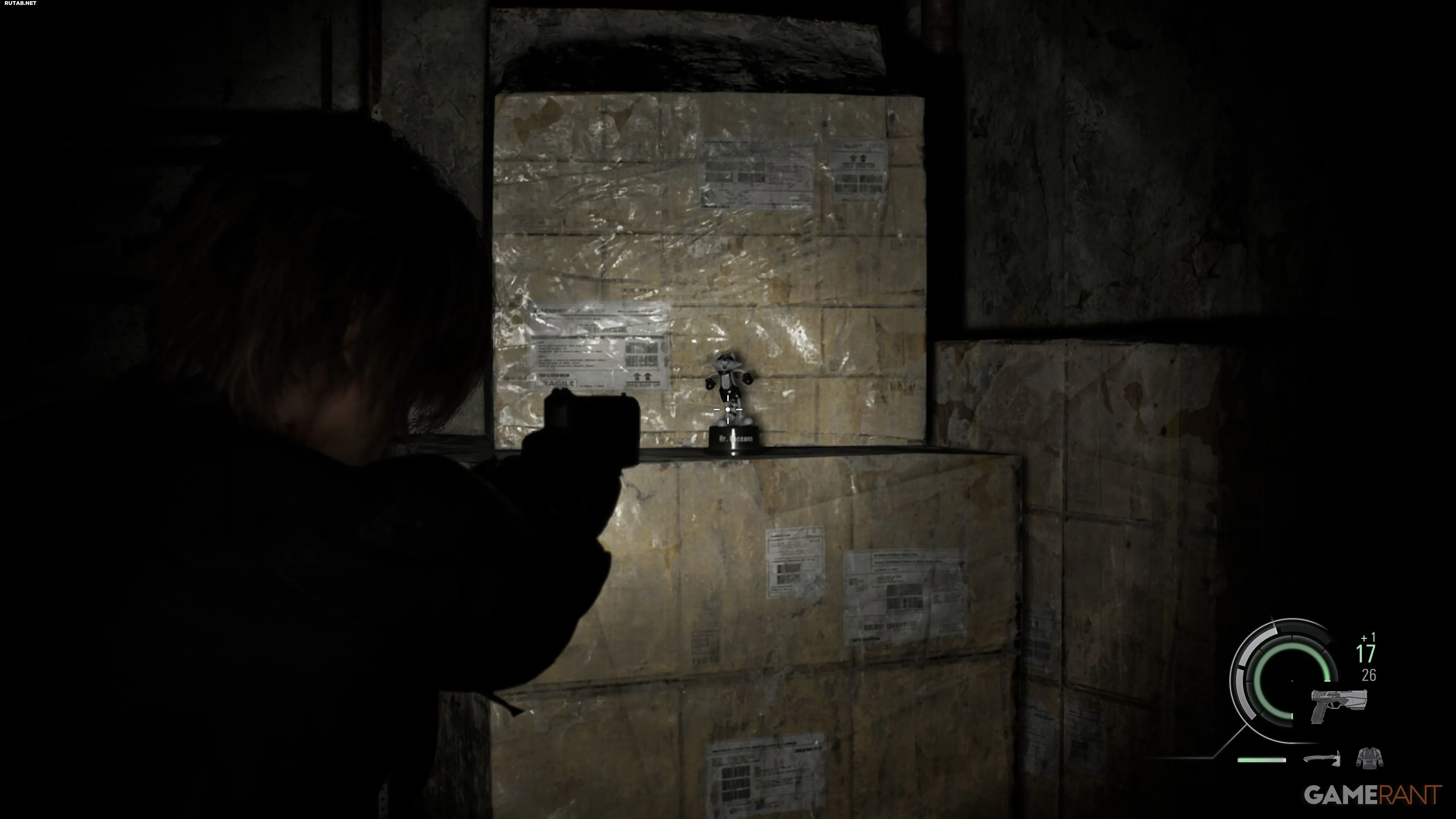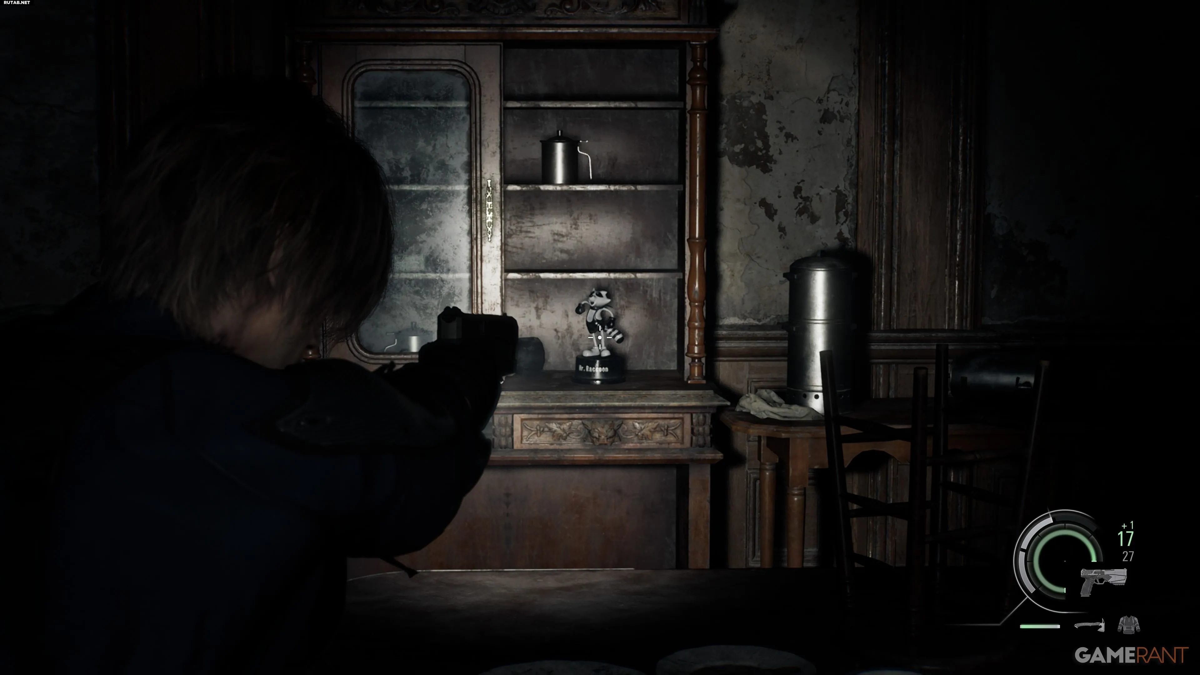 После выхода из здания полиции отправляйтесь на север, в оружейный магазин Кендо. После кат-сцены зайдите в переулок к востоку от магазина. Вы увидите рекламный щит «Амбреллы», а в окне слева от него находится 23-я и последняя фигурка Мистера Енота в Центре Раккун-Сити.