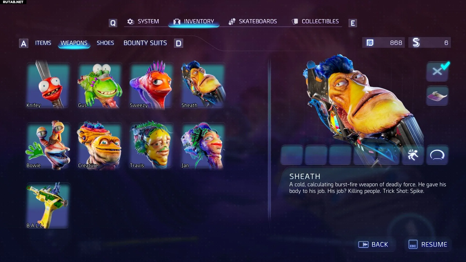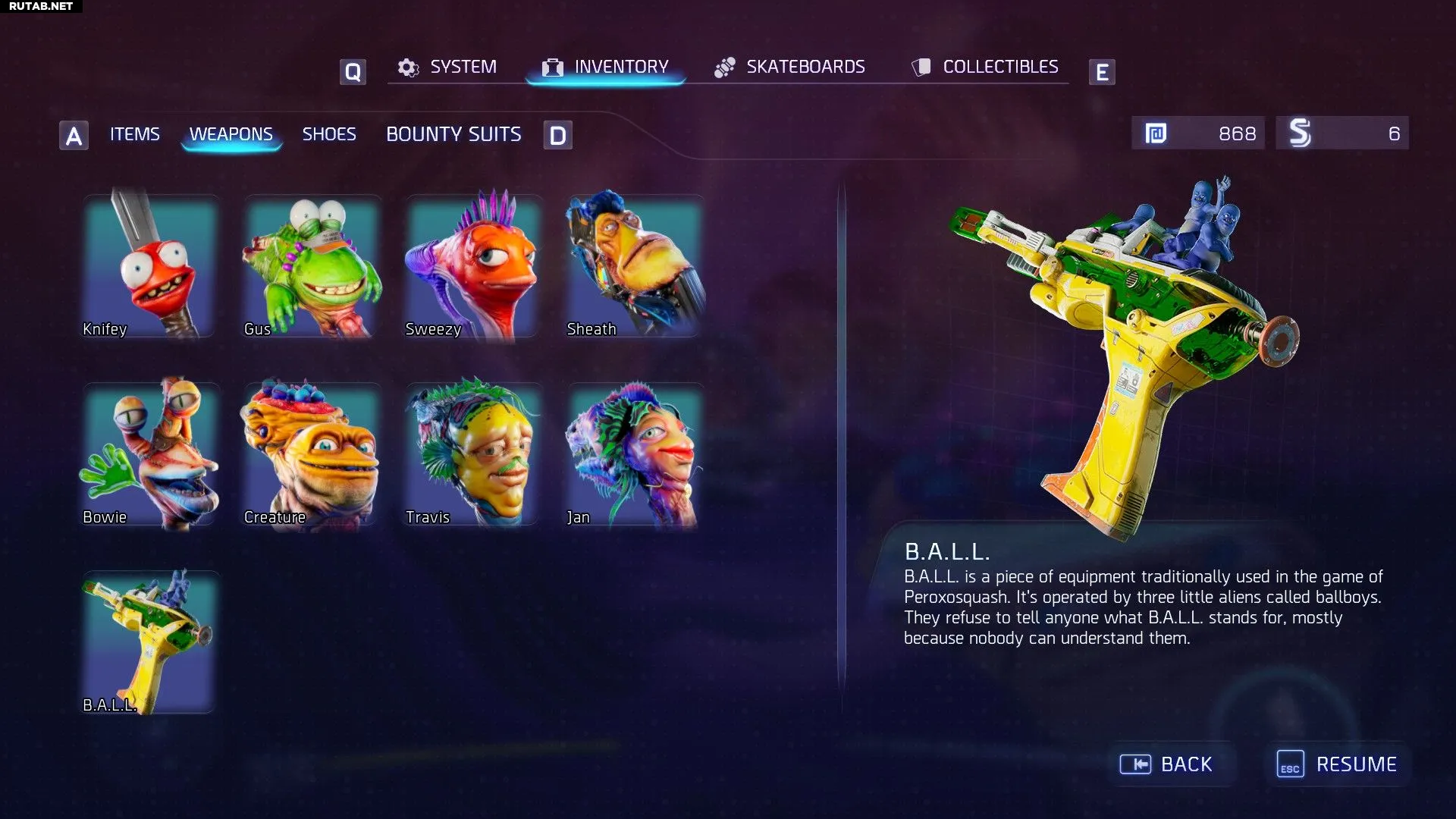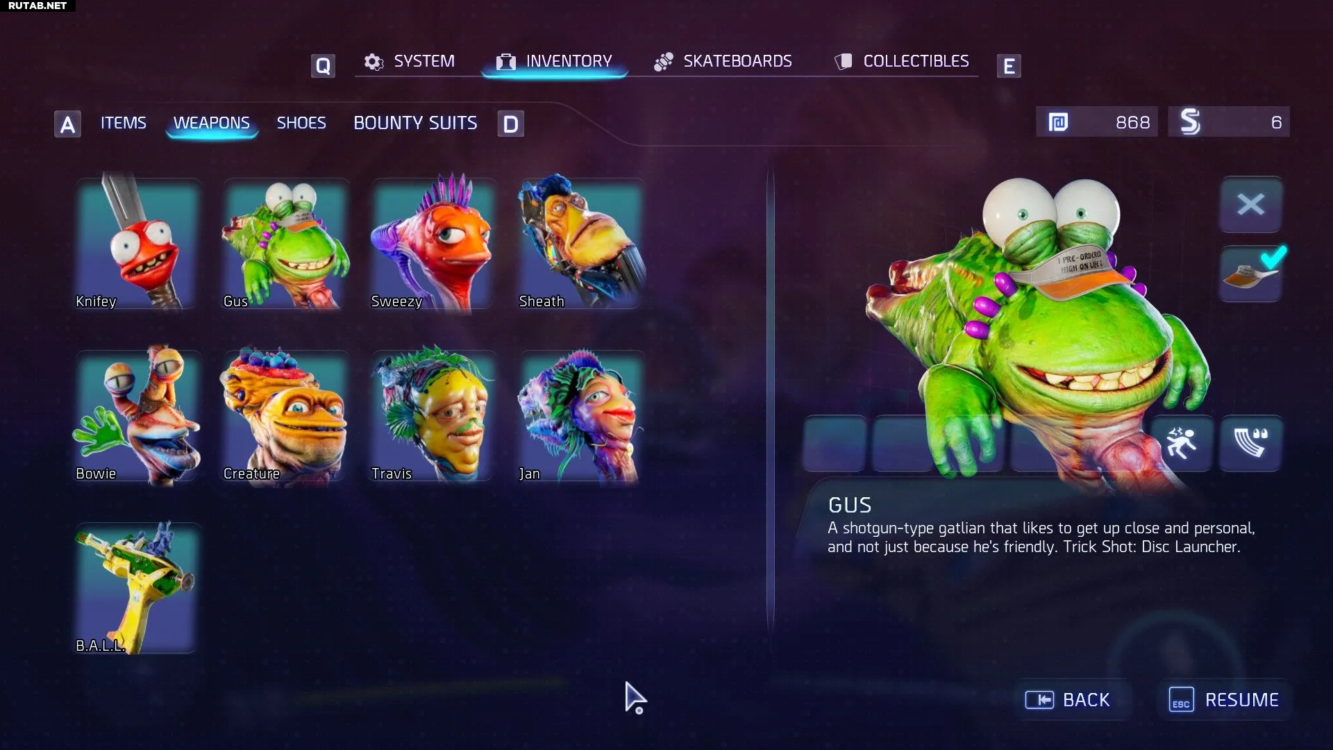 Кроме огнестрельного оружия, у вас есть и другие способы расправы с врагами: нож Найфи, которого вы получаете в первой миссии, и Джеппи, ваш сводный брат, которого вы получаете после выполнения задания «Ужин с мамой». Не все Гатлианцы — оружие: удочка, которую вы получаете, тоже является инопланетянином по имени Род.