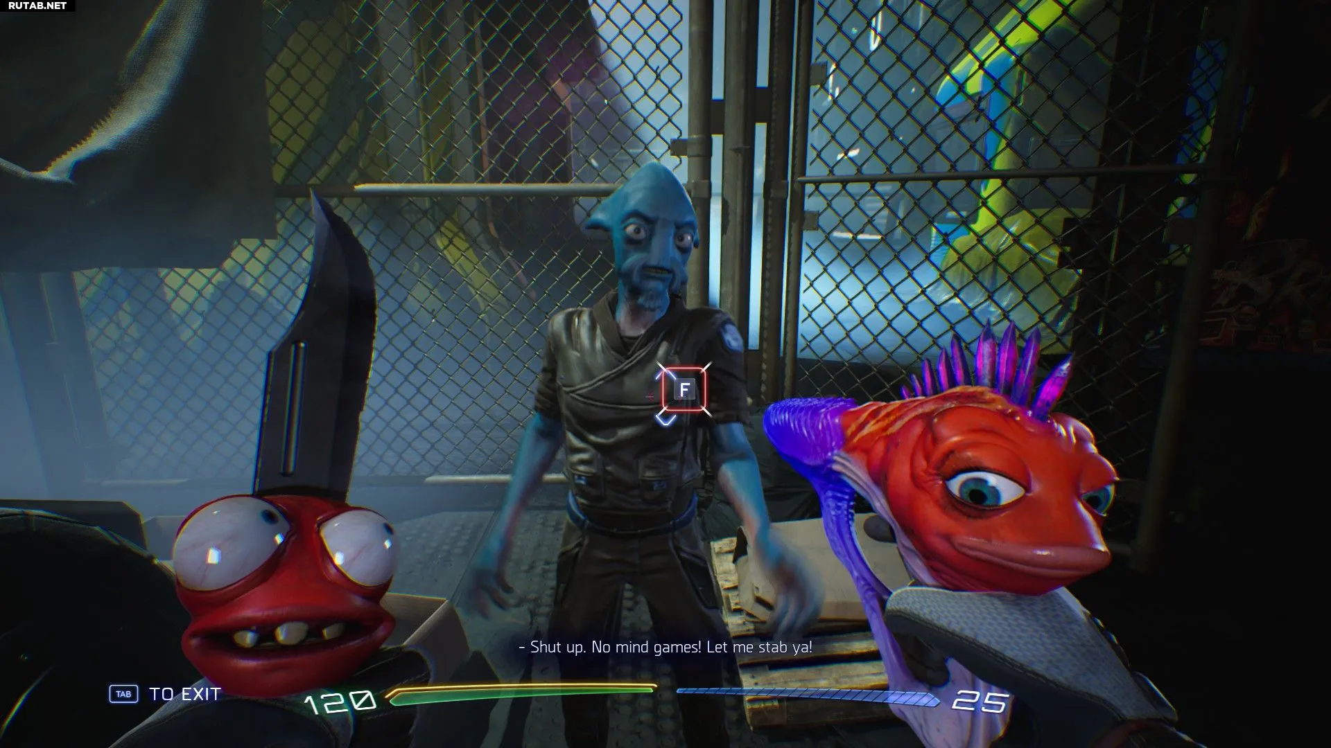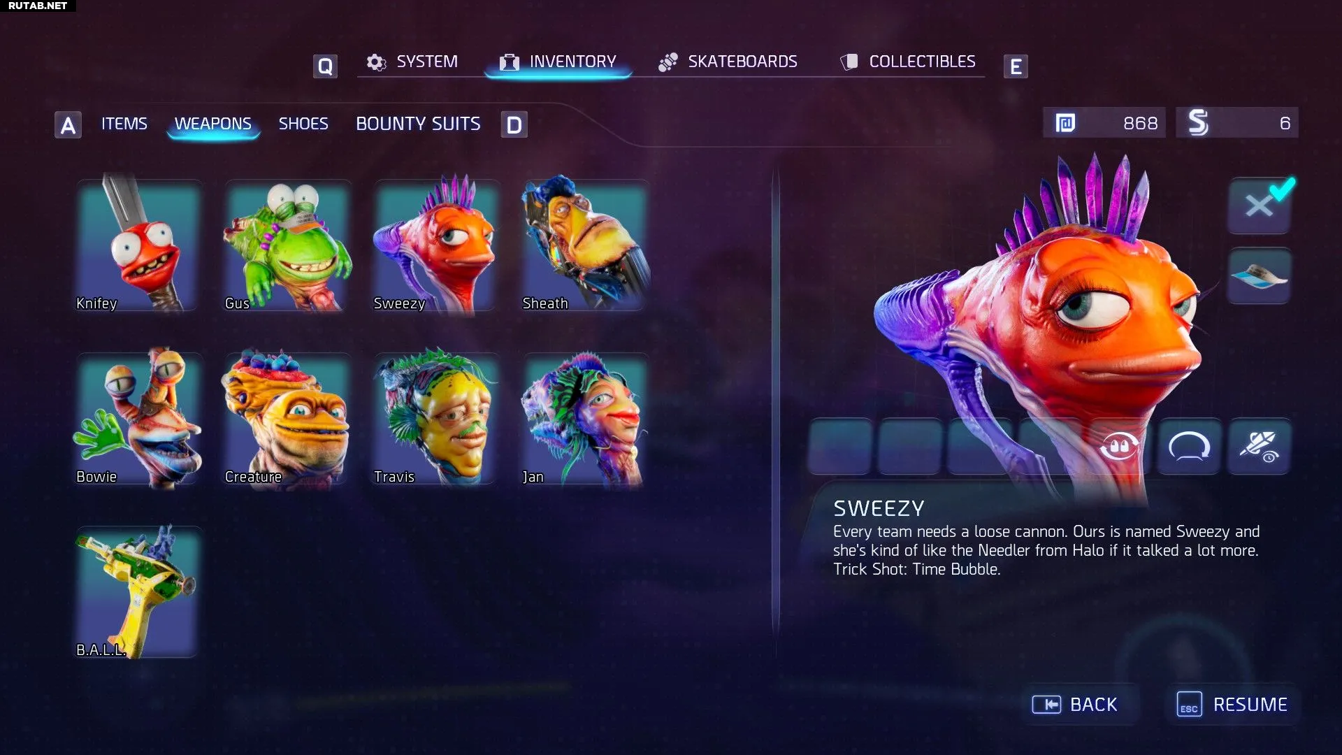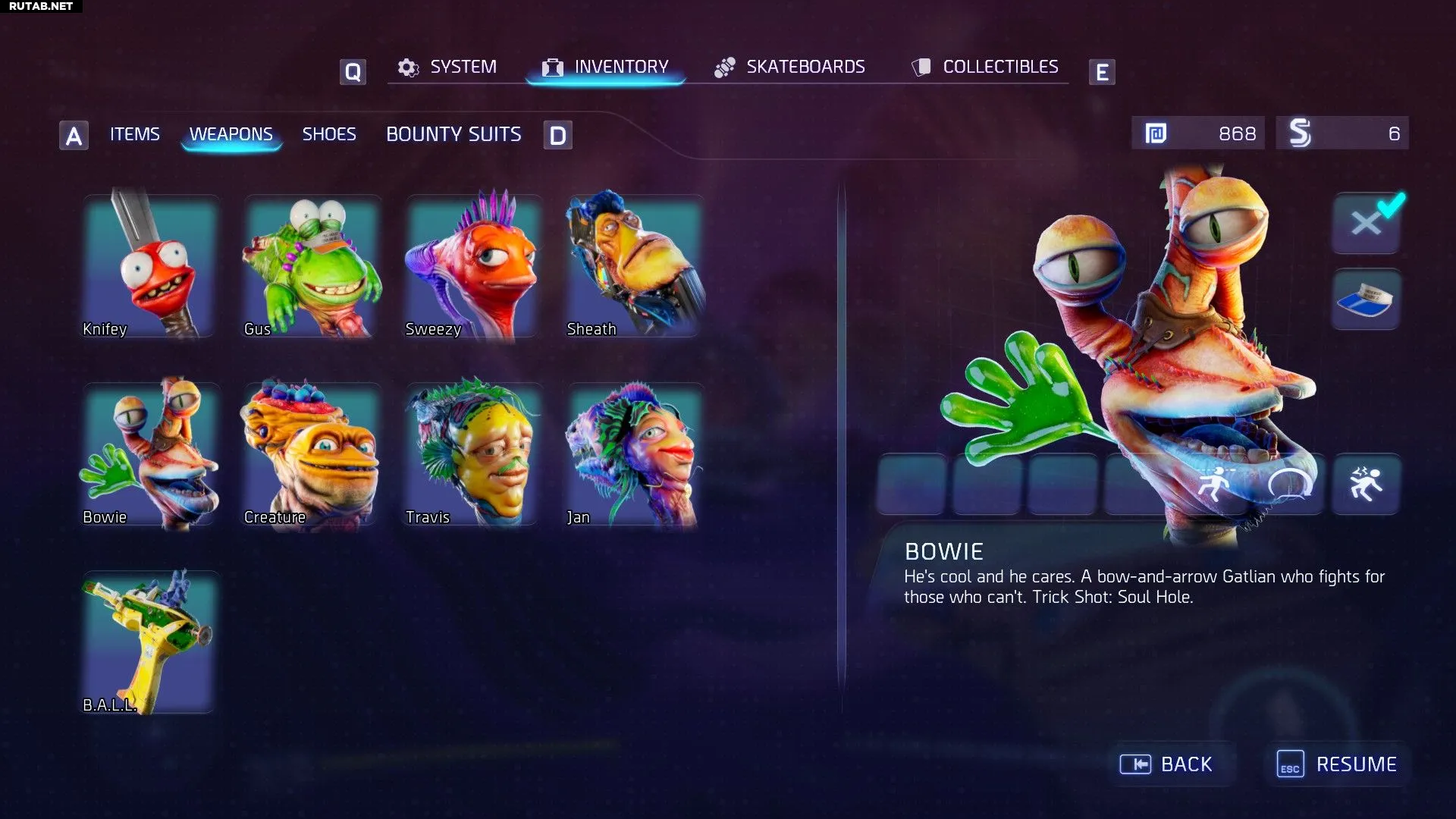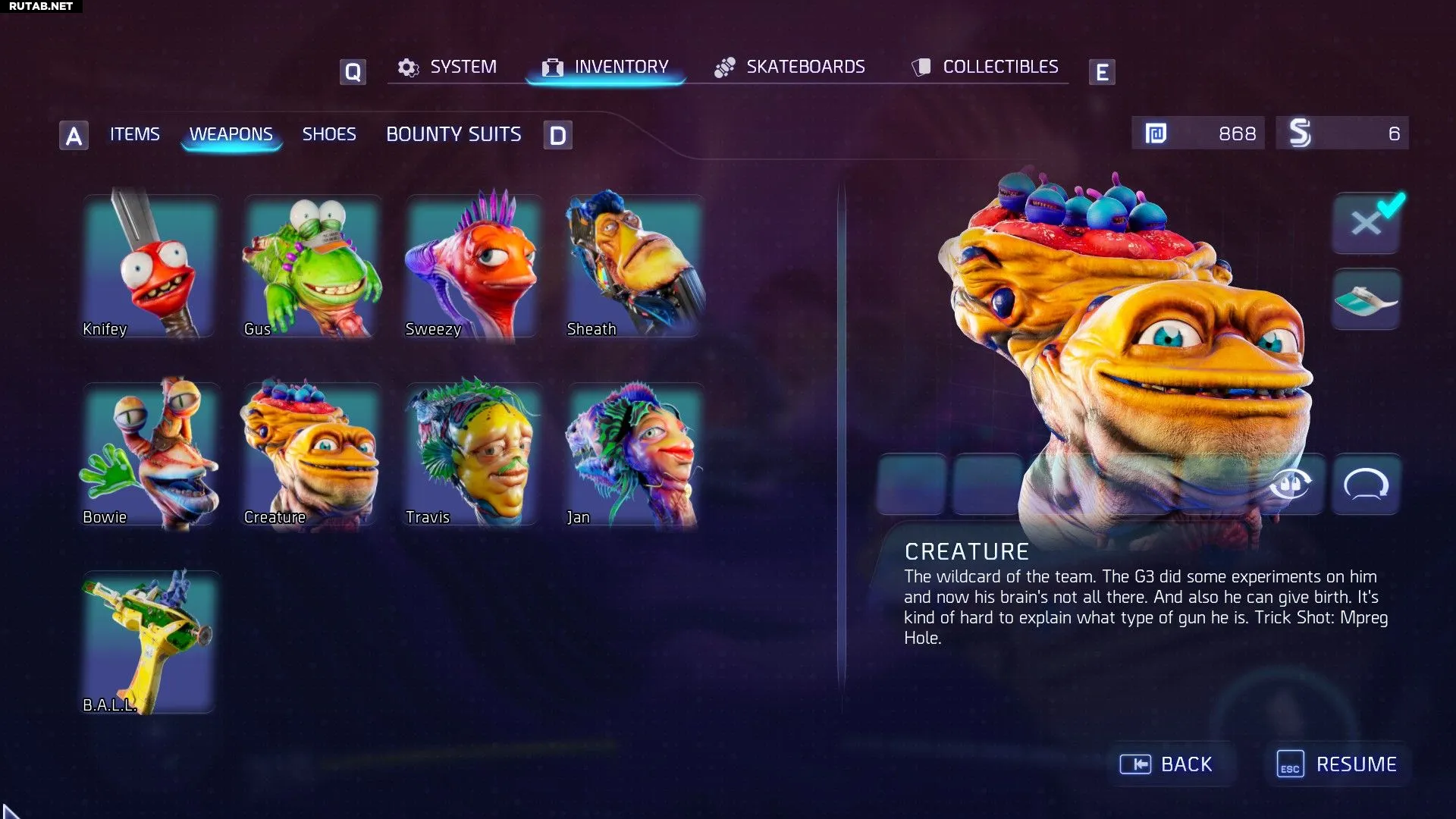 Кроме огнестрельного оружия, у вас есть и другие способы расправы с врагами: нож Найфи, которого вы получаете в первой миссии, и Джеппи, ваш сводный брат, которого вы получаете после выполнения задания «Ужин с мамой». Не все Гатлианцы — оружие: удочка, которую вы получаете, тоже является инопланетянином по имени Род.